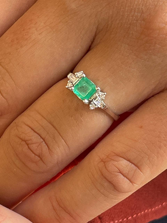 Anillo DORTMUND roseta esmeralda baguettes y brillantes en oro blanco 18 ktes.