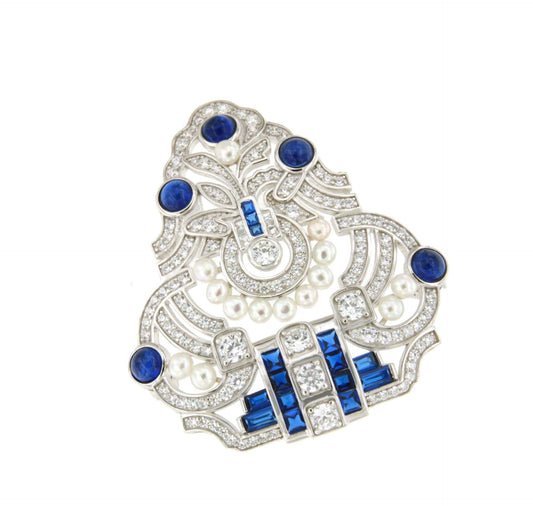 Broche GRECIA maravilloso de plata 925 ml con circonitas azules y perlas