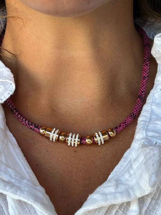 Steel and leather bracelet in burgundy color and cubic zirconia.