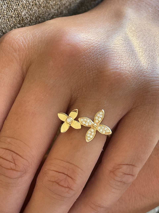 MANGABA solitaire rosette ring with diamonds in 18k yellow gold.