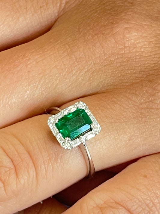 BETANZO ring with emeralds, baguettes and diamonds in 18k white gold