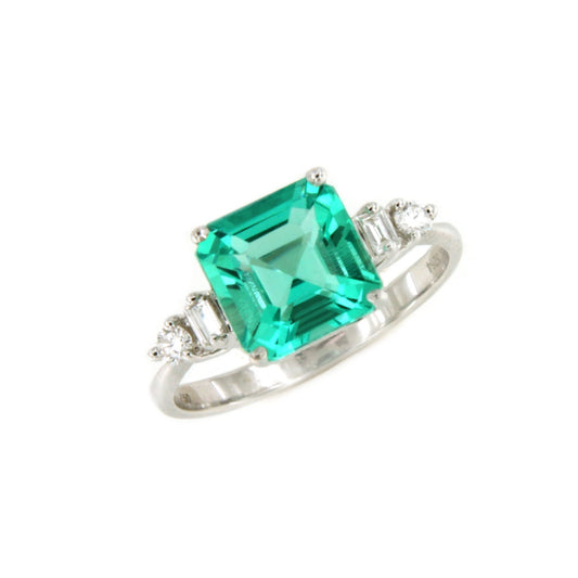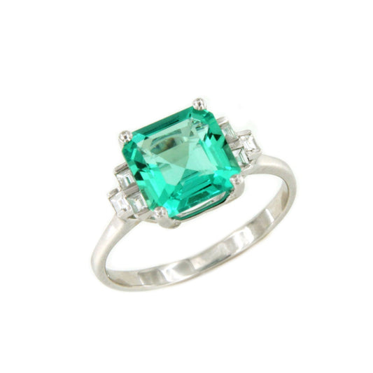 ROUEN ring with emerald and baguette-cut diamonds in 18k white gold