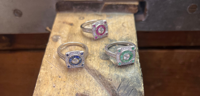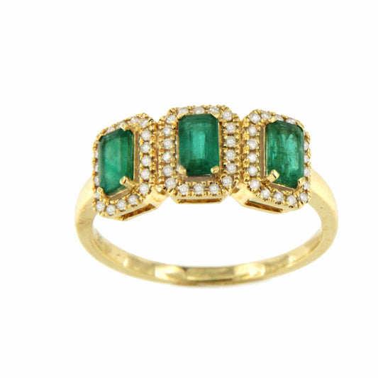 ANGER ring in 18k gold with 3 emerald or sapphire centers and diamonds