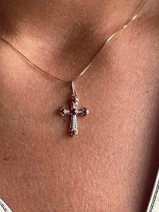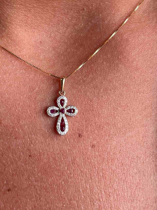 ILUMIA cross in 14k gold with diamonds and sapphire/ruby