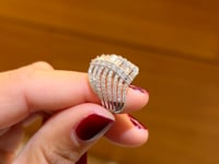 Each band features a beautiful baguette-cut diamond, totaling eight baguettes with a combined weight of 0.74 carats. If your finger size differs from our suggested size, please contact us for assistance. The ring is 2 cm wide.
