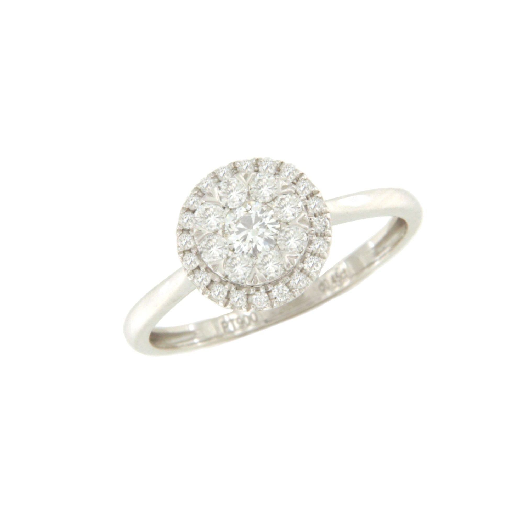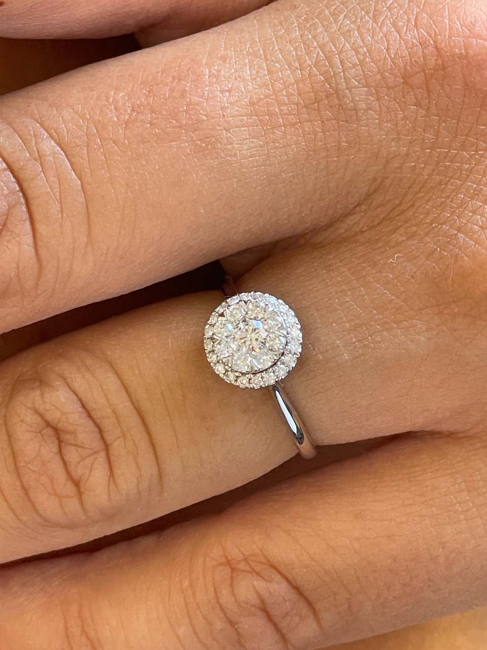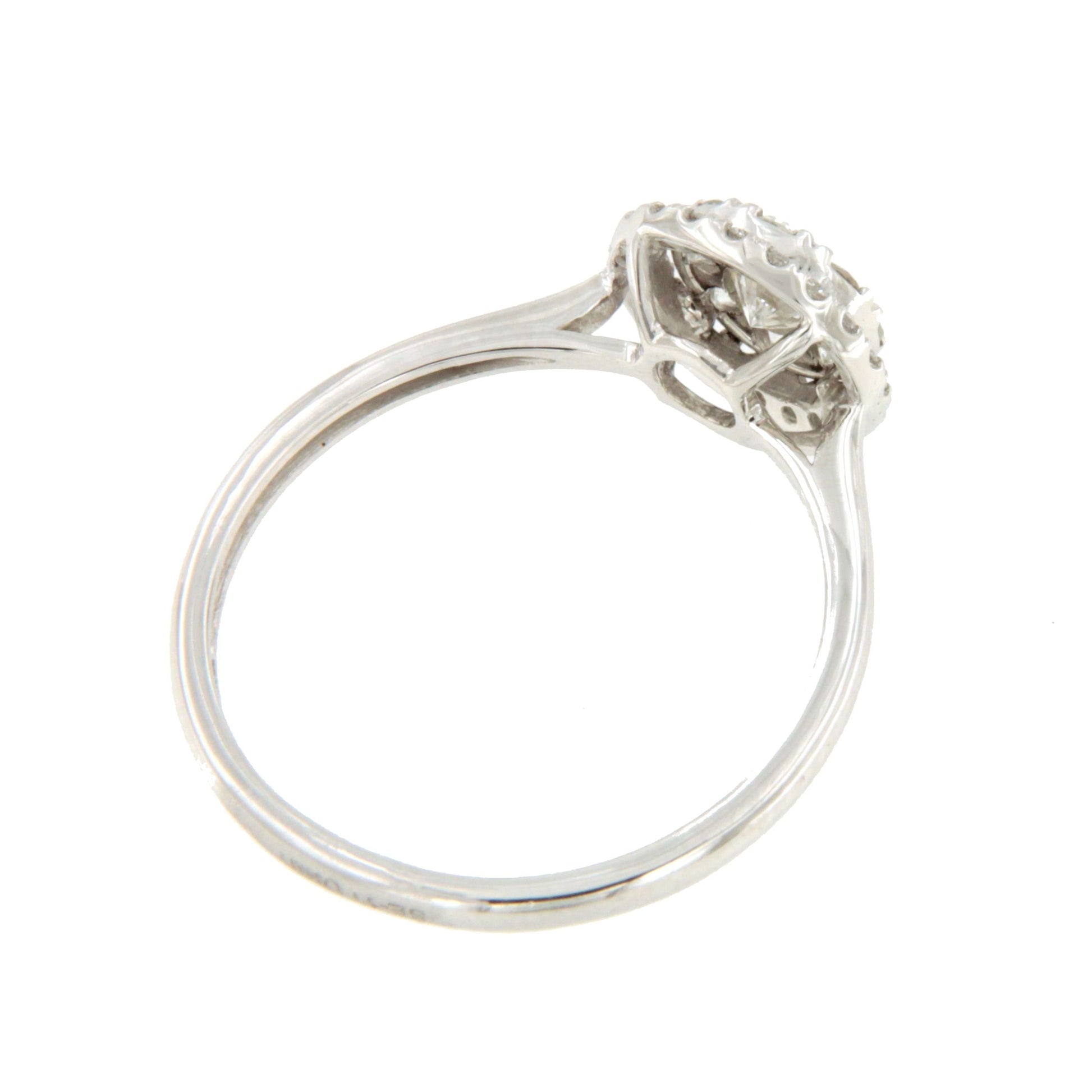ACAI is a diamond ring with a rosette set in claws and surrounded by a halo of diamonds in 18-karat white gold. Ideal for engagements or proposals.