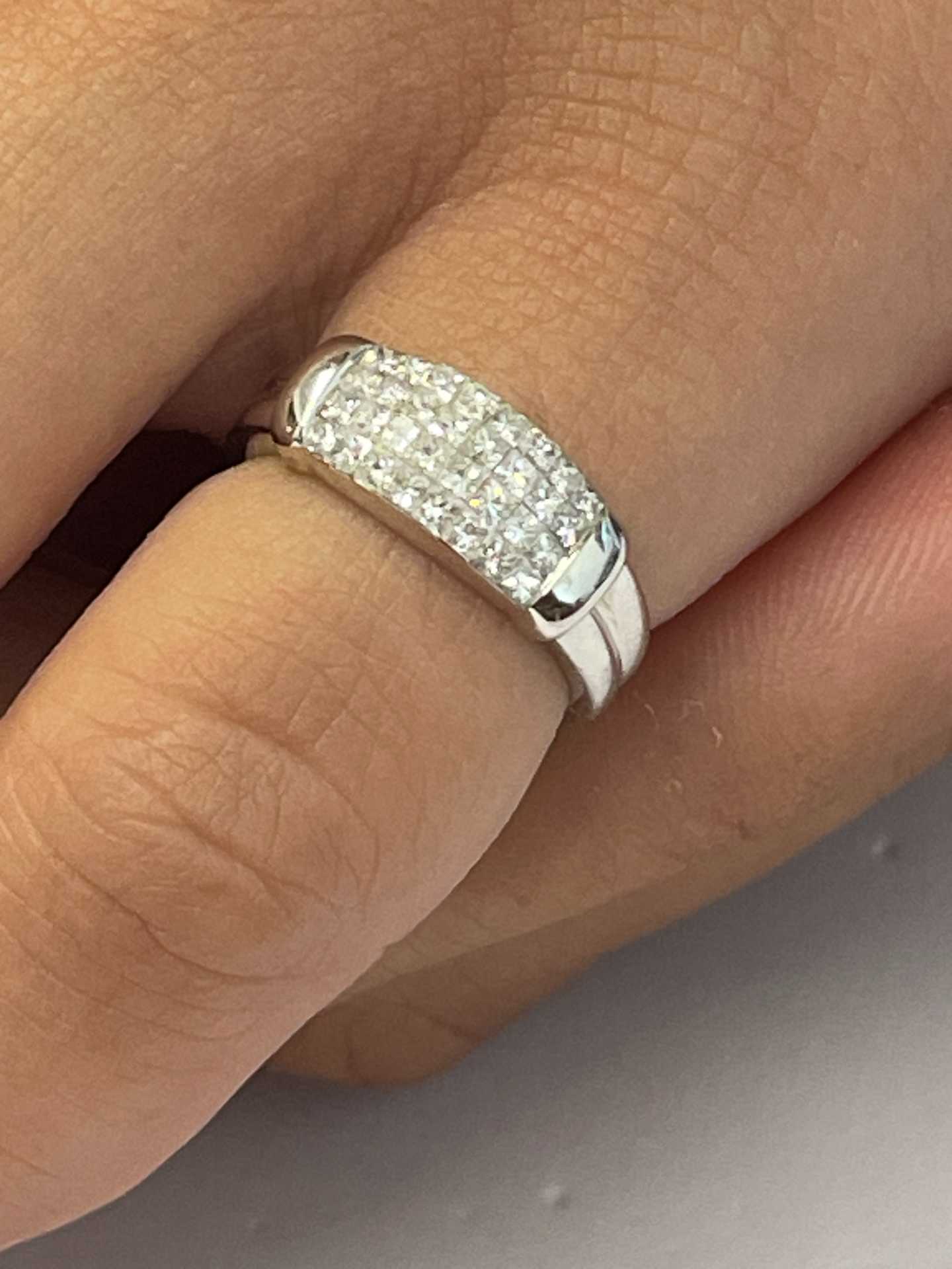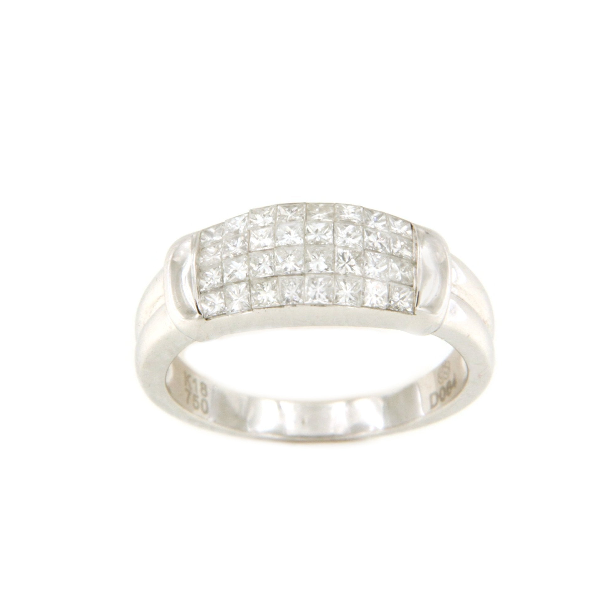 ALMONTE is a simple 18-karat white gold ring set with princess-cut diamonds, featuring an invisible setting with a linear design and very elegant rows.