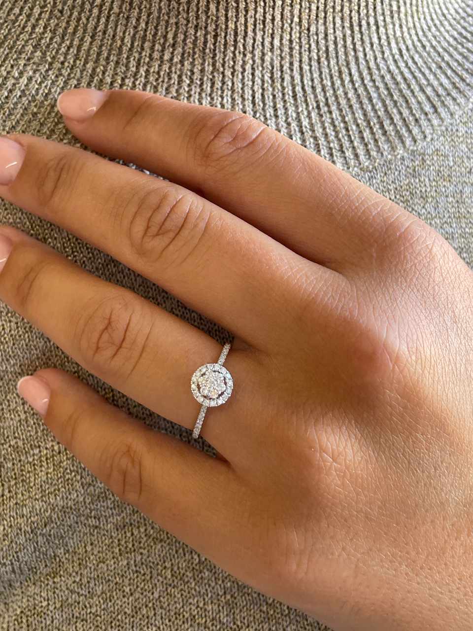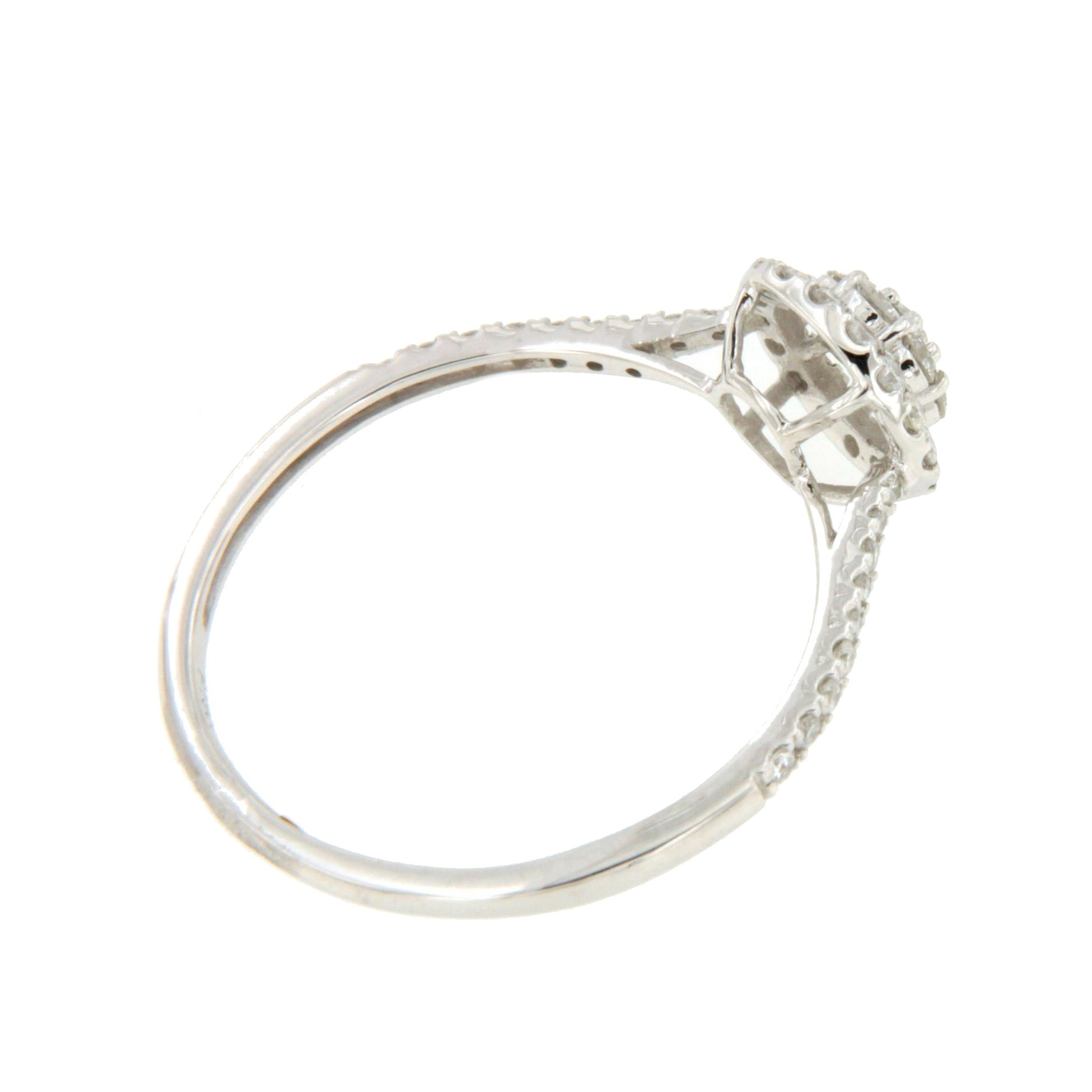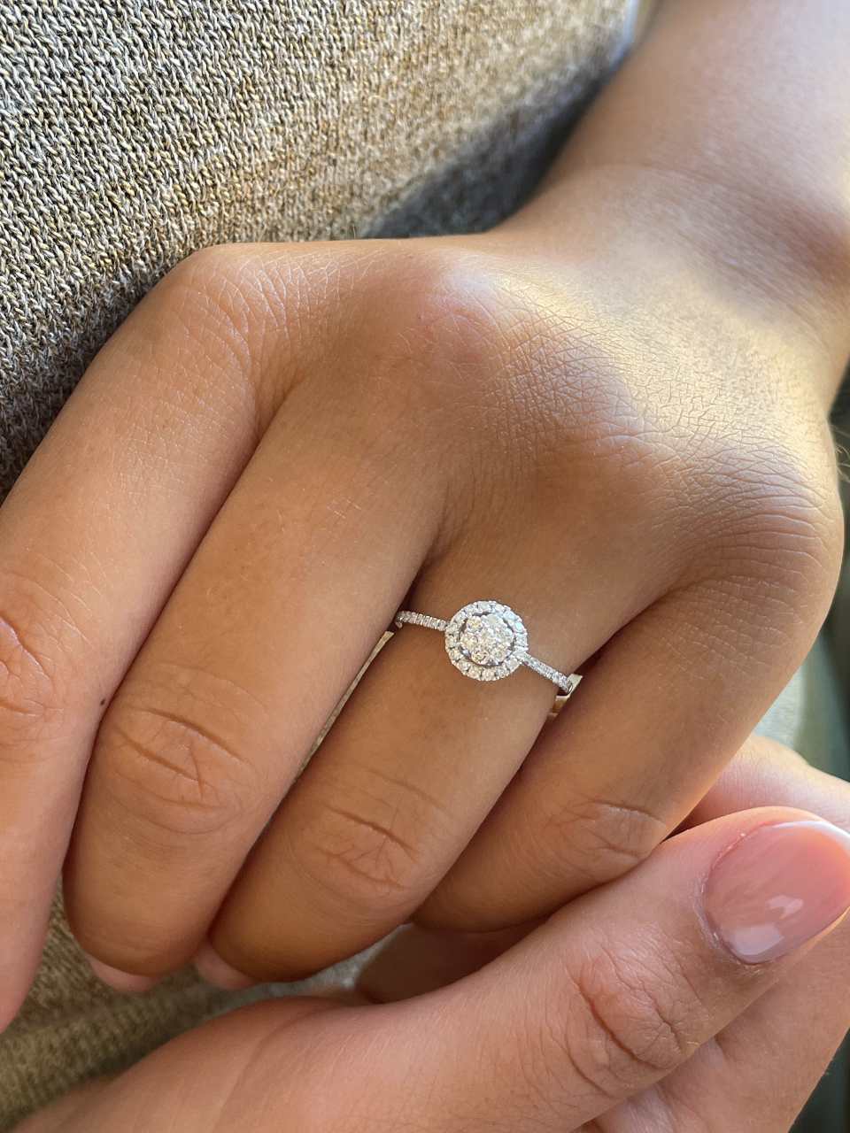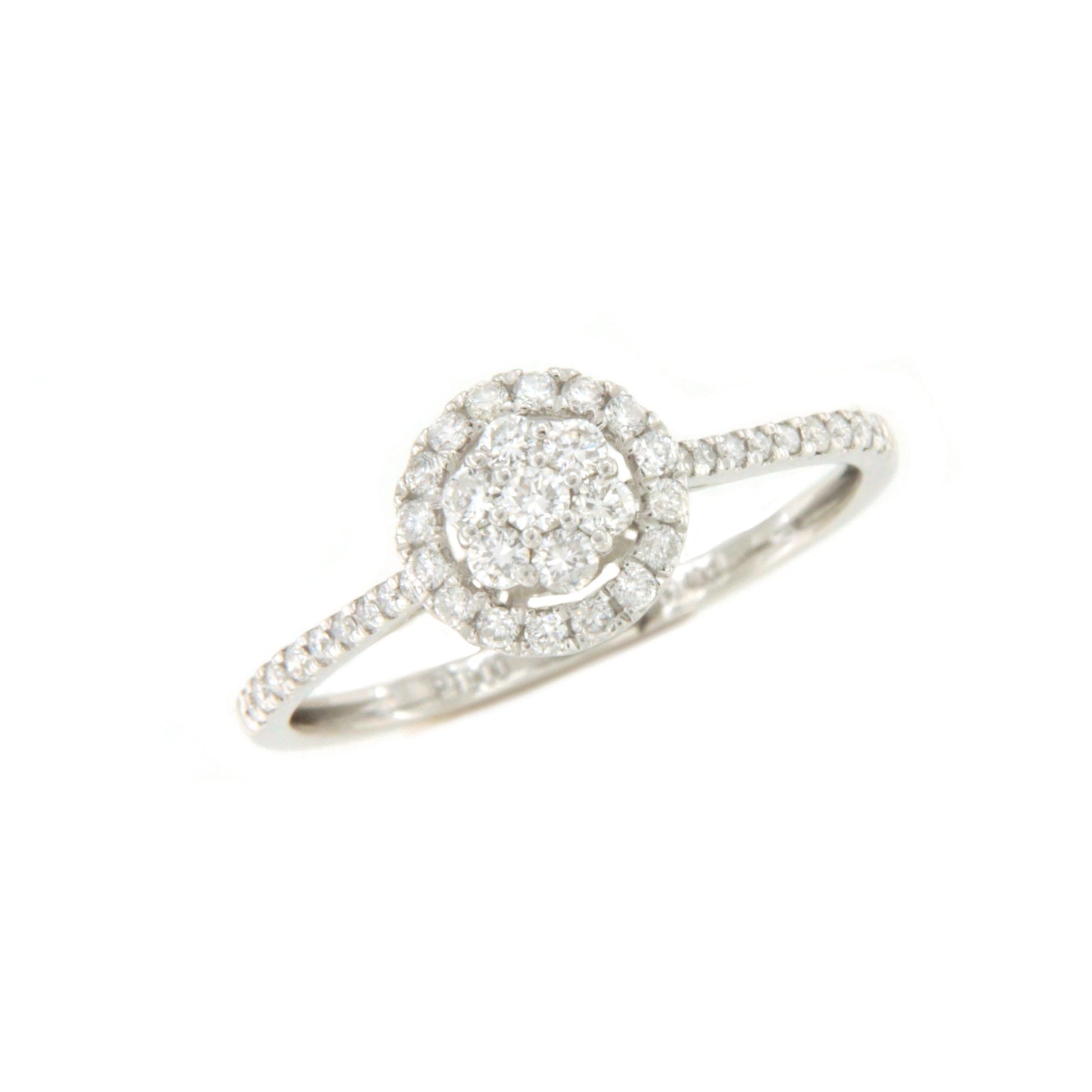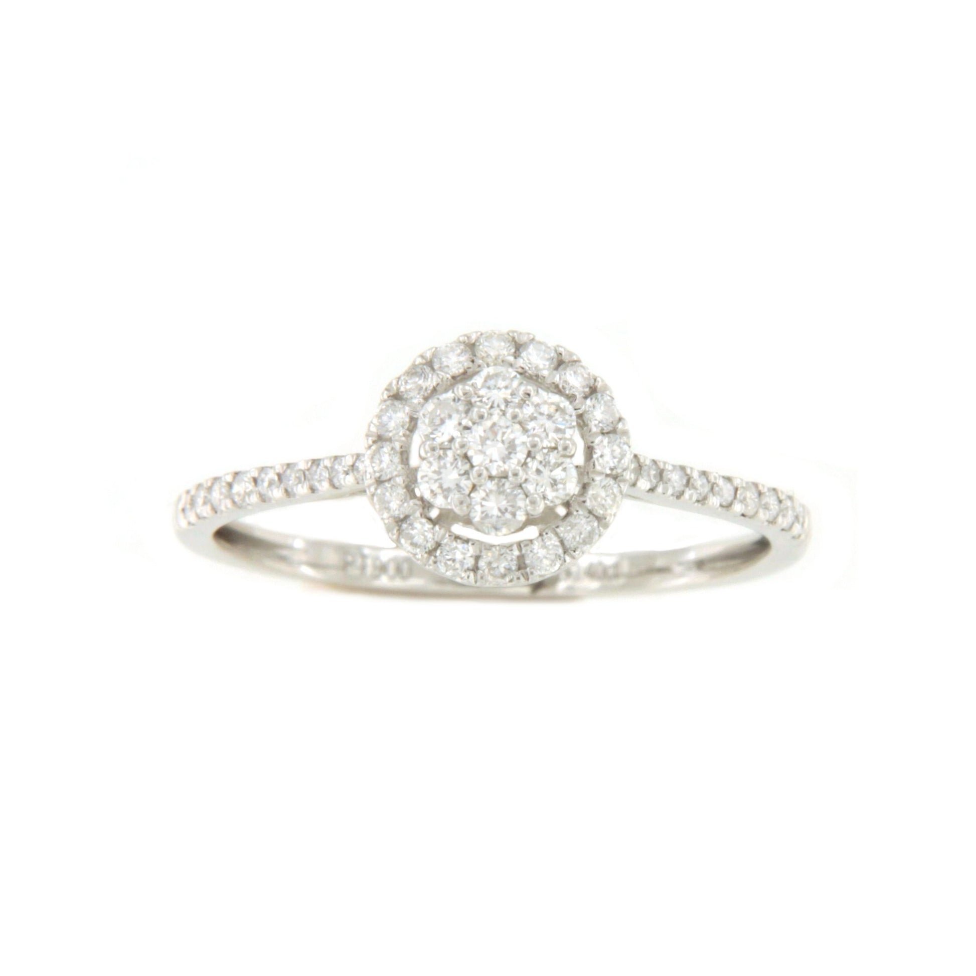 Blueberry is a rosette-shaped diamond ring surrounded by a halo of diamonds in 18-karat white gold, with diamonds also set into the band . Ideal for engagements or proposals.
