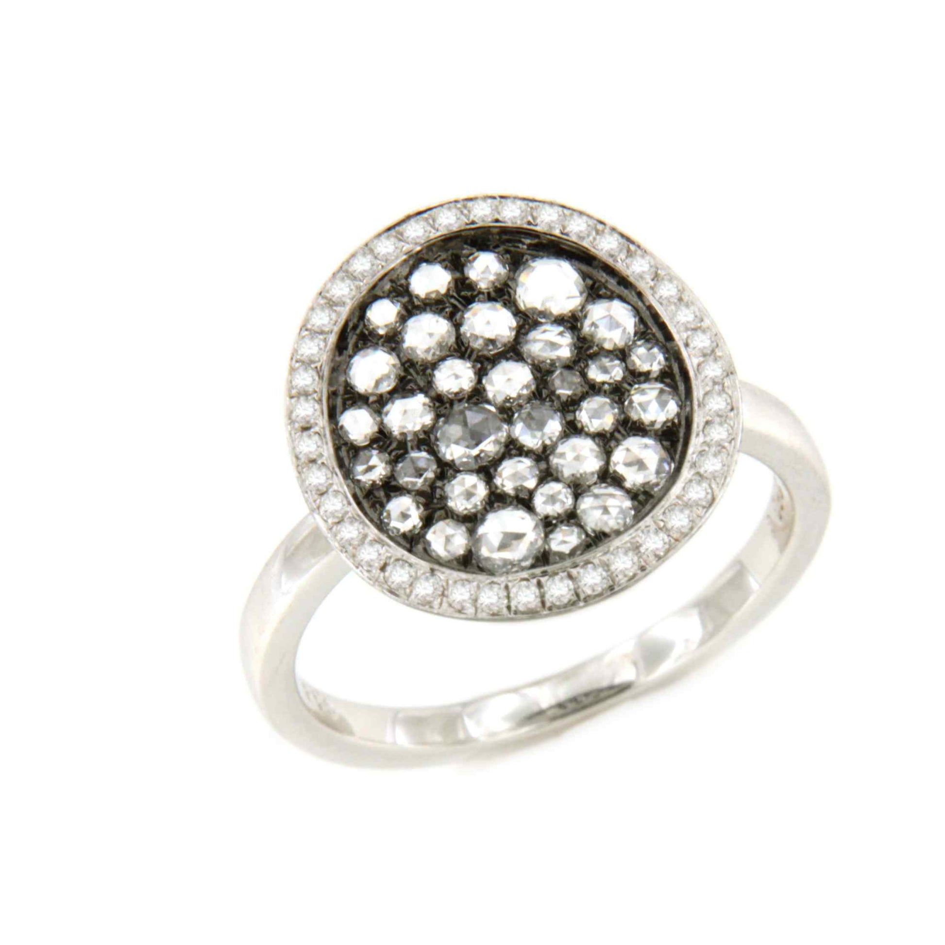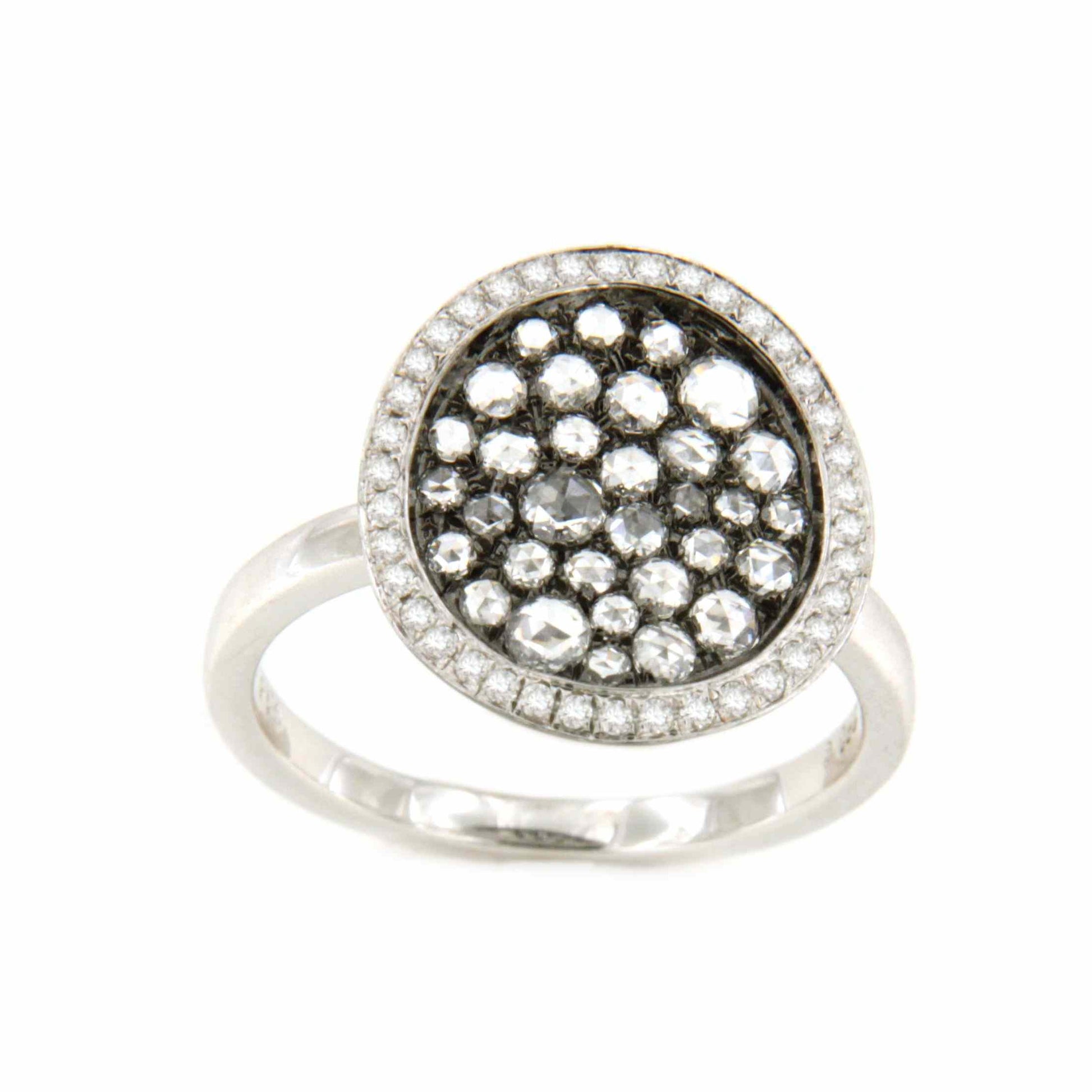 BARACALDO is a round ring with pavé-set rock-cut diamonds in the center, rhodium-plated in black and surrounded by brilliant-cut diamonds. It is crafted in 18-karat white gold.