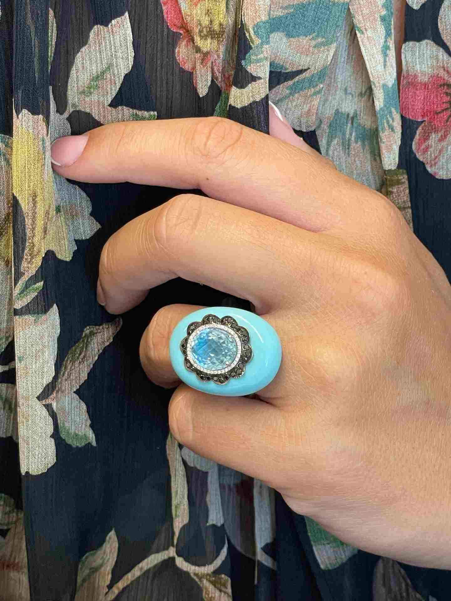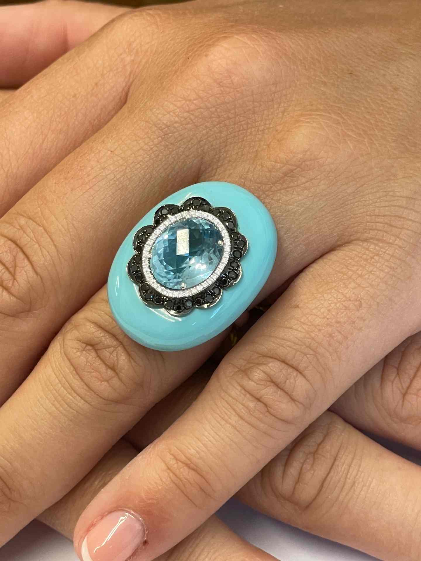 BARQUERA is an 18-karat white ring with turquoise , rounded oval shape with aquamarine center surrounded by white and black diamonds .