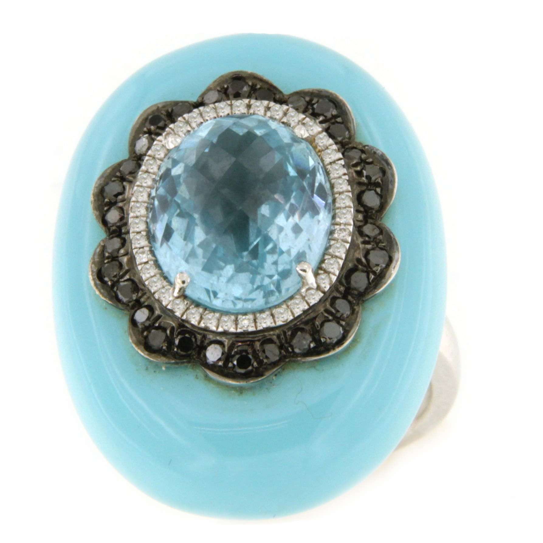 Precious gem: 40 white brilliant cut diamonds 0.10 carats, 30 black diamonds 0.38 carats, 1 aquamarine 6.80 carats and 1 oval turquoise.