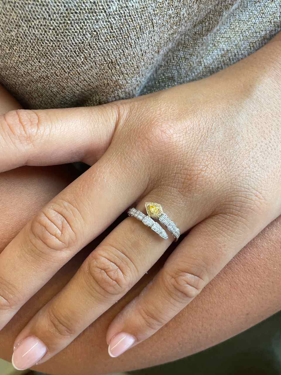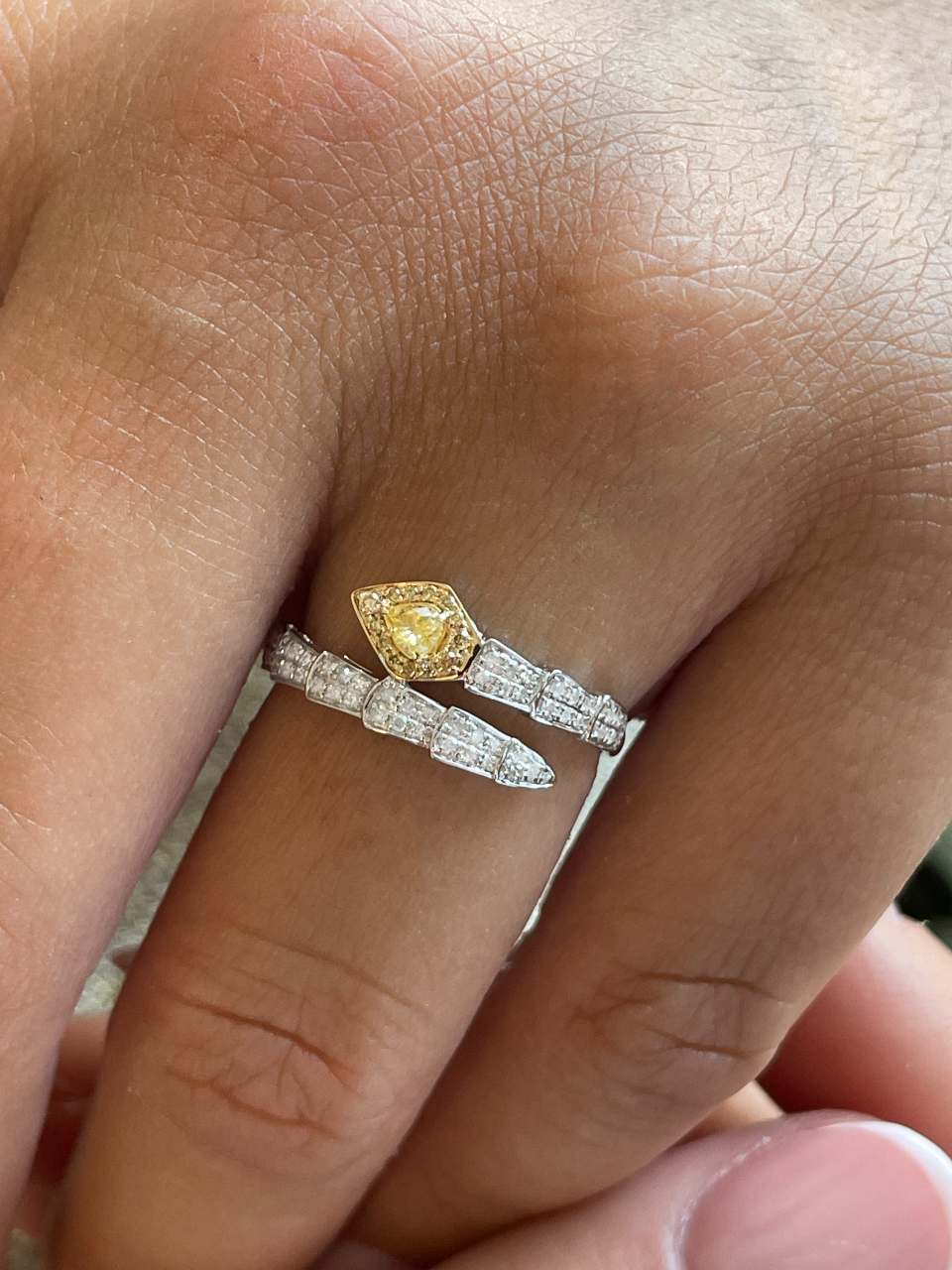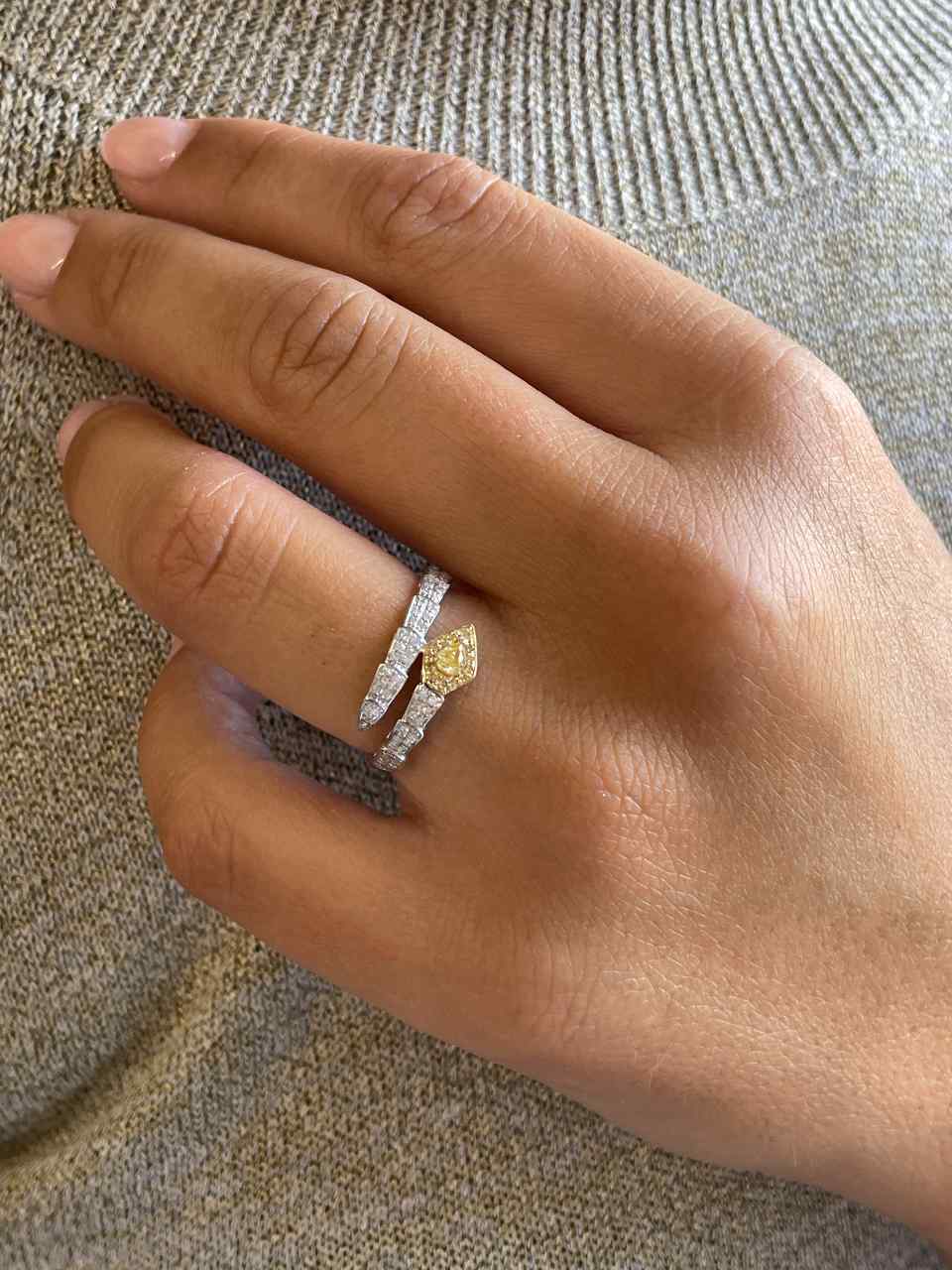 BAYA is a snake-shaped ring , made of 18k white gold , with a design that features yellow diamonds on its head and diamonds on its skin along its arm.