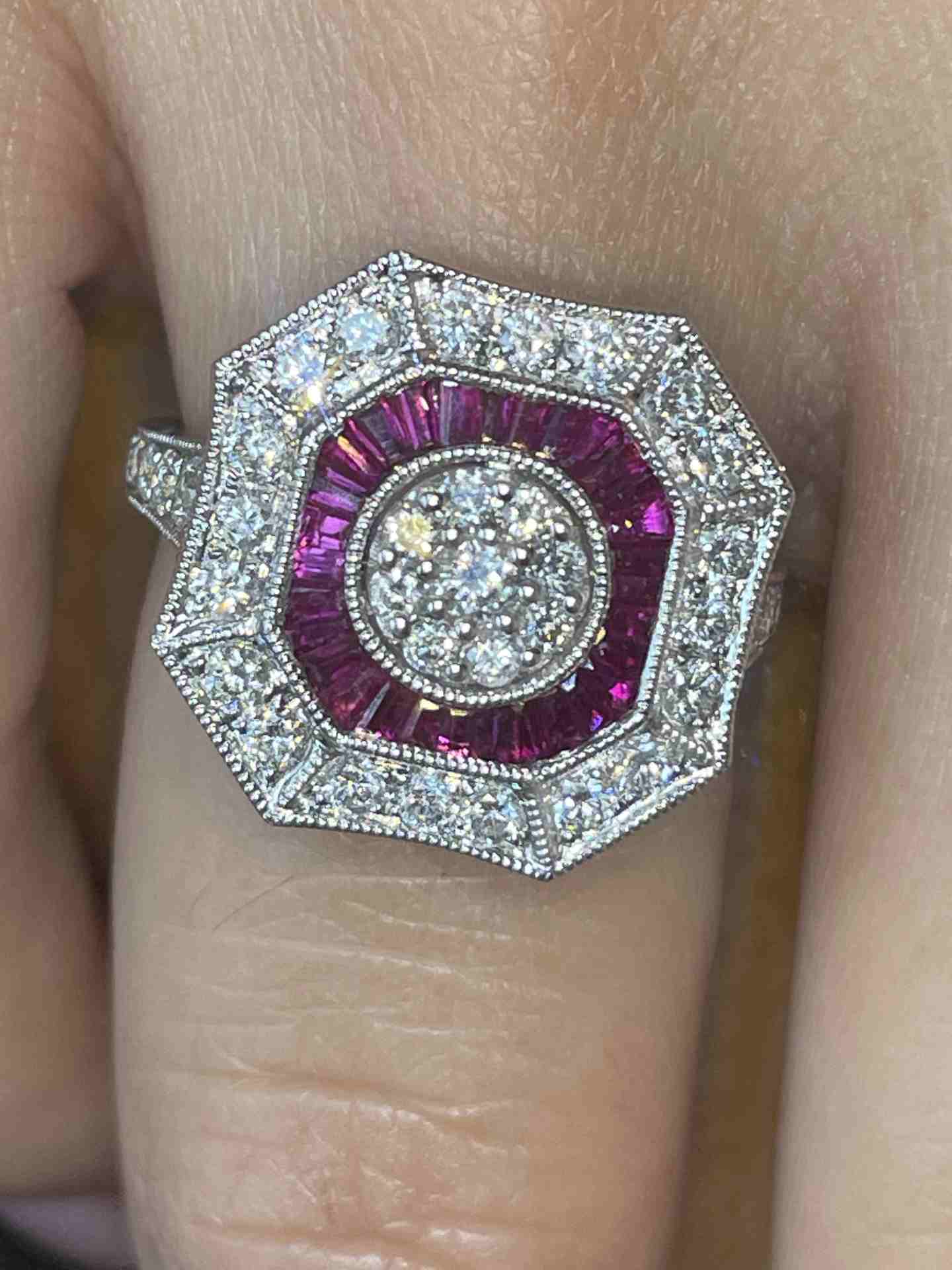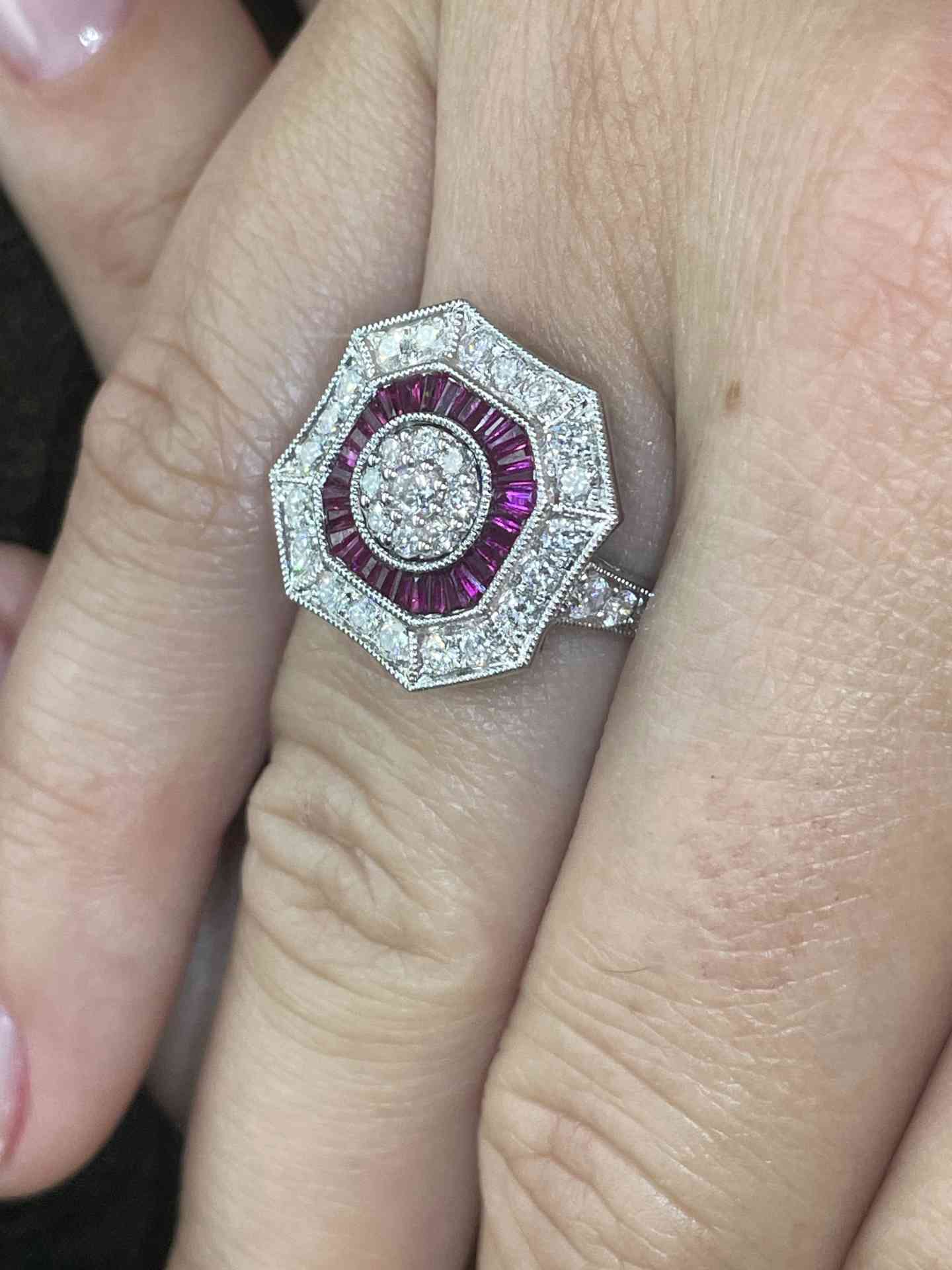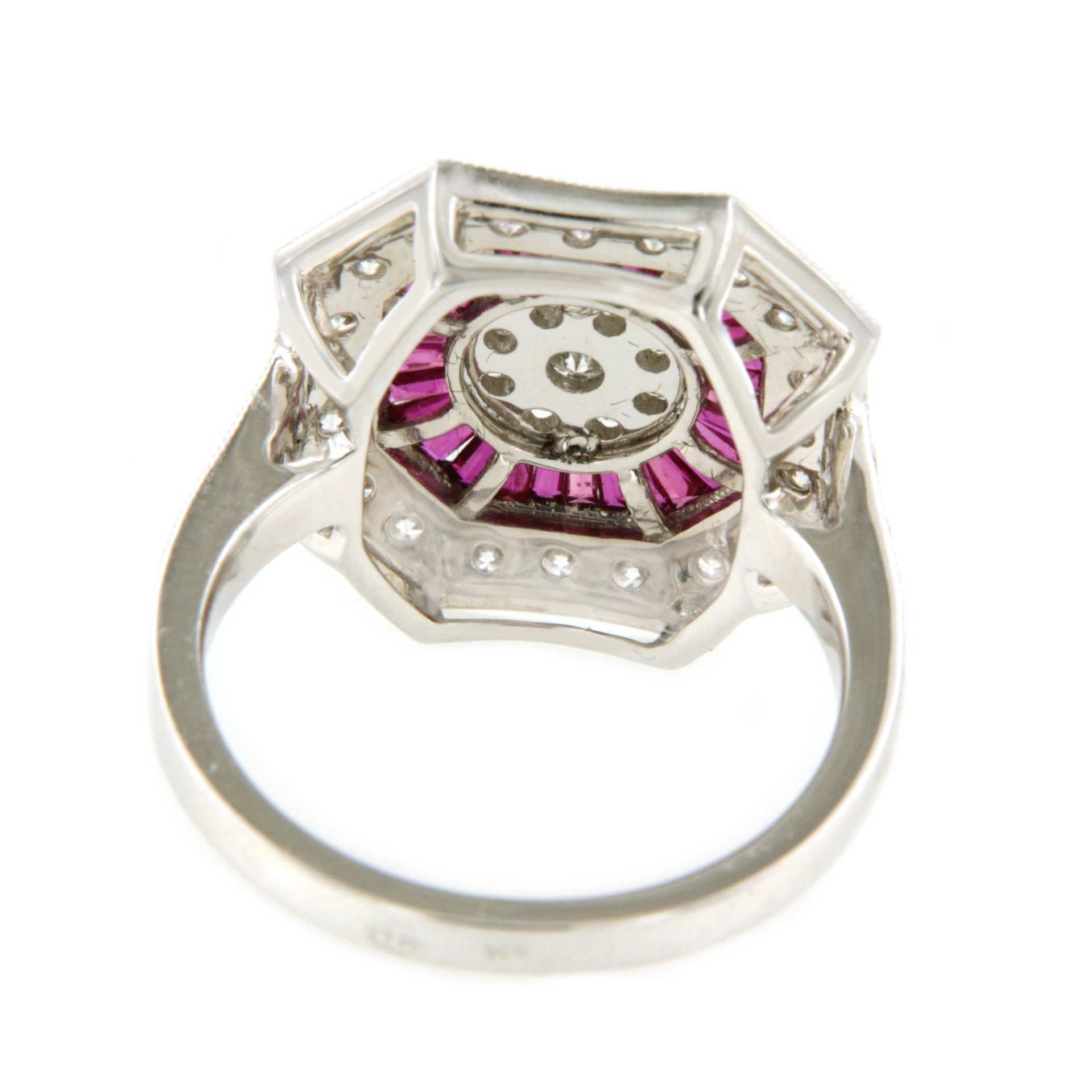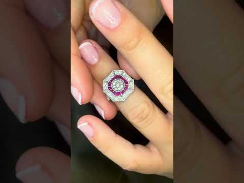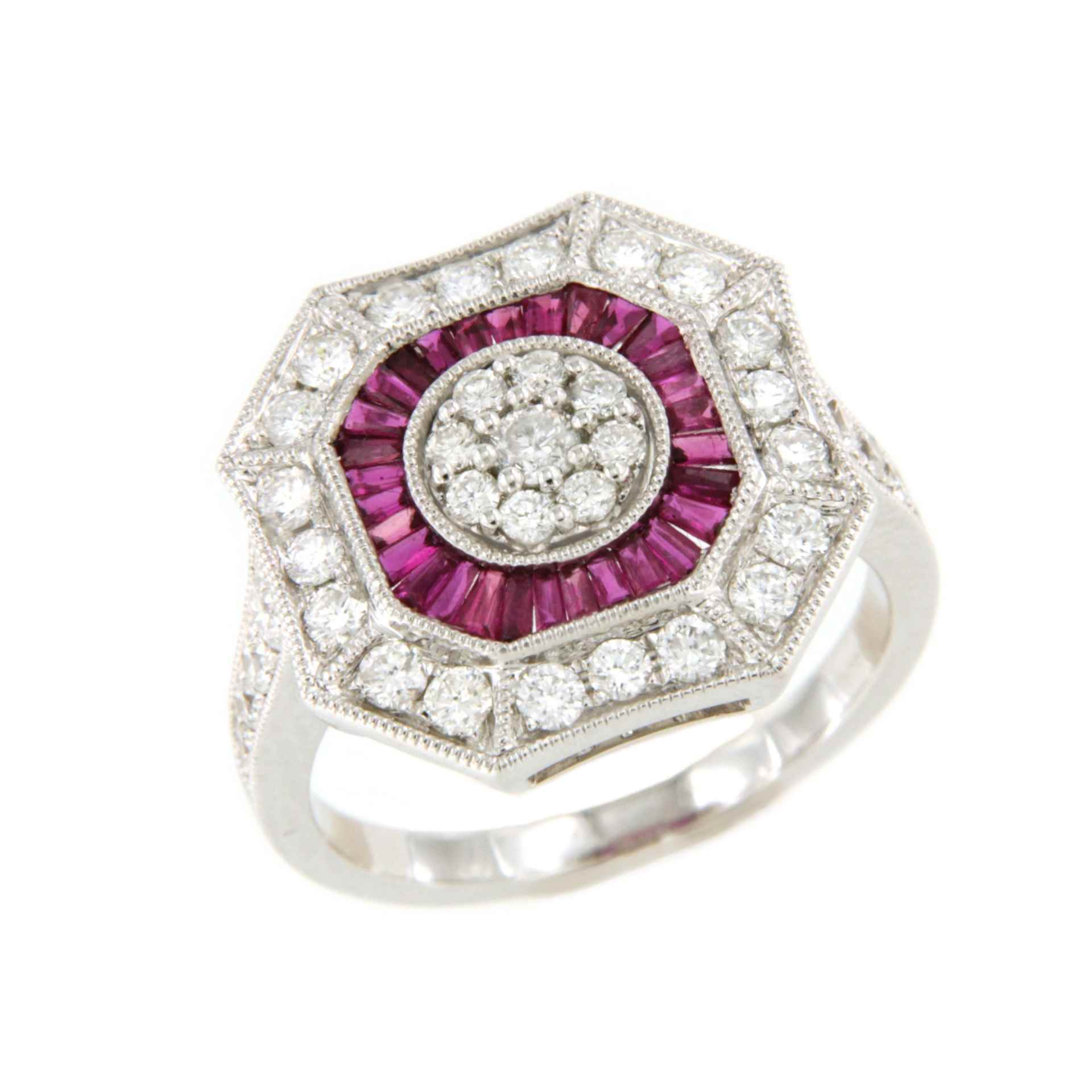 BOA is an art deco style ring in 18-karat white gold with a rosette center of diamonds surrounded by ruby accents and in turn surrounded by diamonds.