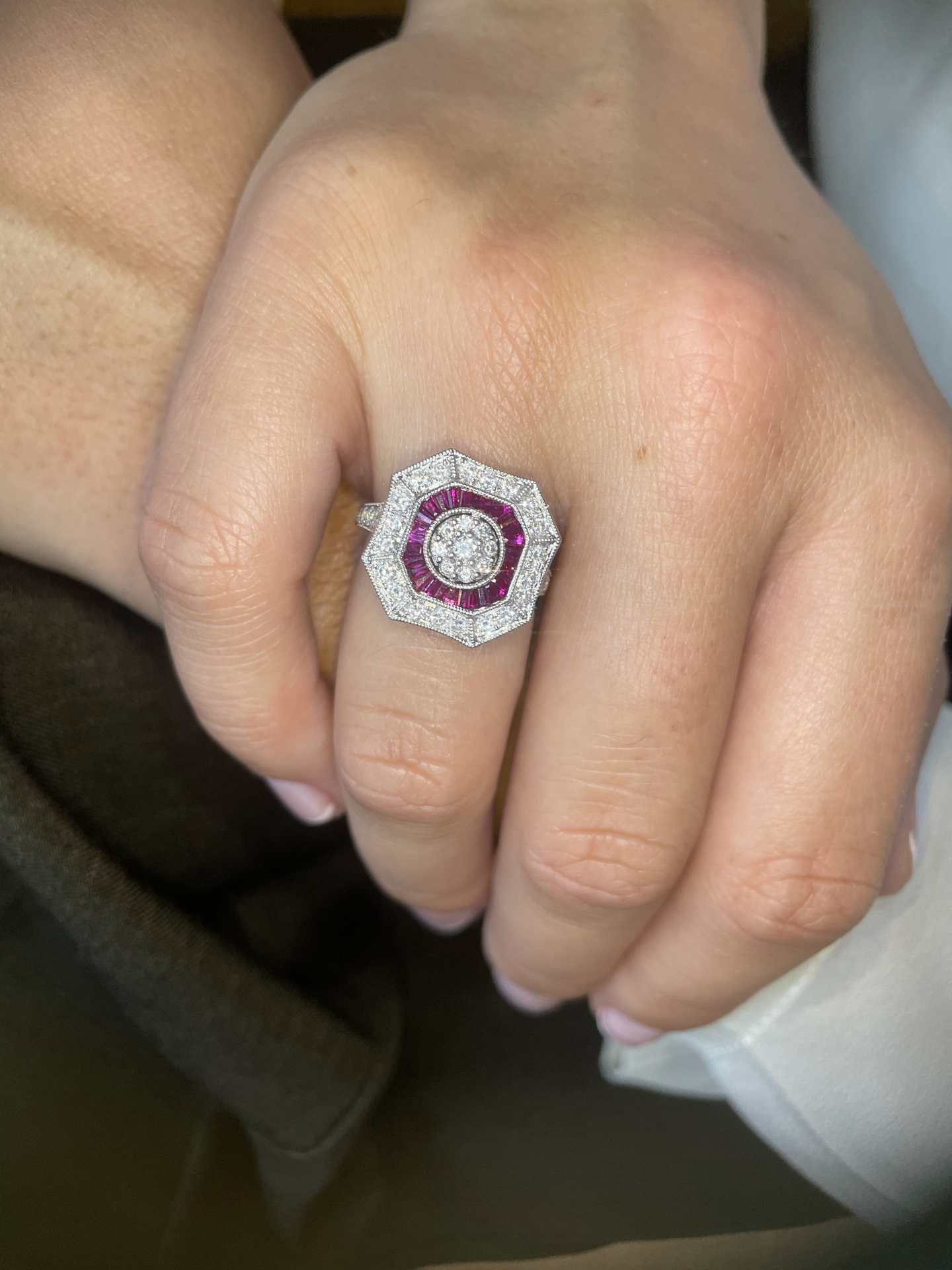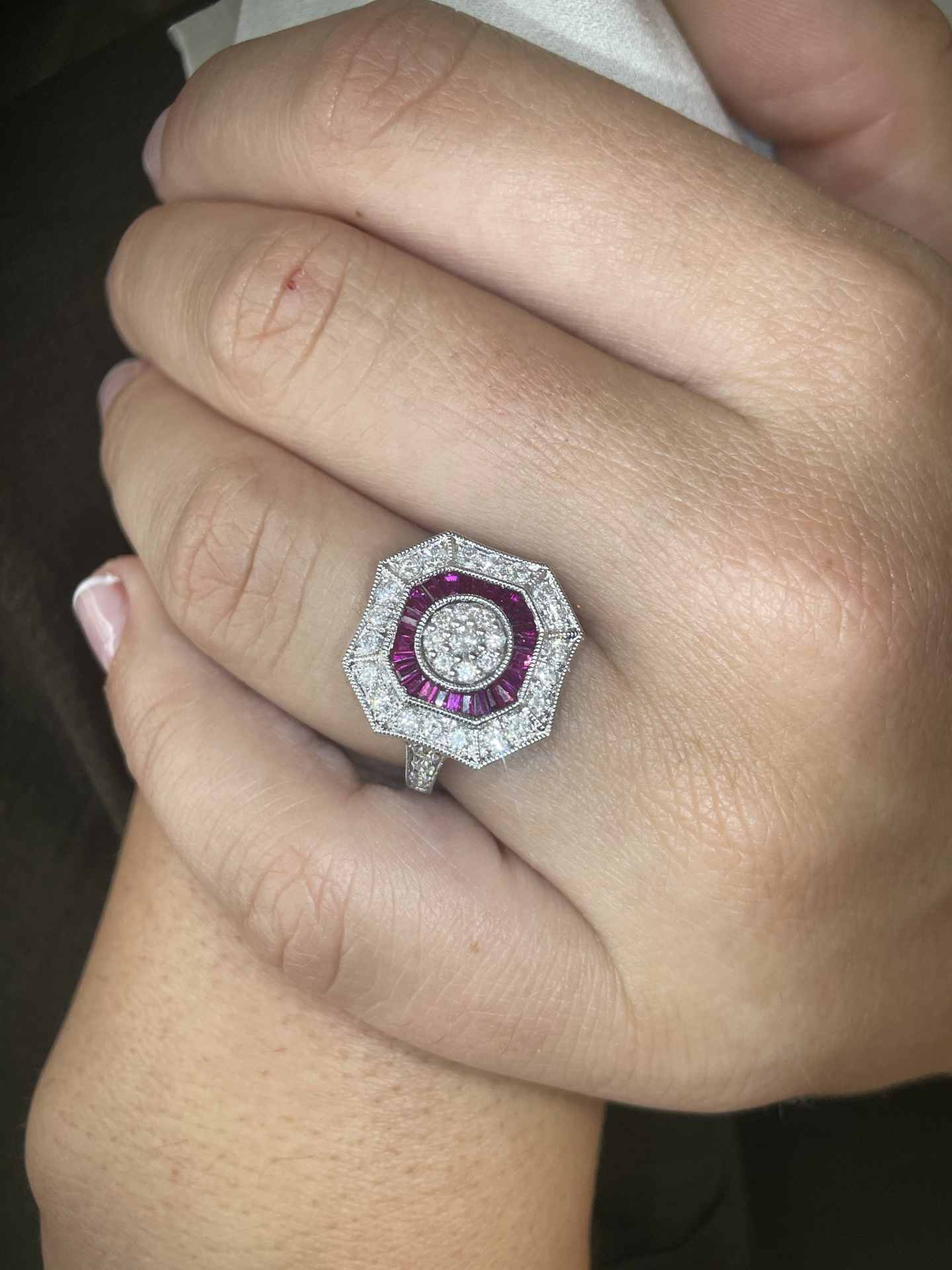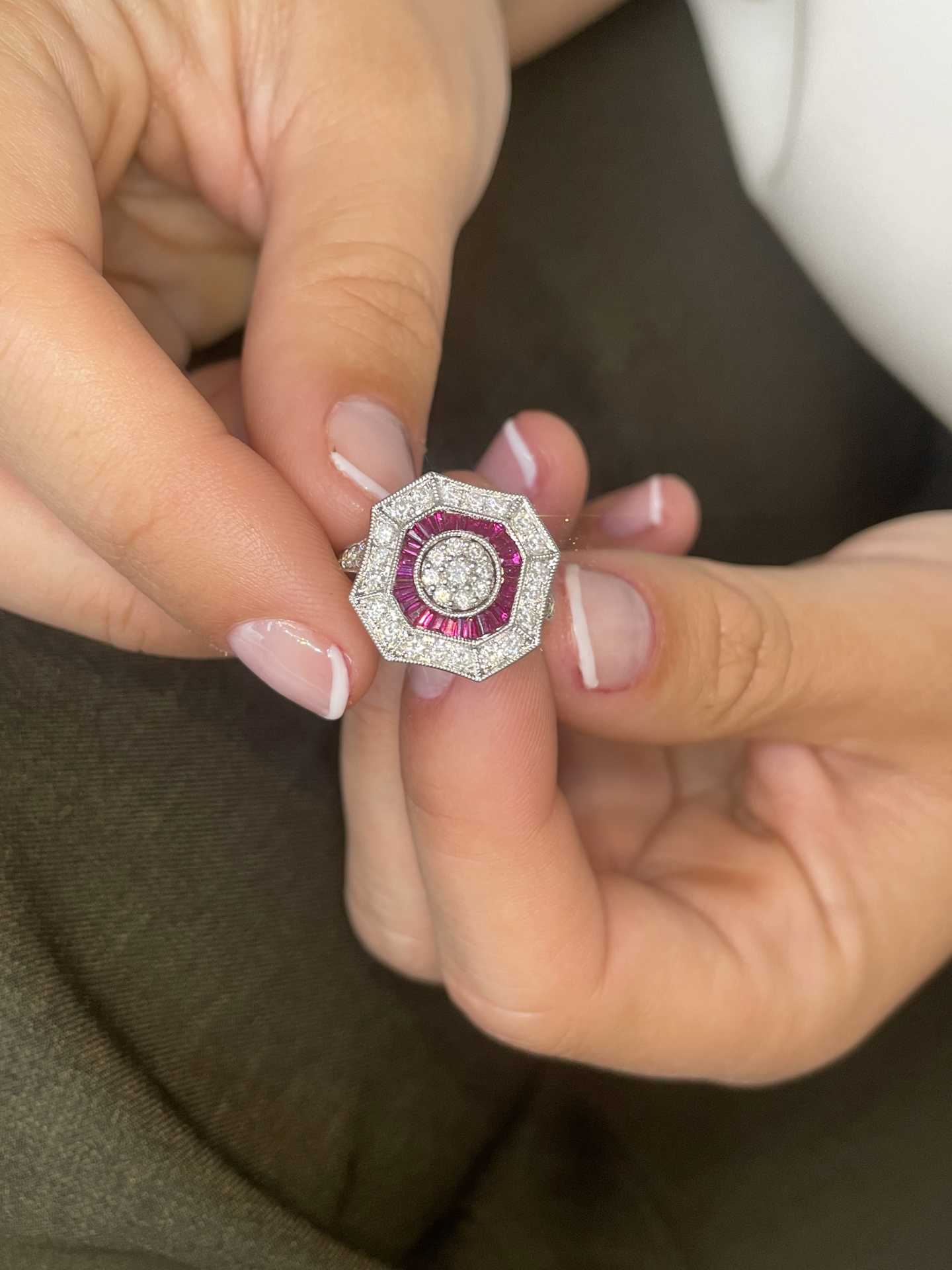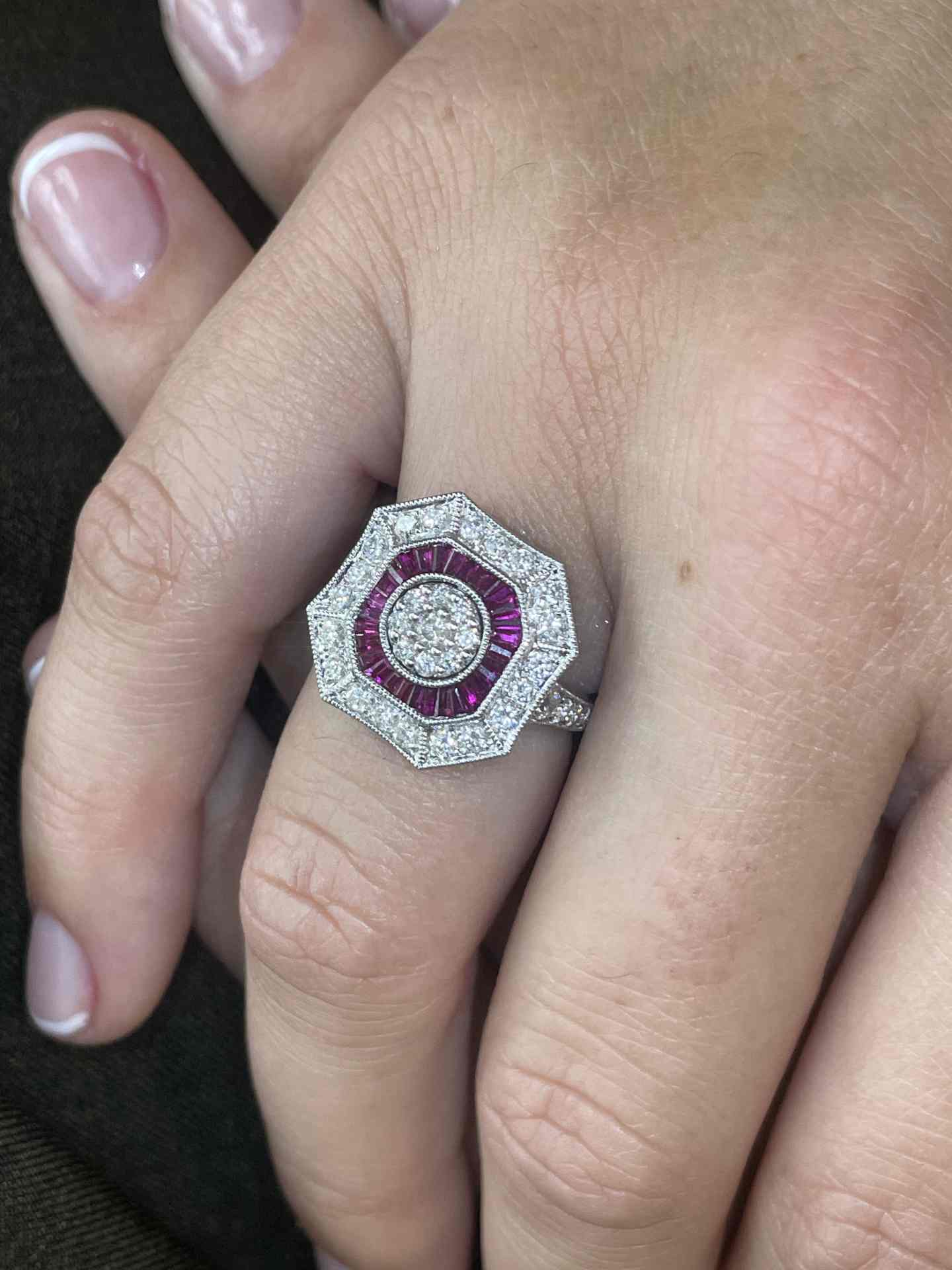 BOA is an art deco style ring in 18-karat white gold with a rosette center of diamonds surrounded by ruby accents and in turn surrounded by diamonds.