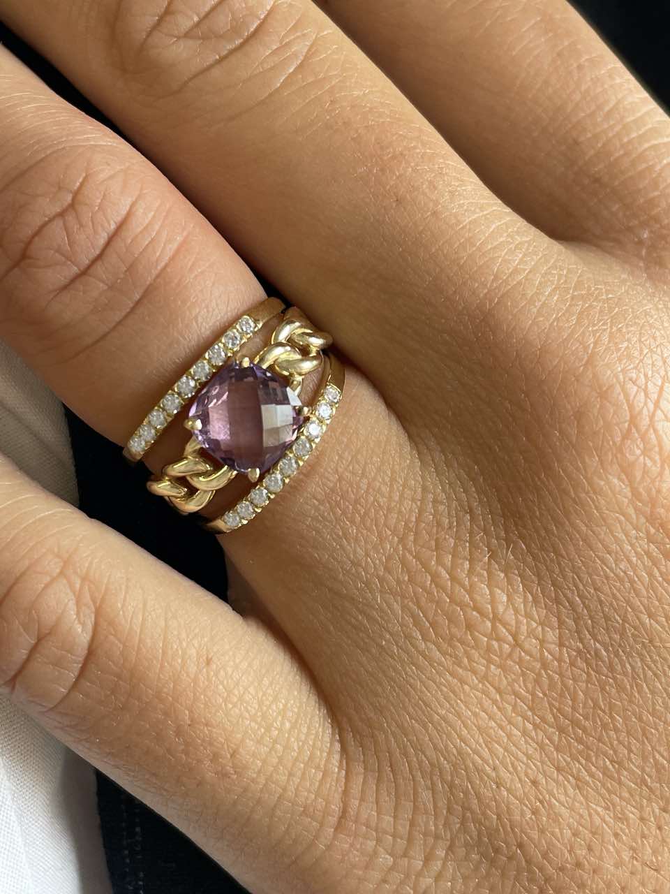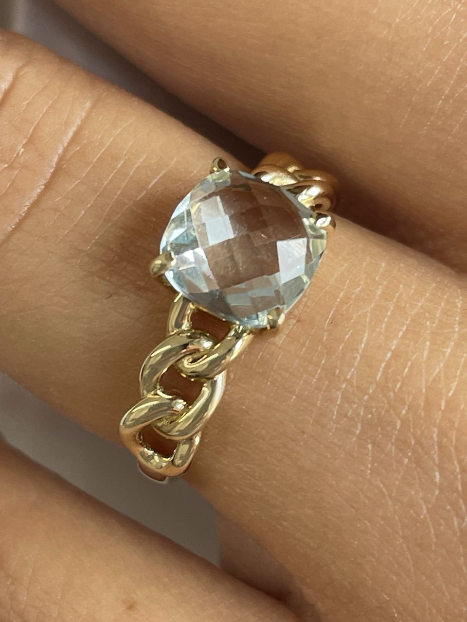 BREZO , is a ring with an amethyst or blue topaz center set in four claws on a curb chain arm made of 18-karat yellow gold .
