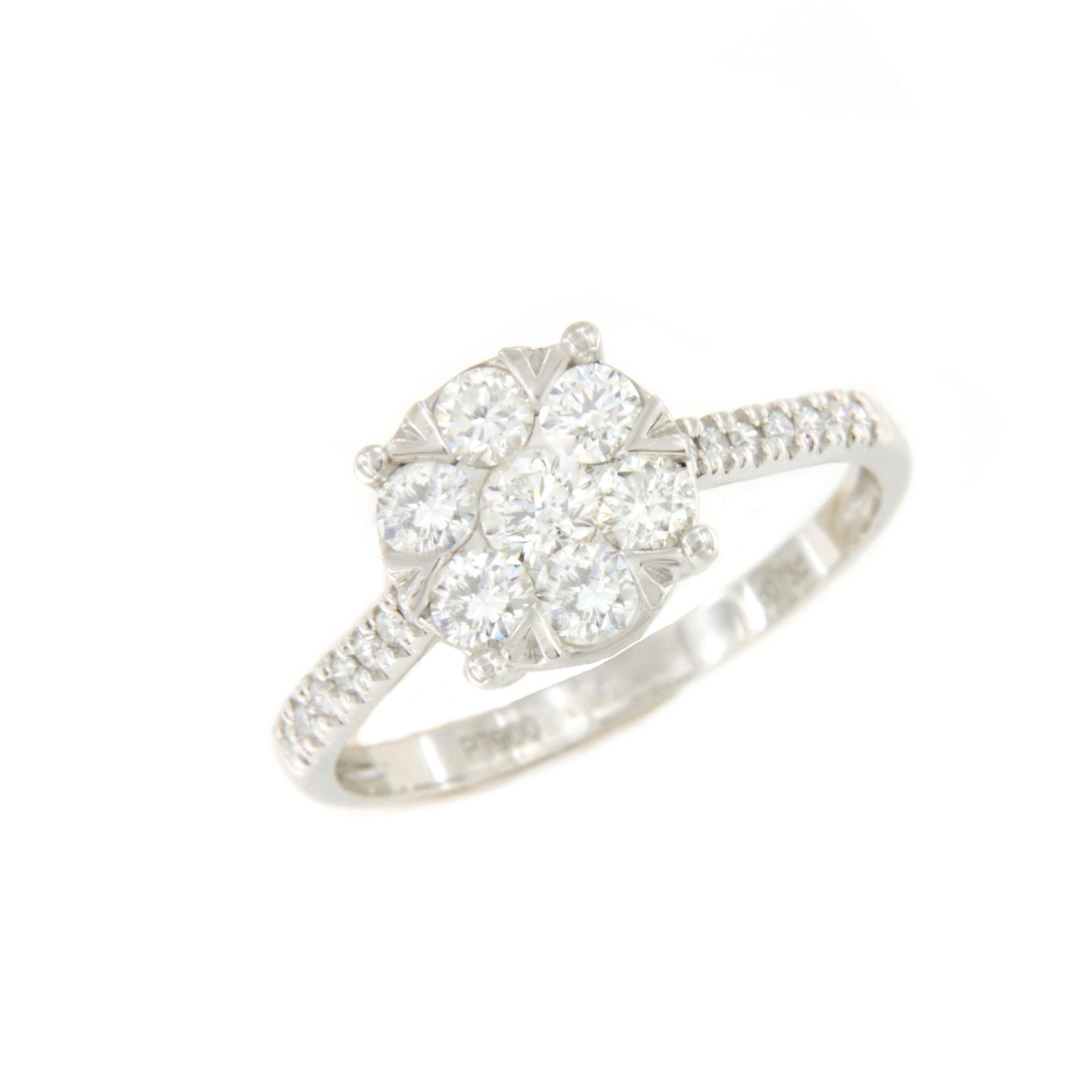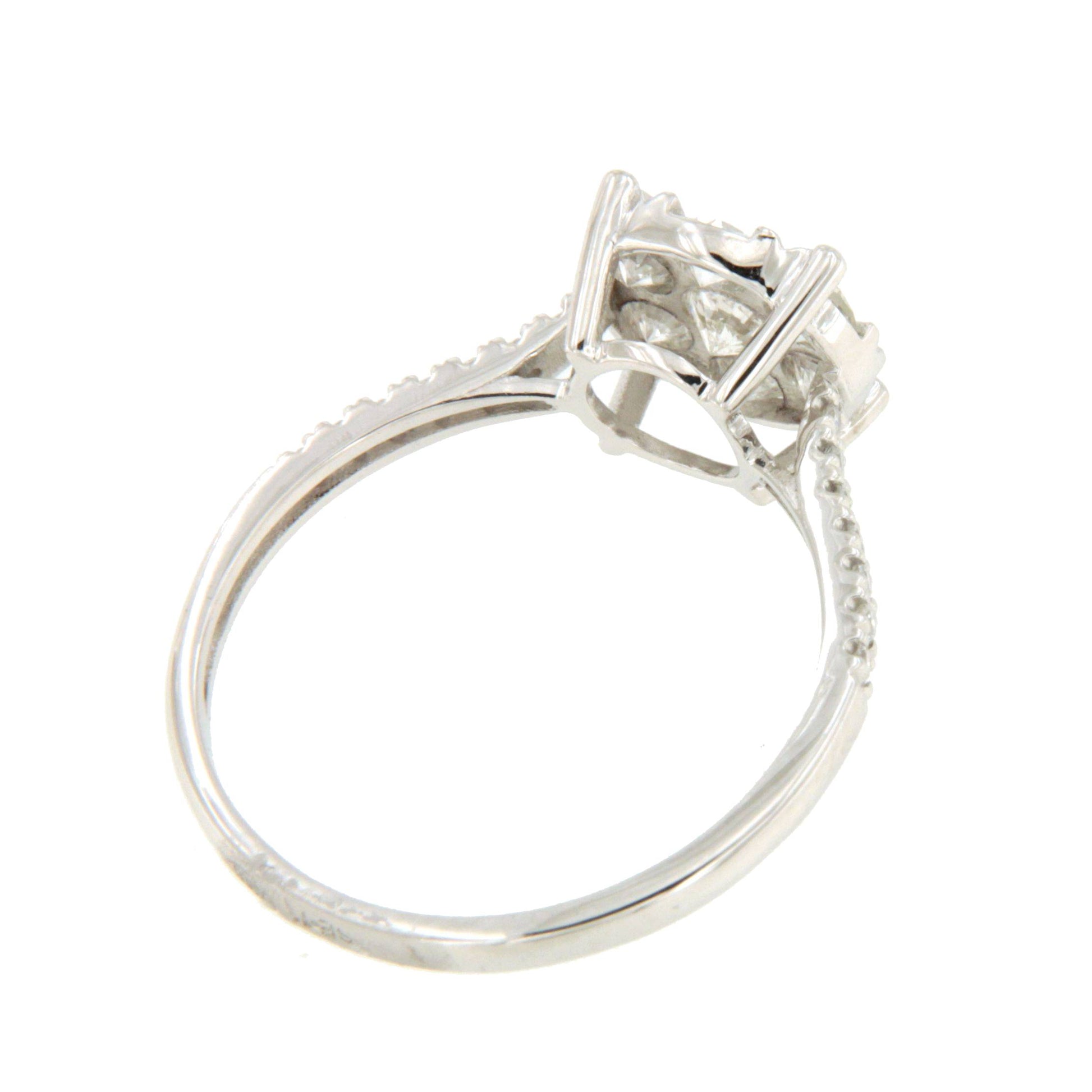 CAMU is a classic solitaire ring featuring a diamond rosette set in 18-karat white gold with four prongs and a band also set with diamonds. It's an ideal engagement or proposal gift.