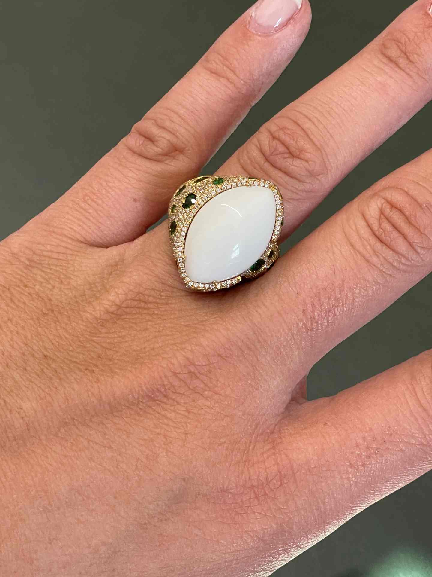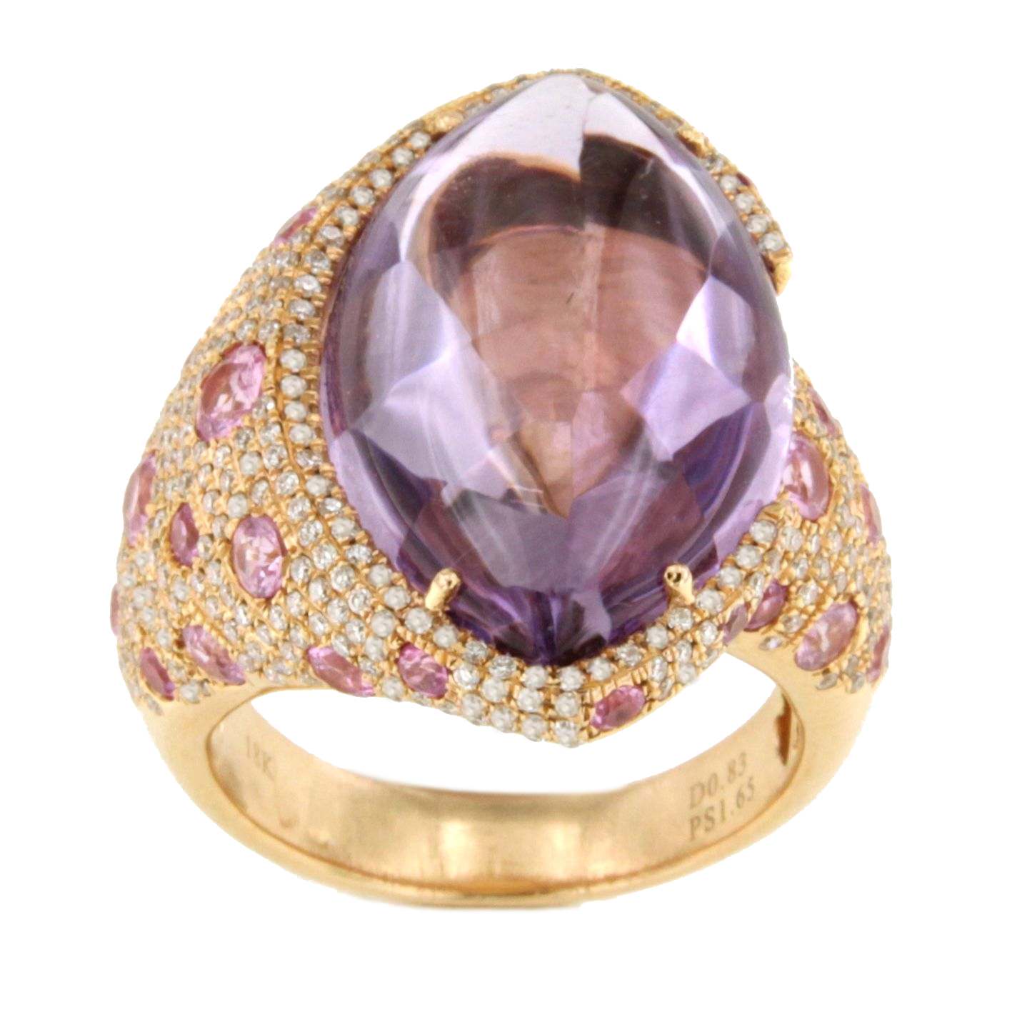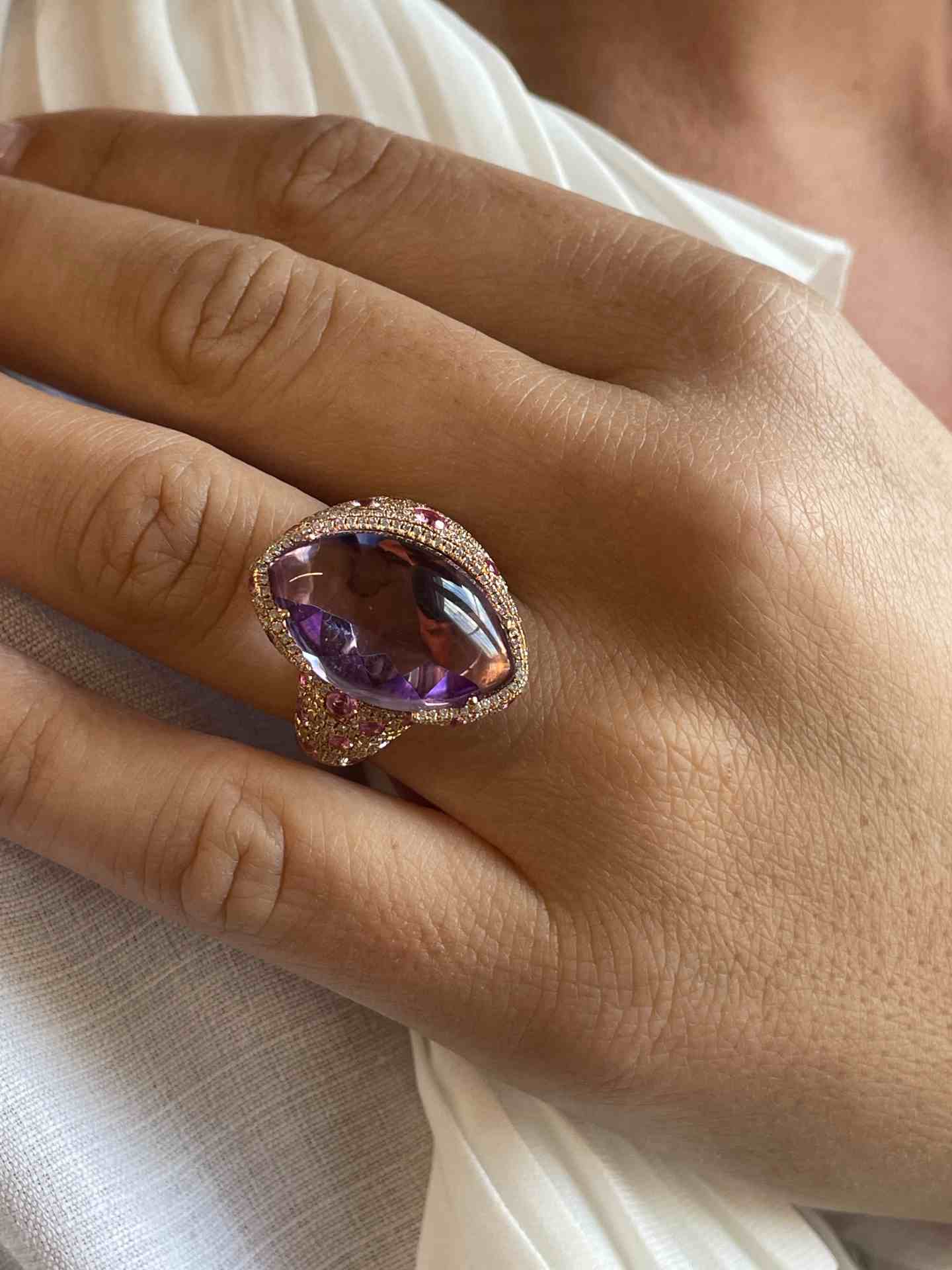 CASCAI is a beautiful marquise-cut amethyst cabochon ring set in rose gold with diamonds and pink sapphires , also available in white agate with green garnets and diamonds in yellow gold. Both are ideal.