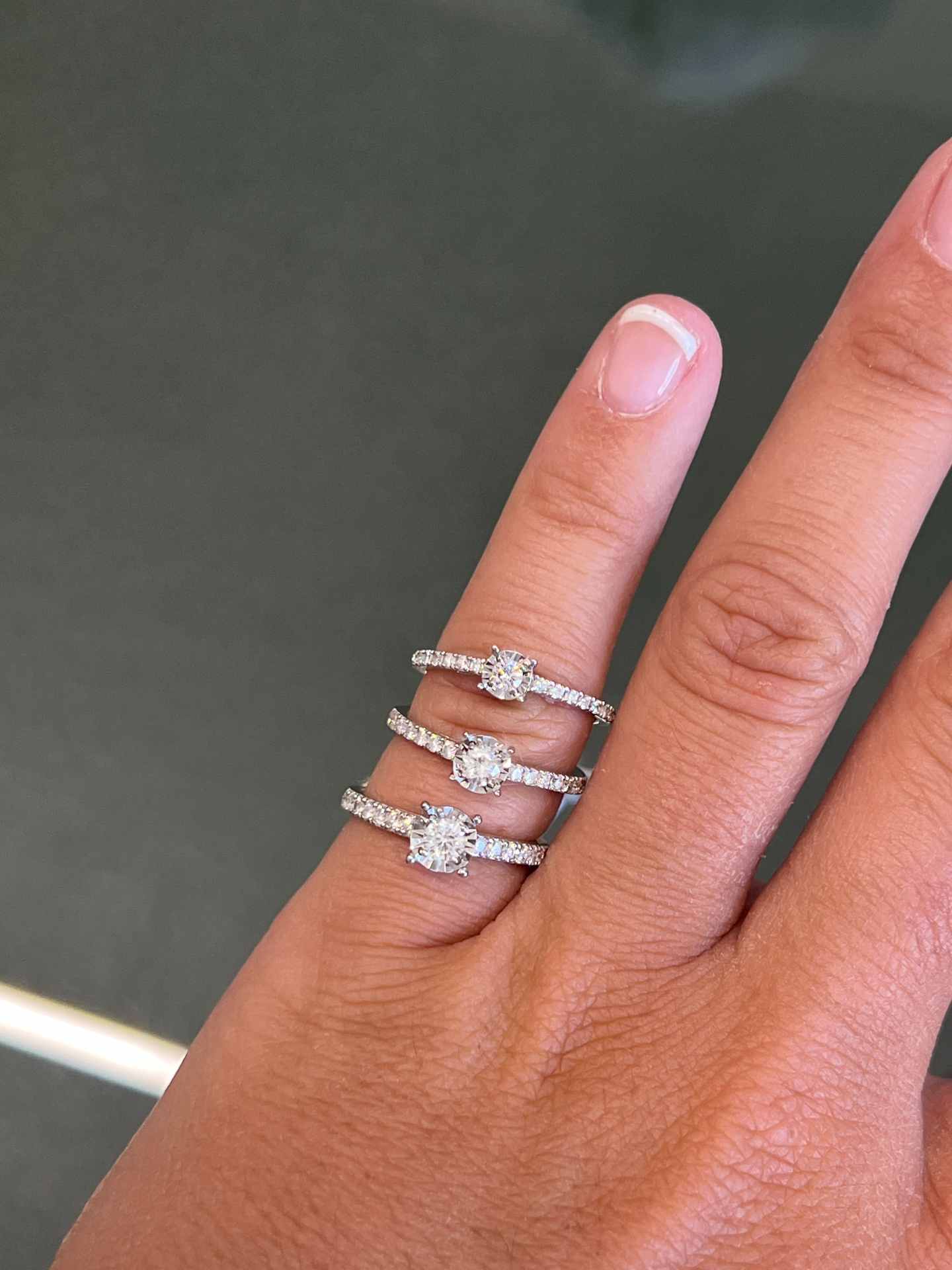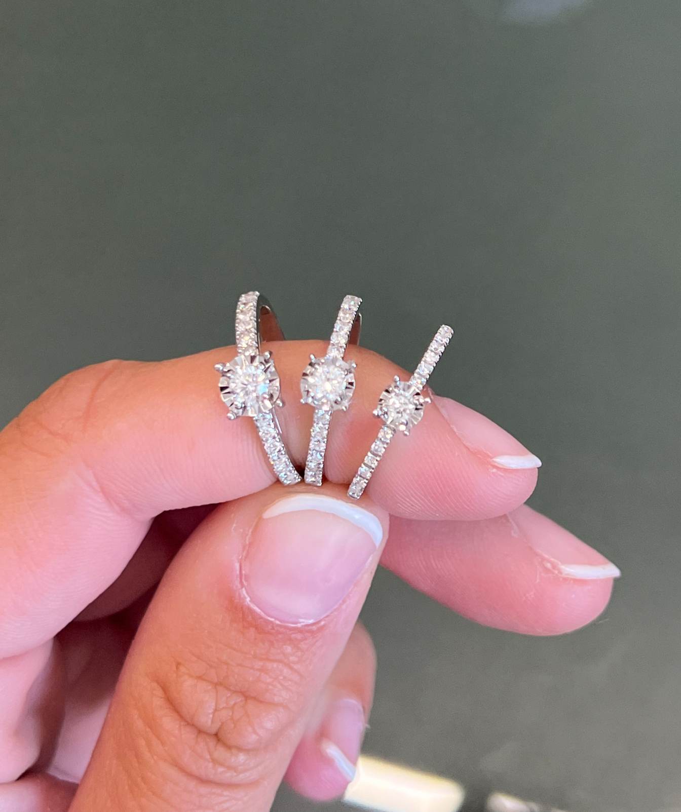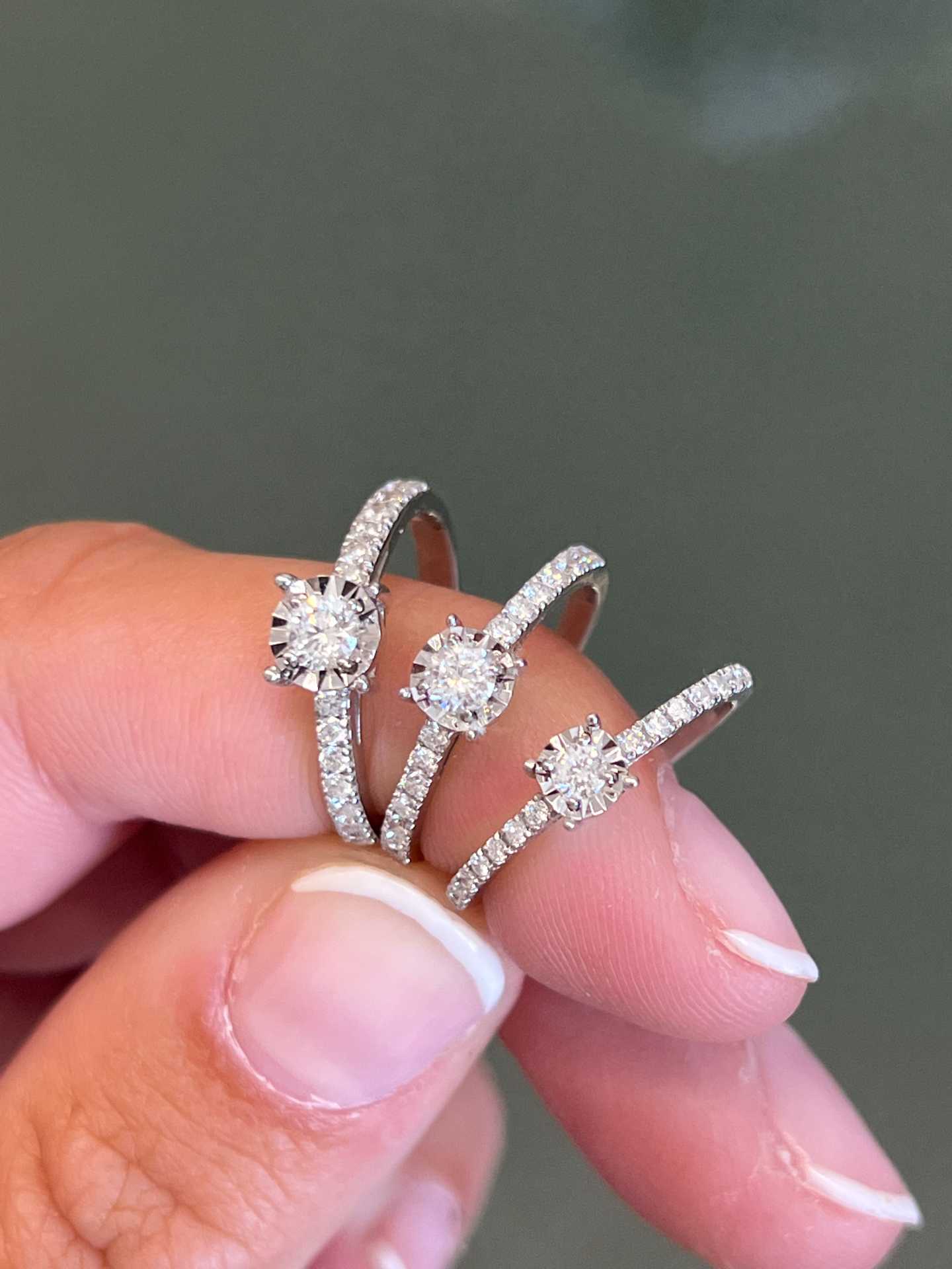 Precious gem: 1 brilliant cut diamond: A.(0.09 carats center + 14 of 0.14 carats), B.(0.20 carats center + 14 of 0.28 carats) and C. (0.24 carats center + 14 of 0.27 carats)