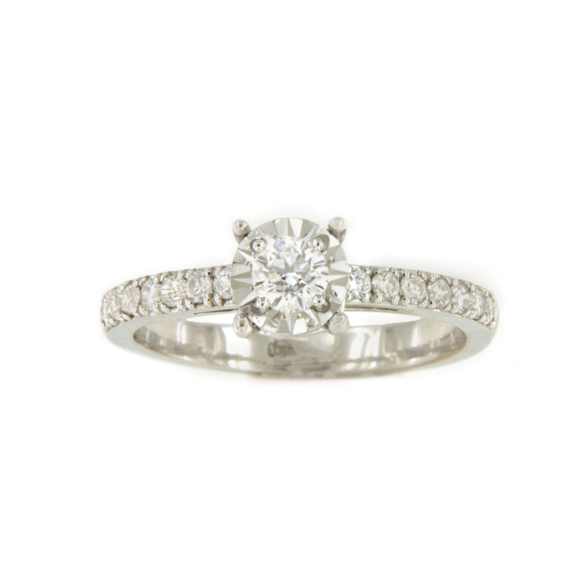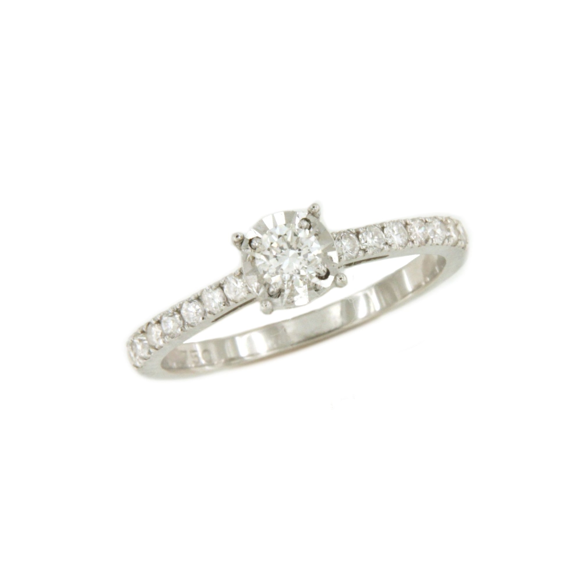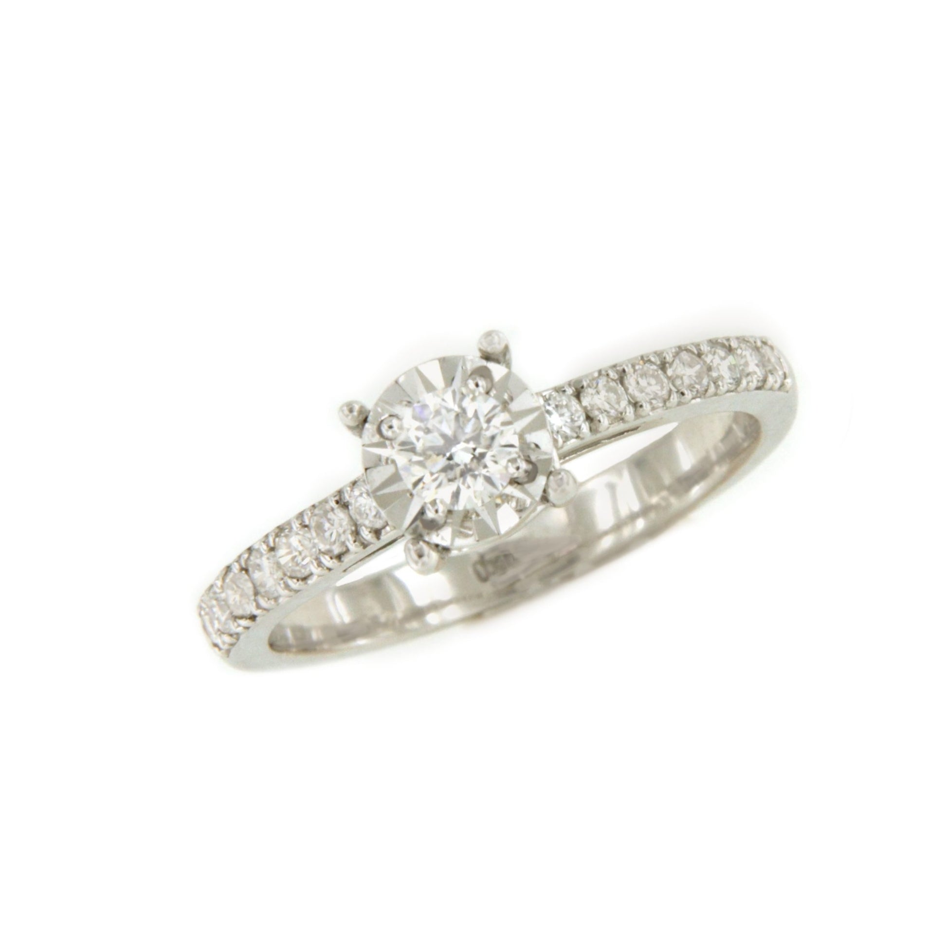 CHAMBERY , a beautiful solitaire diamond ring with a diamond-set band, crafted in 18k white gold with a diamond-cut edge that enhances its beauty. Perfect for proposals and engagements.