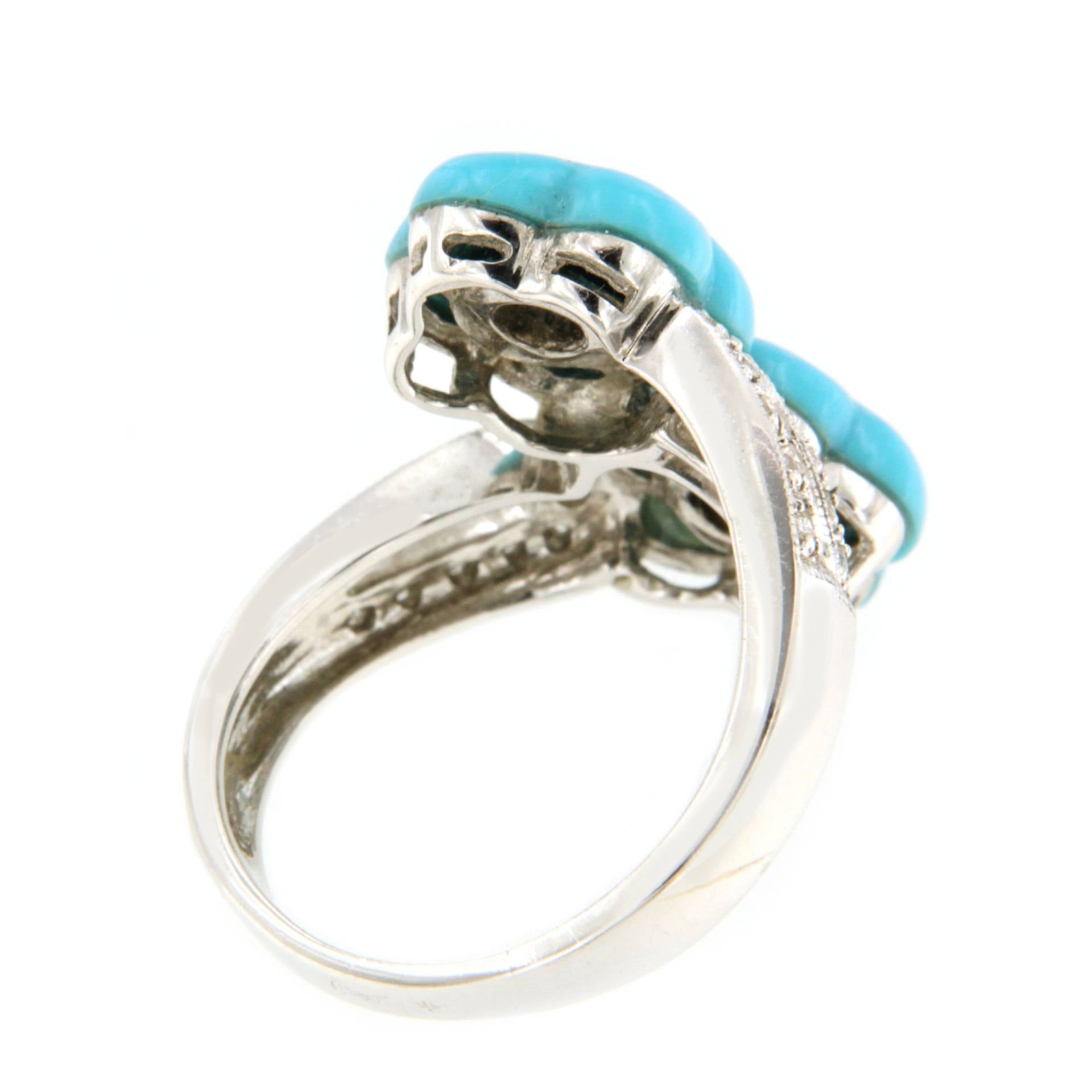 COLUNGA is a ring with a turquoise flower design, a "you and me" style , with brilliant-cut diamonds in the centers and arms. It is crafted in 18-karat white gold.