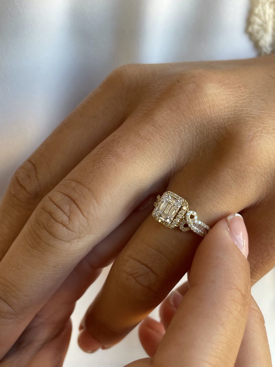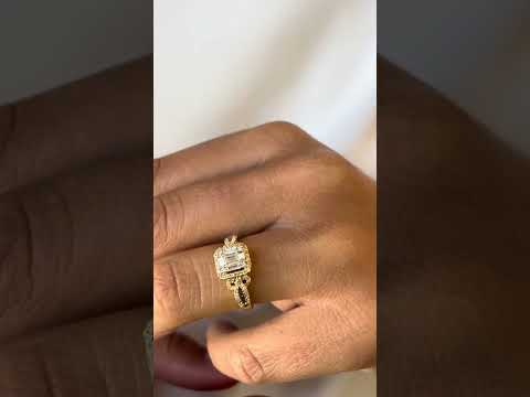 "DESCARADO " is a diamond centerpiece ring with baguette and brilliant-cut diamonds in 18-karat yellow gold, set with baguettes on the bands. A beautiful gift or proposal.