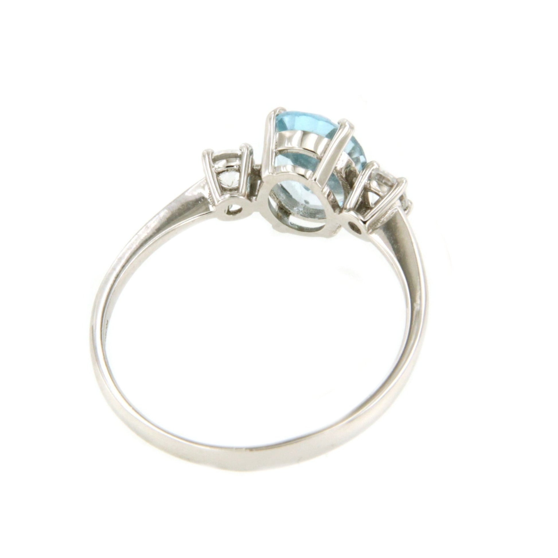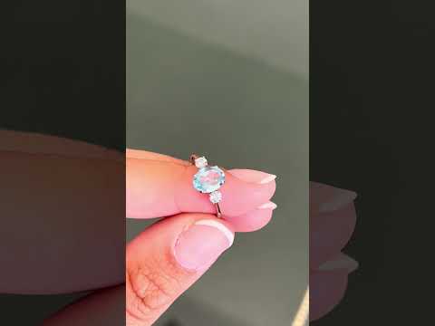 ESENCIA is a classic style ring mounted in 18-karat white gold with an oval-cut blue topaz with an aquamarine hue and two cubic zirconias on each side.