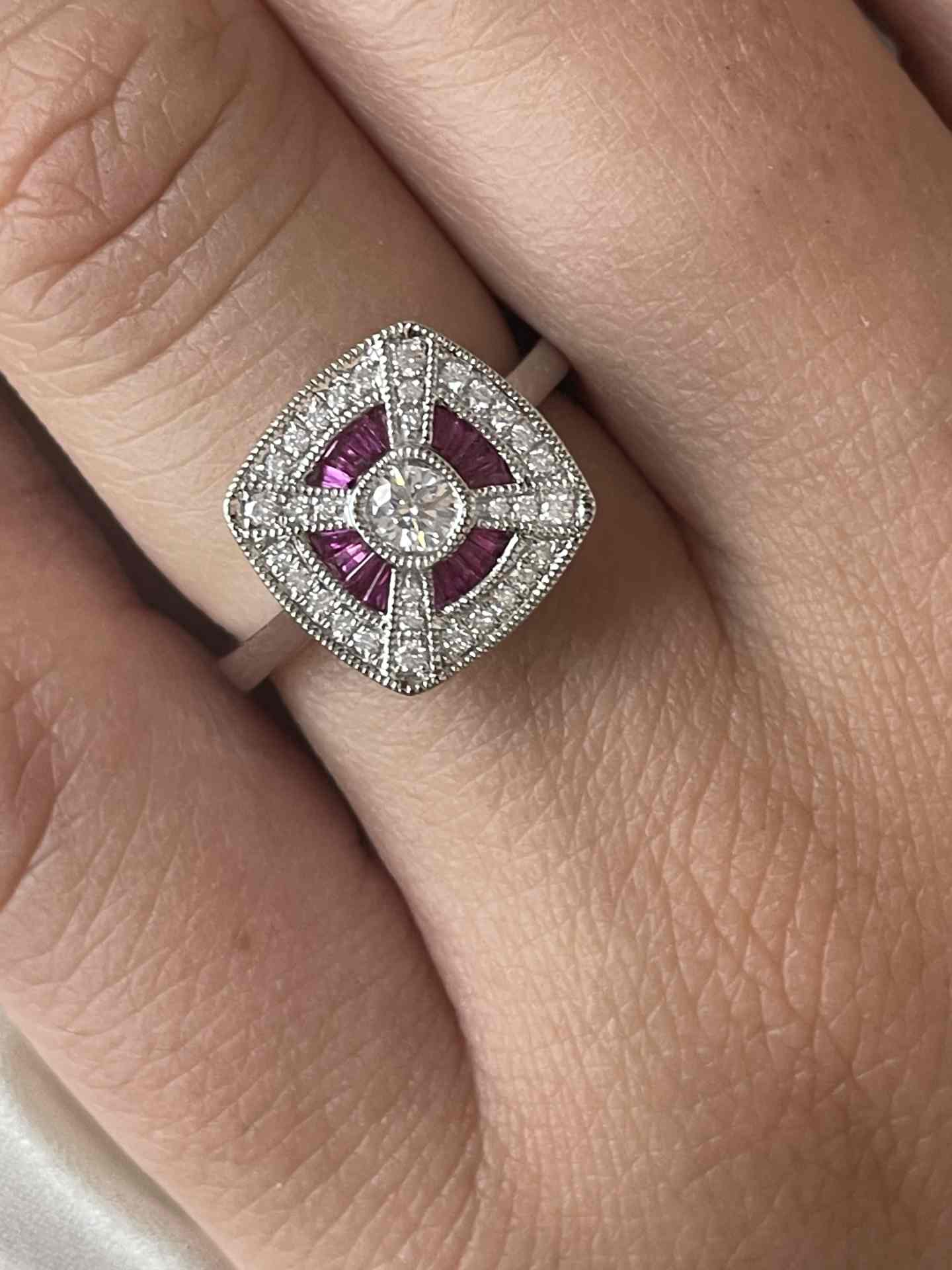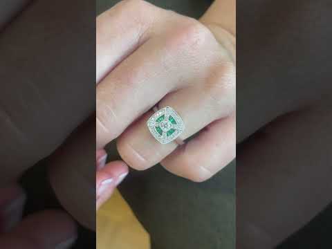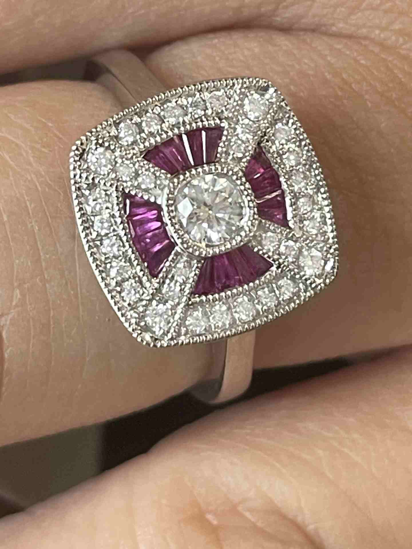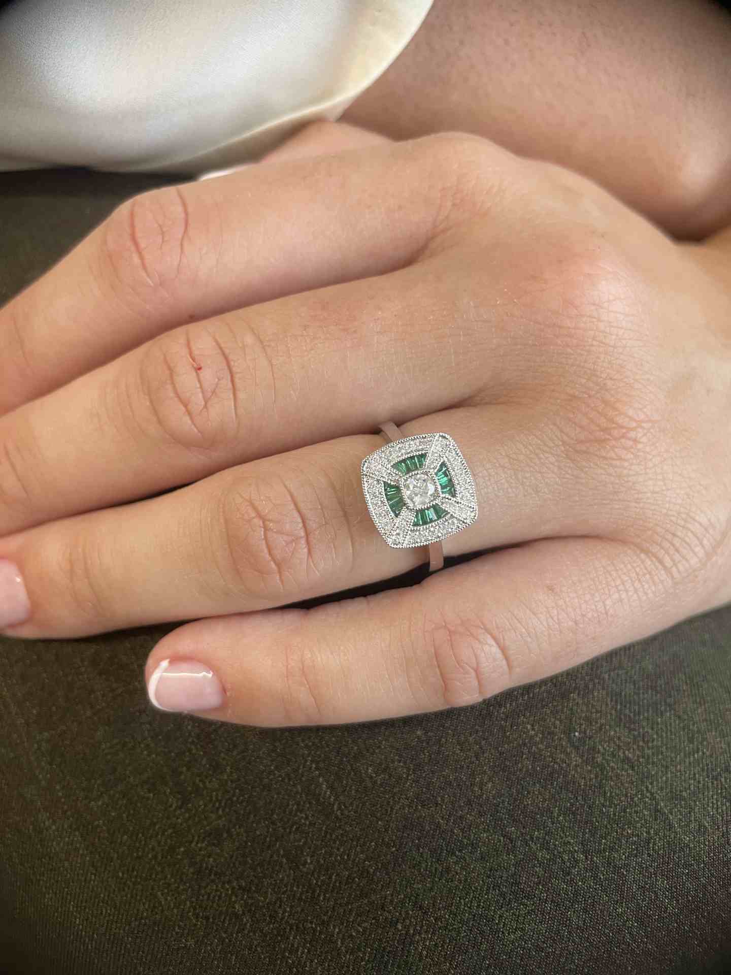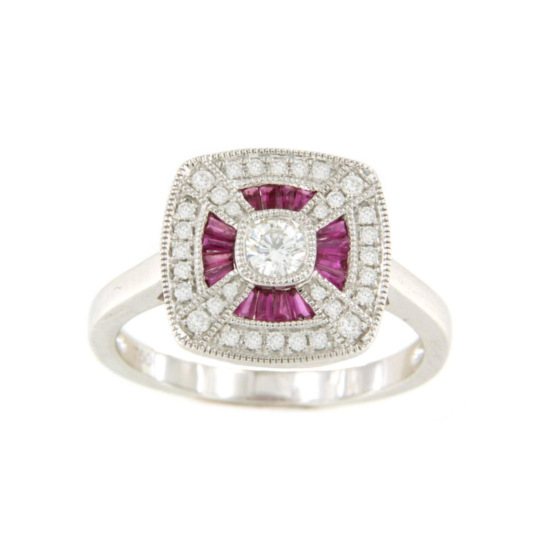 JORDAN is an art deco style ring, with a center of diamonds surrounded by accents of emeralds, rubies or sapphires and with a cross of diamonds also on its outline.