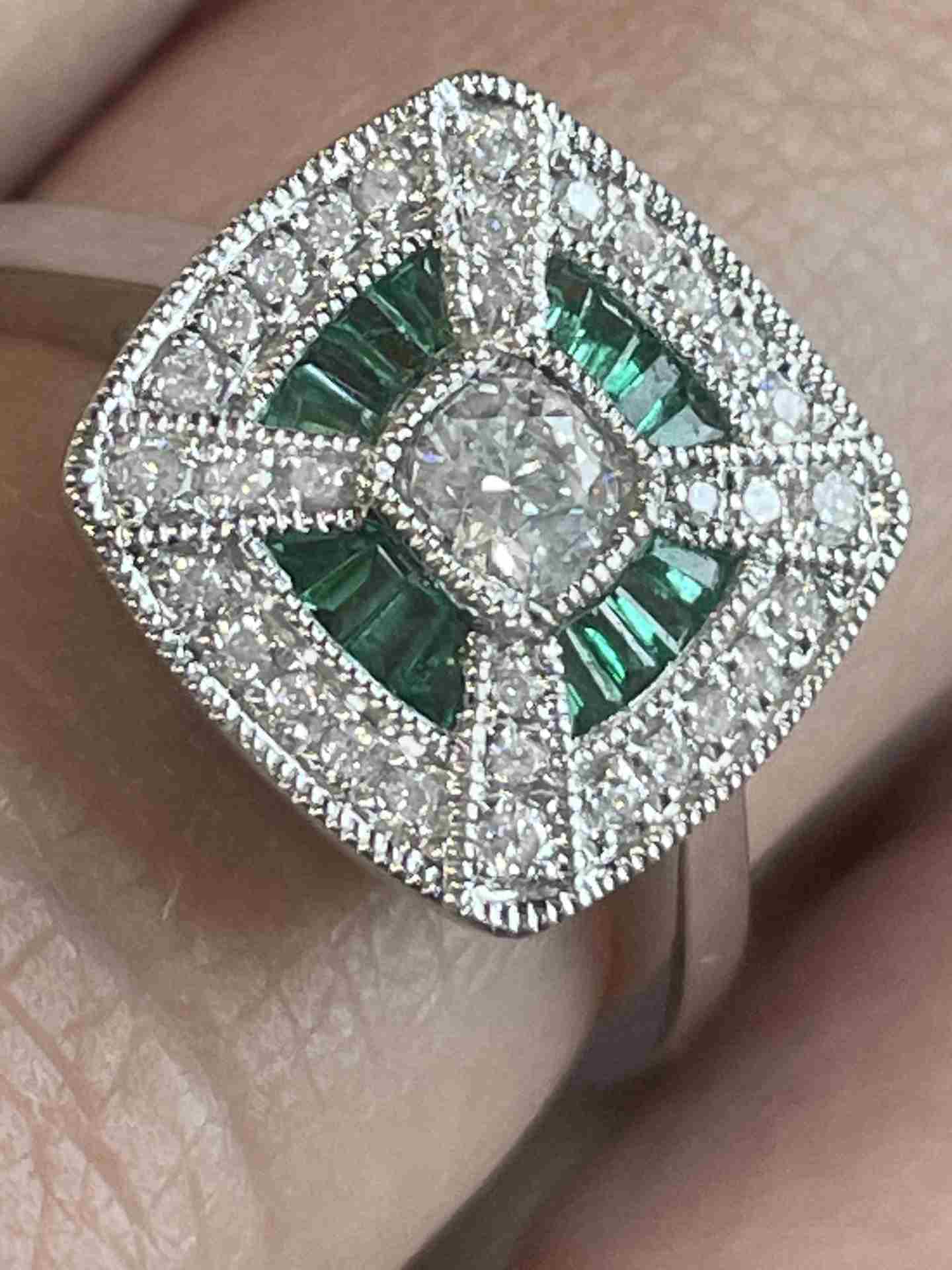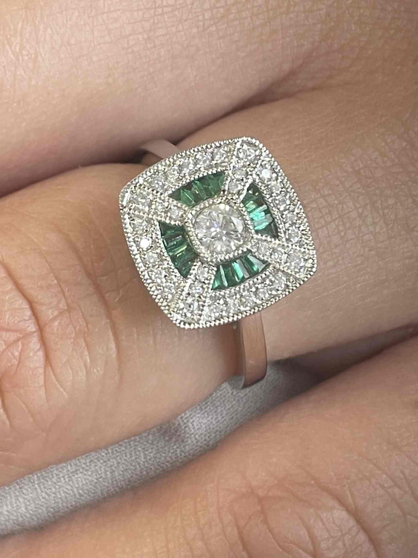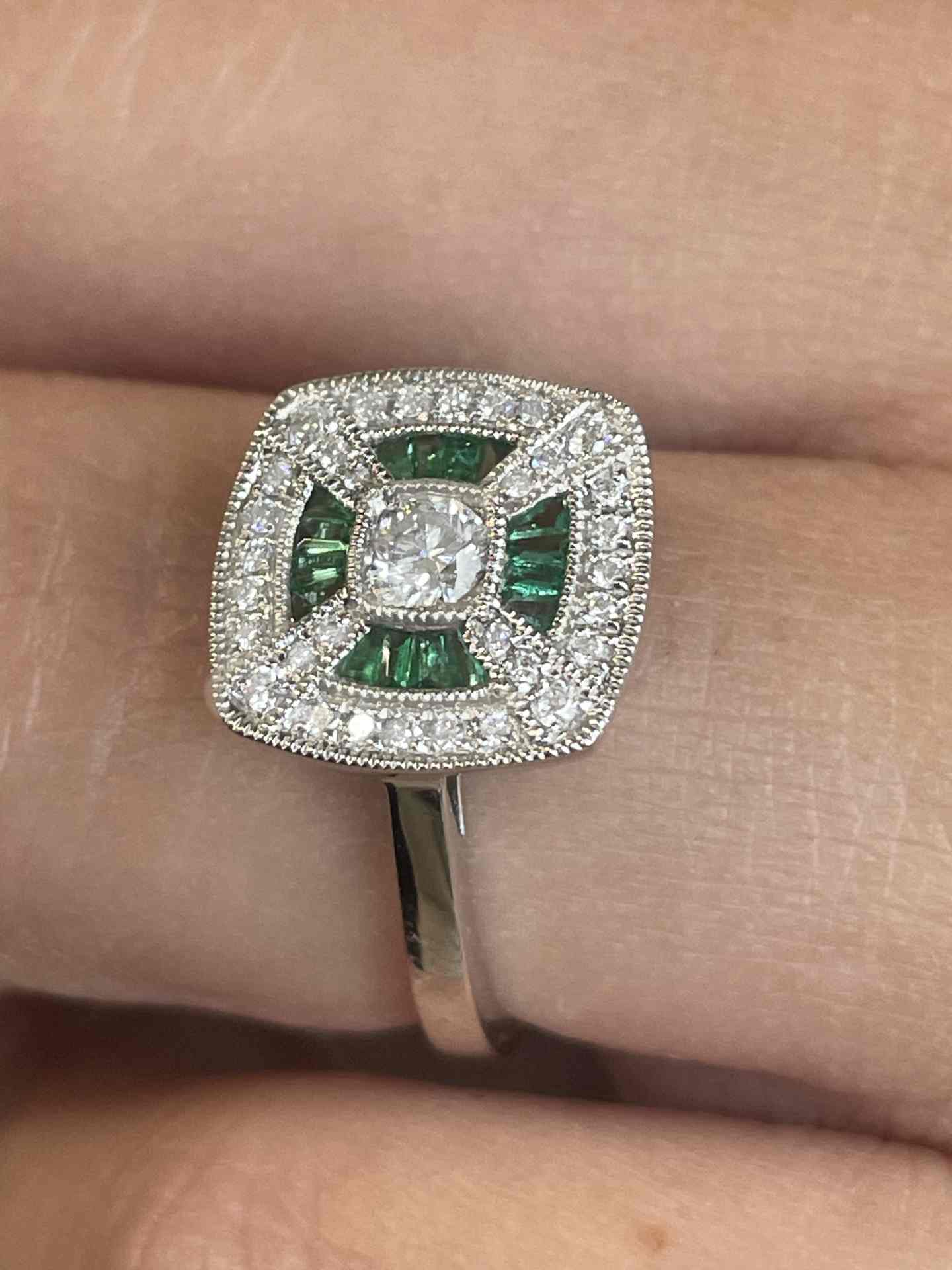 JORDAN is an art deco style ring, with a center of diamonds surrounded by accents of emeralds, rubies or sapphires and with a cross of diamonds also on its outline.