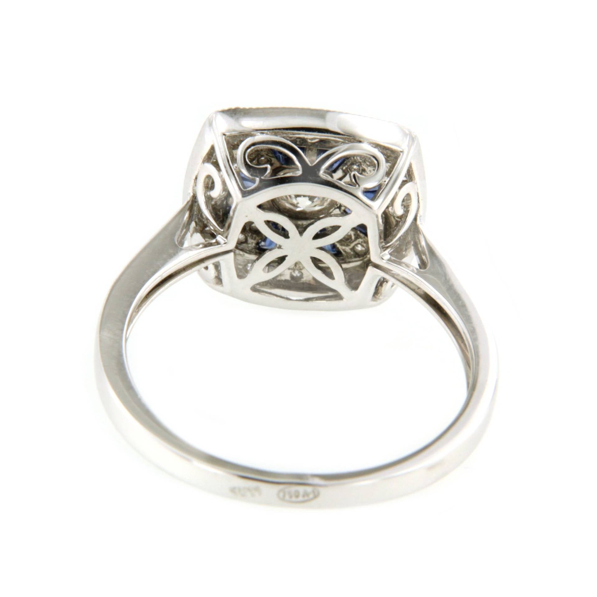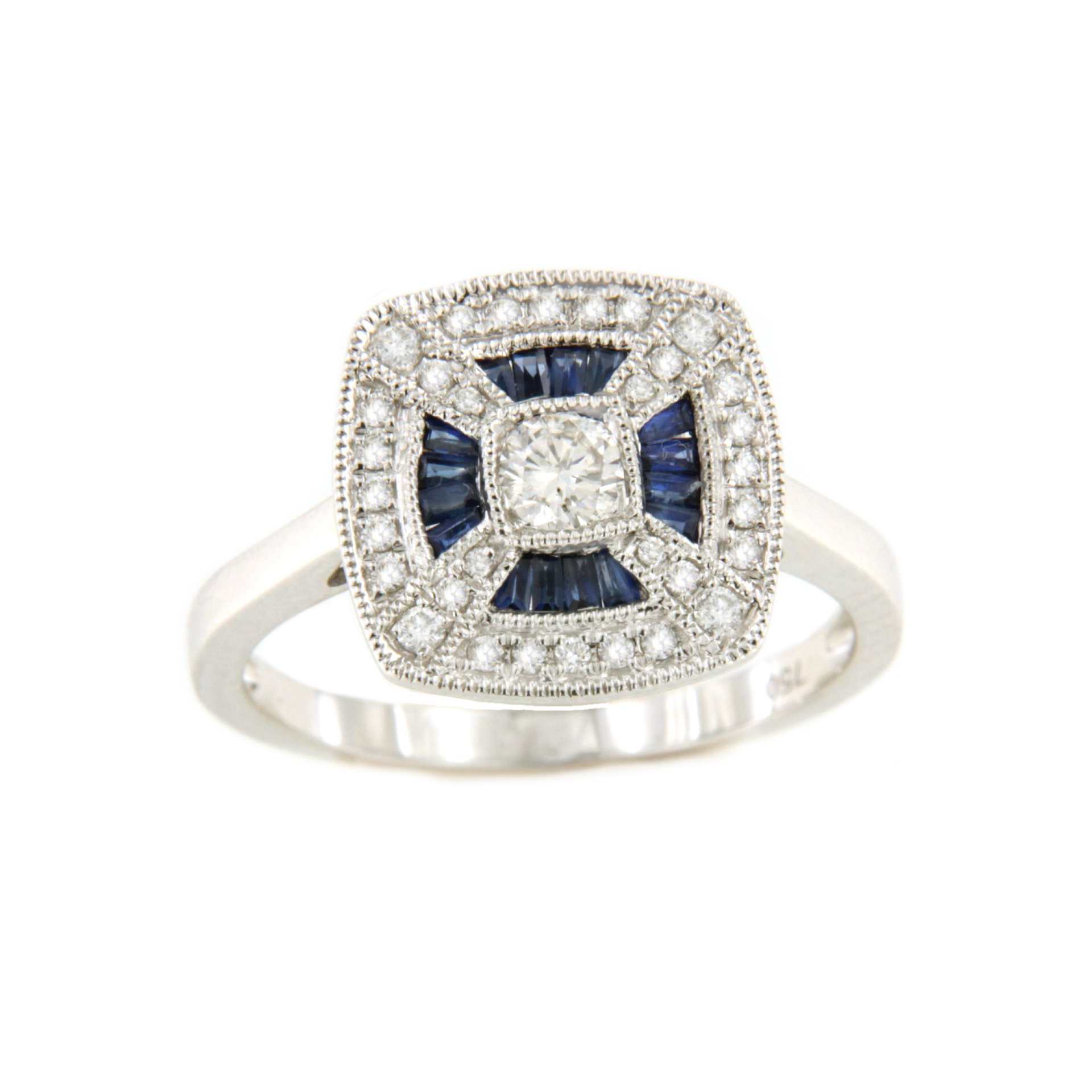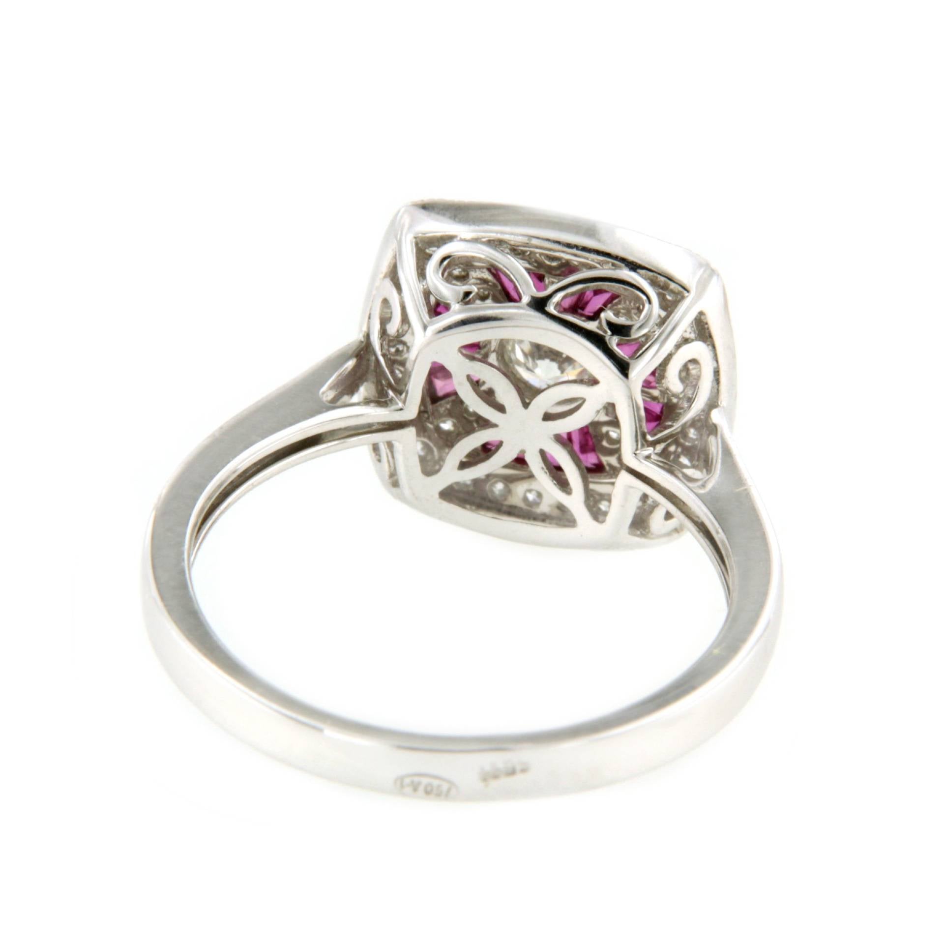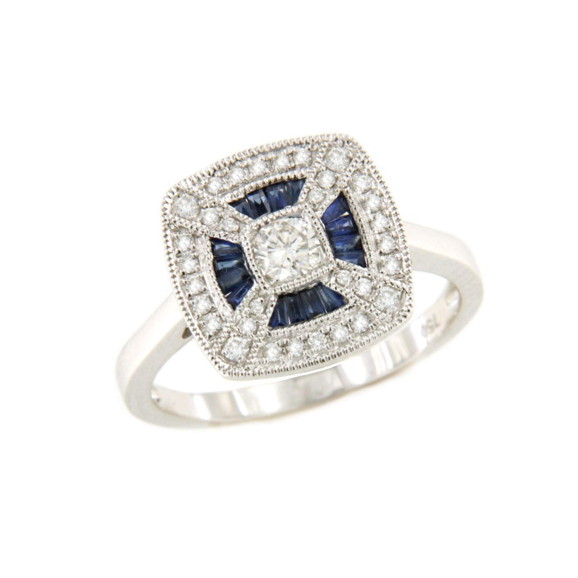 JORDAN is an art deco style ring, with a center of diamonds surrounded by accents of emeralds, rubies or sapphires and with a cross of diamonds also on its outline.