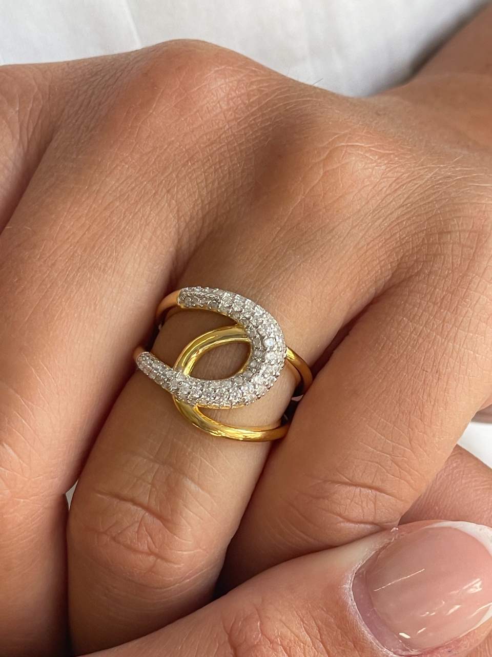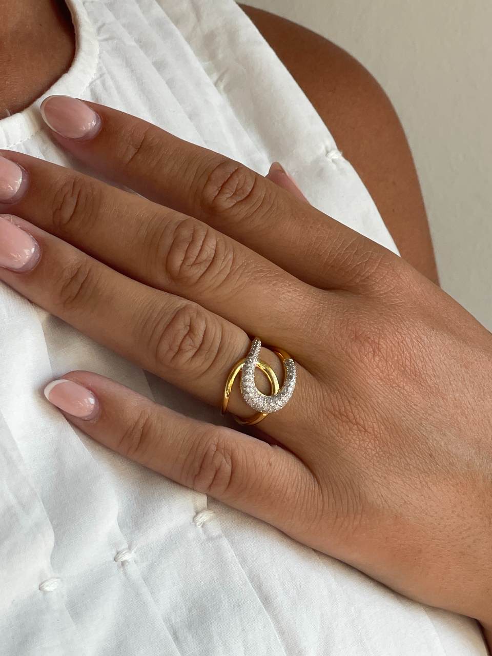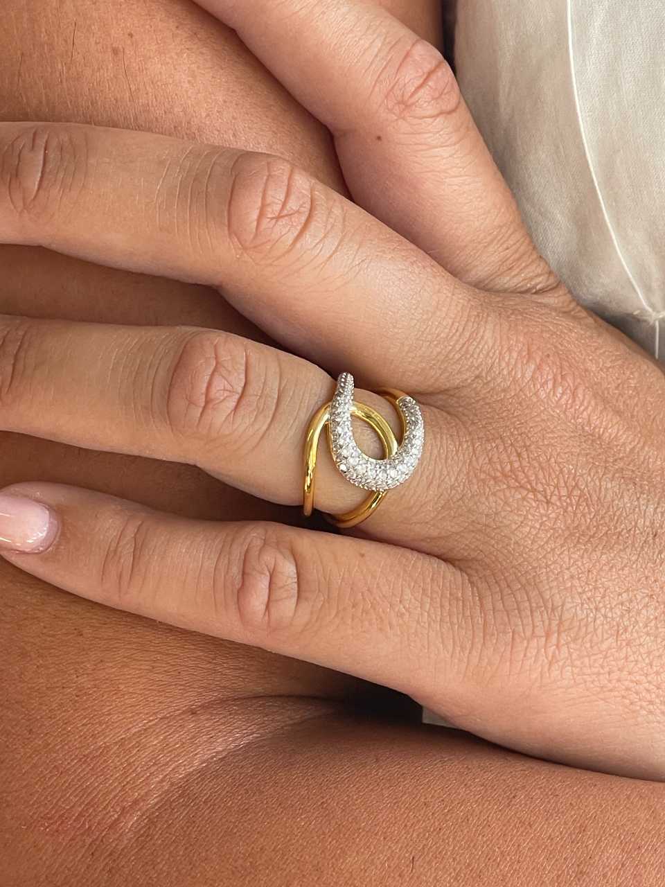 LUMINA is a ring that stands out for its sophisticated simplicity and warm finish in sterling silver with an 18-karat yellow gold plating. A piece with clean, timeless lines , perfect for wearing alone or layered with other rings.