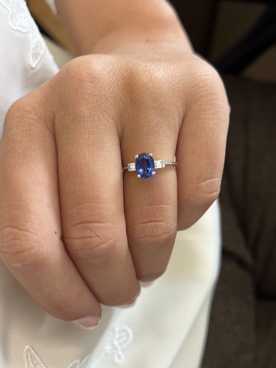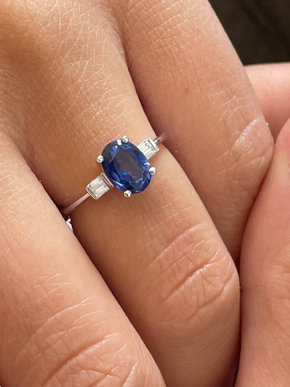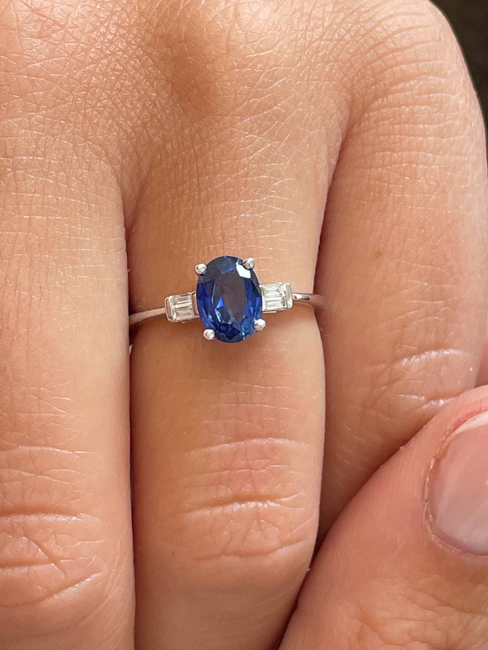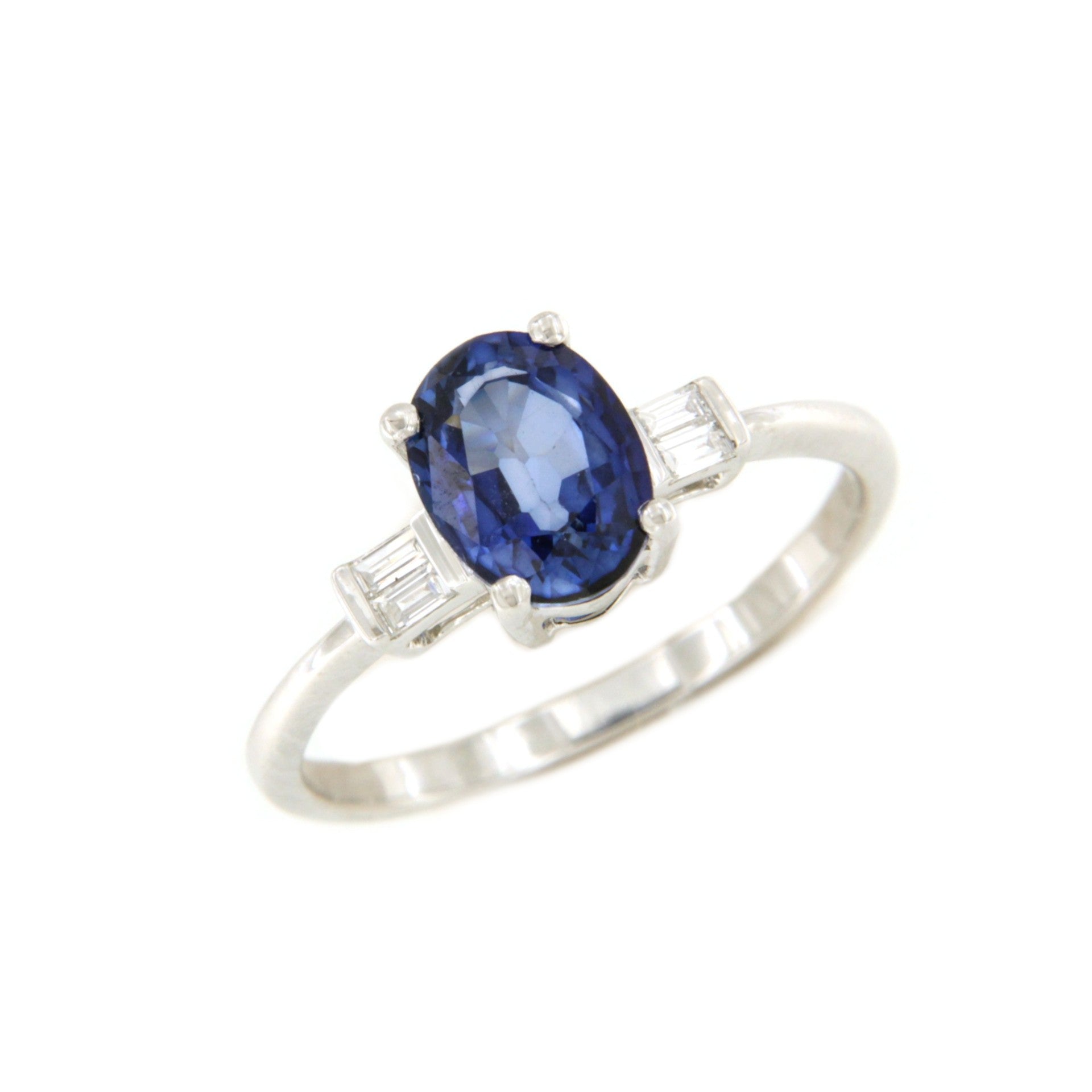 Precious gem: 1 oval diffusion sapphire 1.68 carats and 4 baguette cut diamonds 0.08 carats.