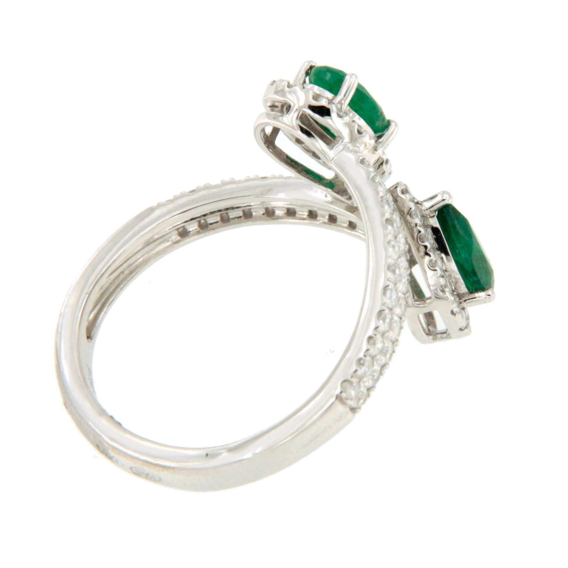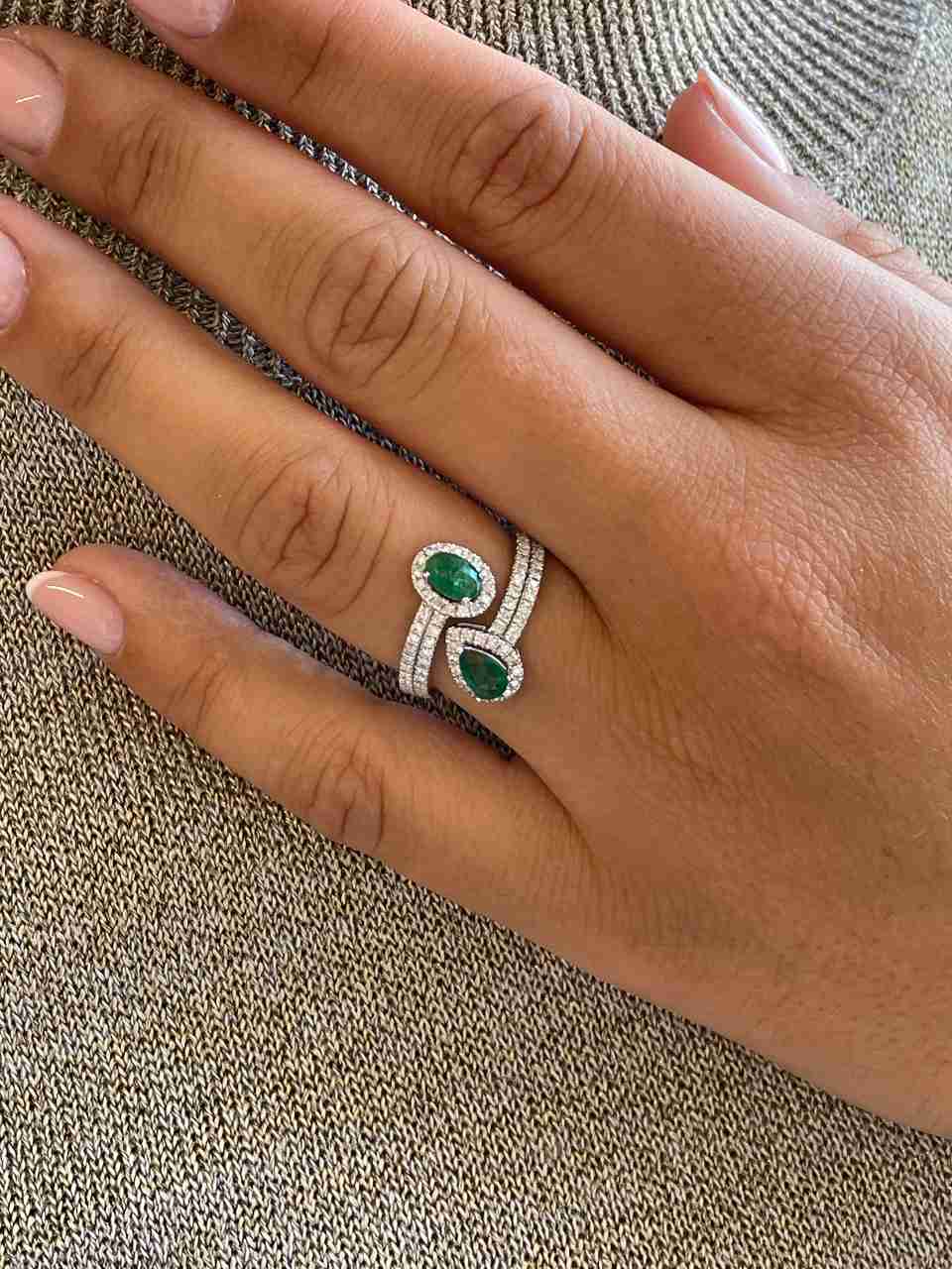 NONI is a beautiful ring with a "you and me" design, featuring pear- and oval-cut emerald rosettes and diamonds on the band. It is crafted in 18-karat white gold.