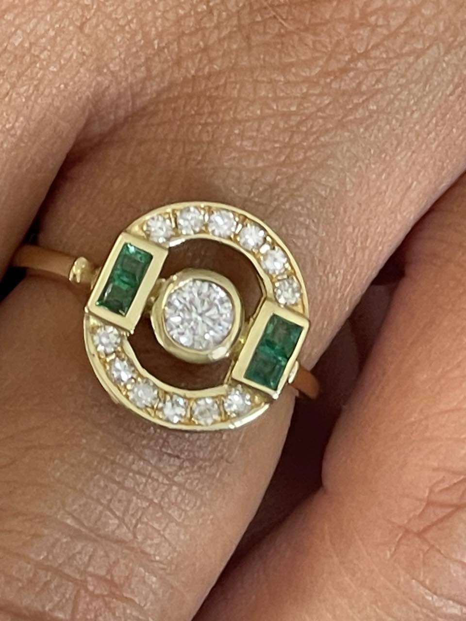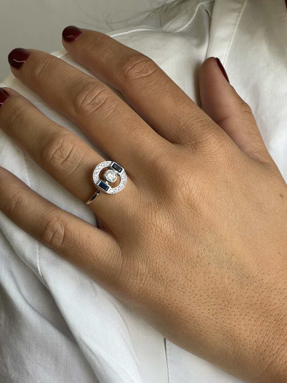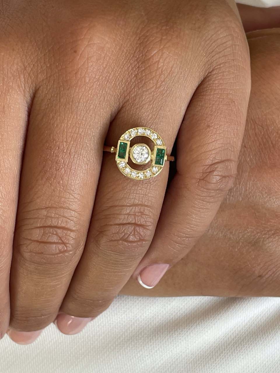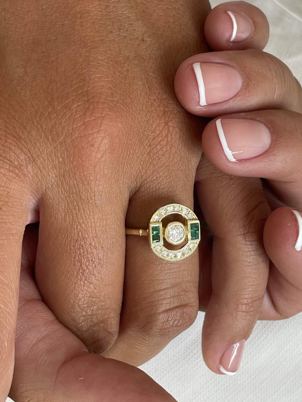 PACIFICO is an 18-karat yellow or white gold ring featuring a brilliant-cut diamond centerpiece set in a bezel , surrounded by a disc of brilliant-cut diamonds and a carret of emeralds or baguette-cut sapphires. A very popular choice for engagements!