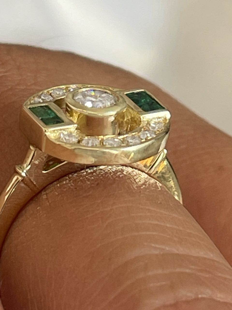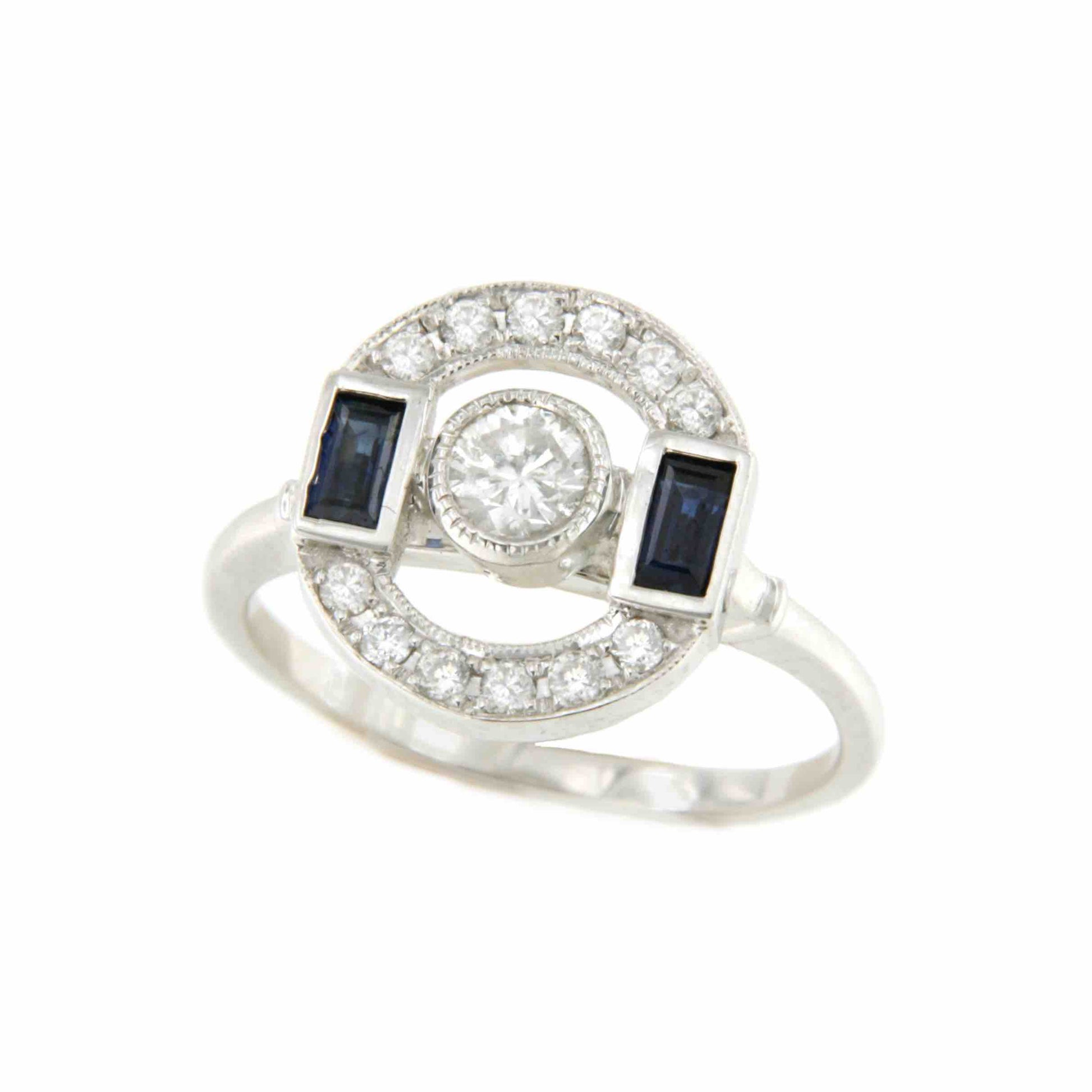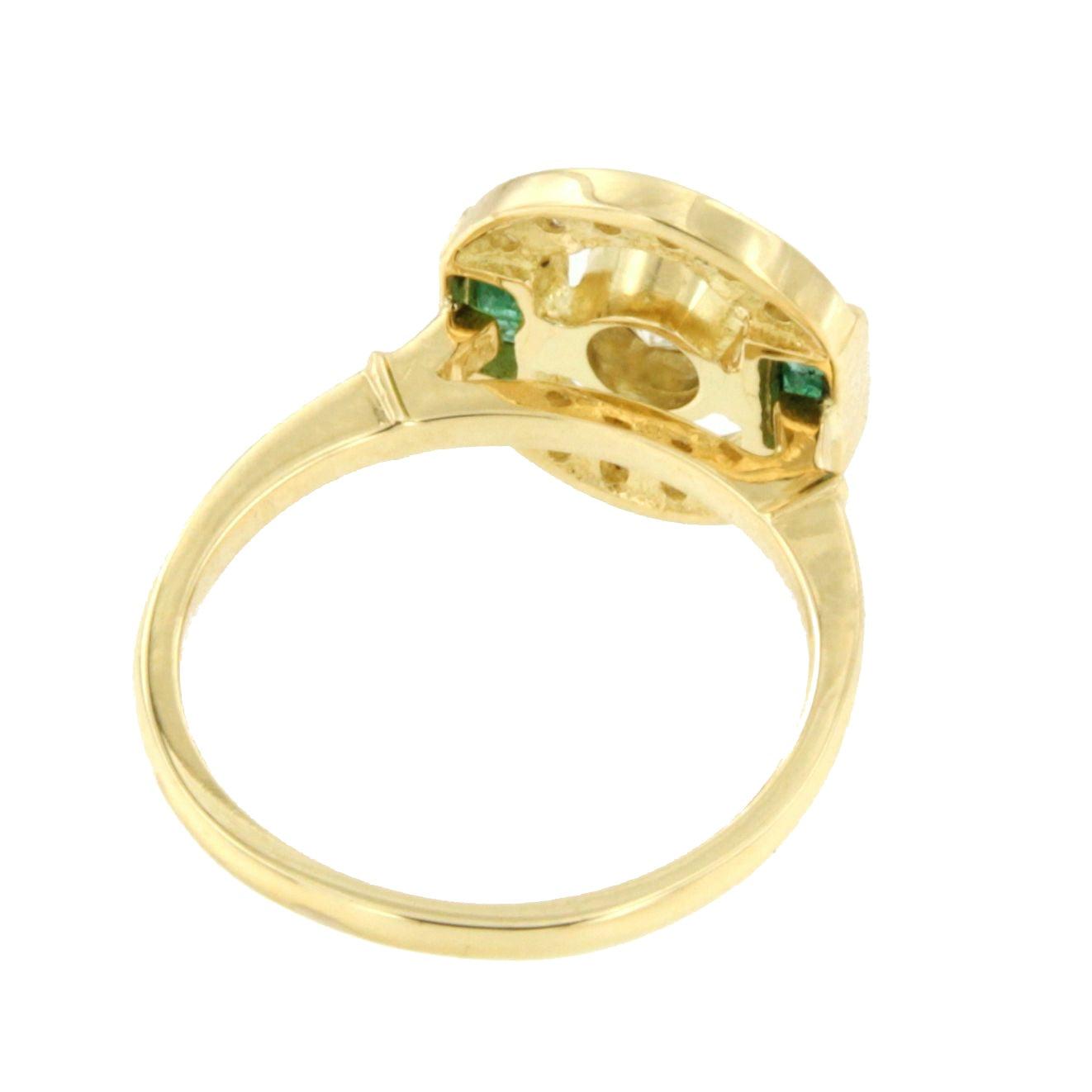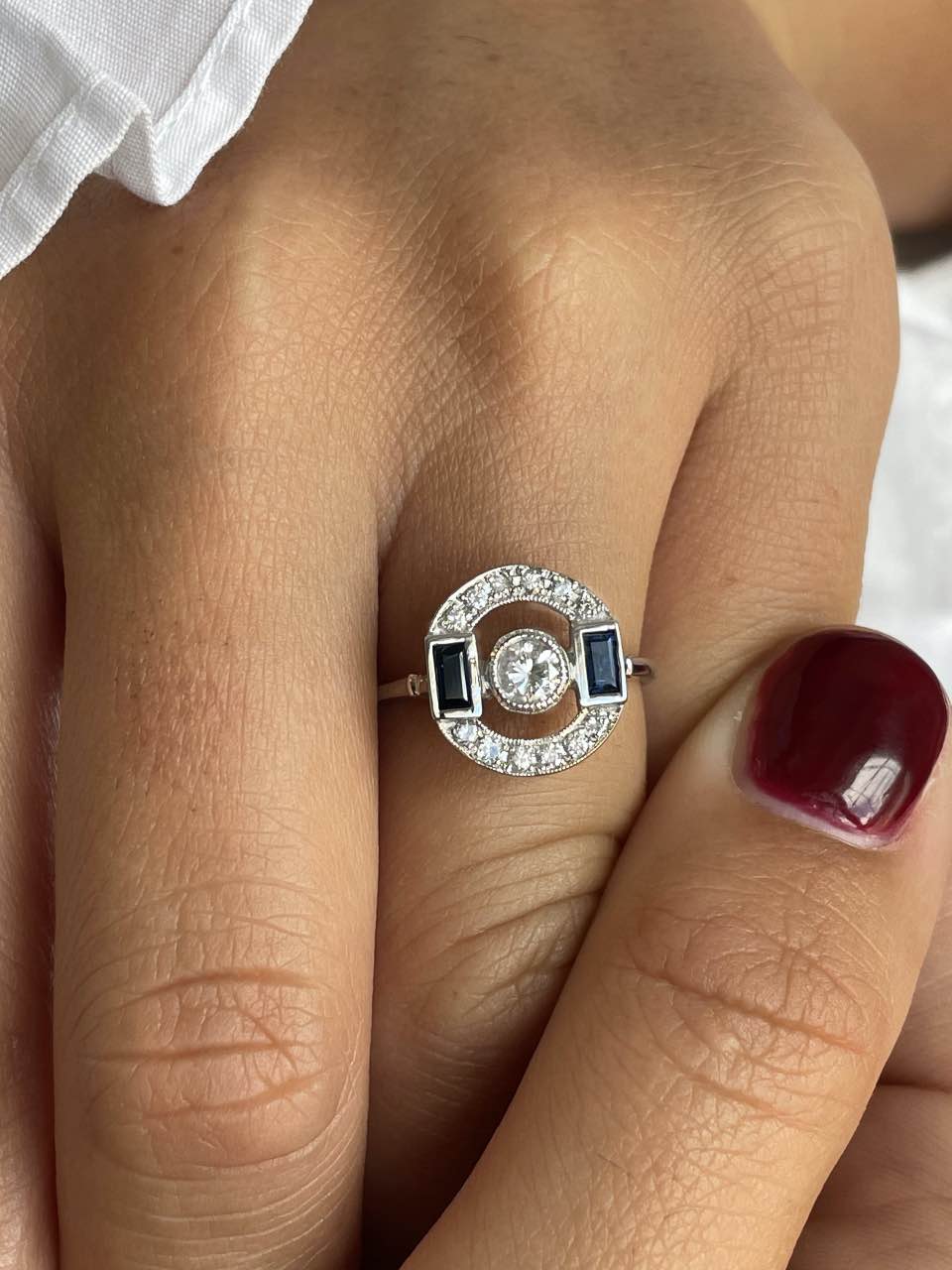 PACIFICO is an 18-karat yellow or white gold ring featuring a brilliant-cut diamond centerpiece set in a bezel , surrounded by a disc of brilliant-cut diamonds and a carret of emeralds or baguette-cut sapphires. A very popular choice for engagements!