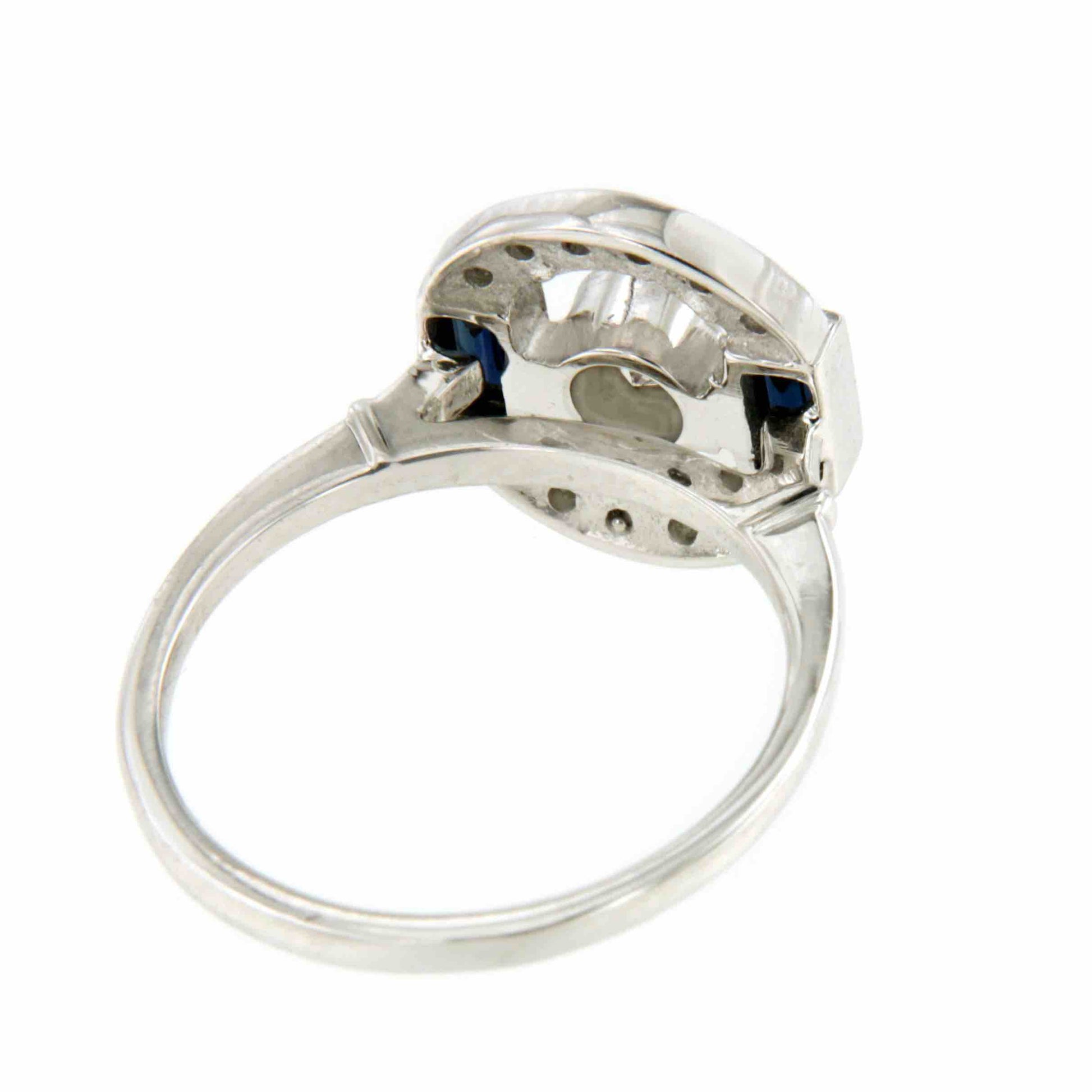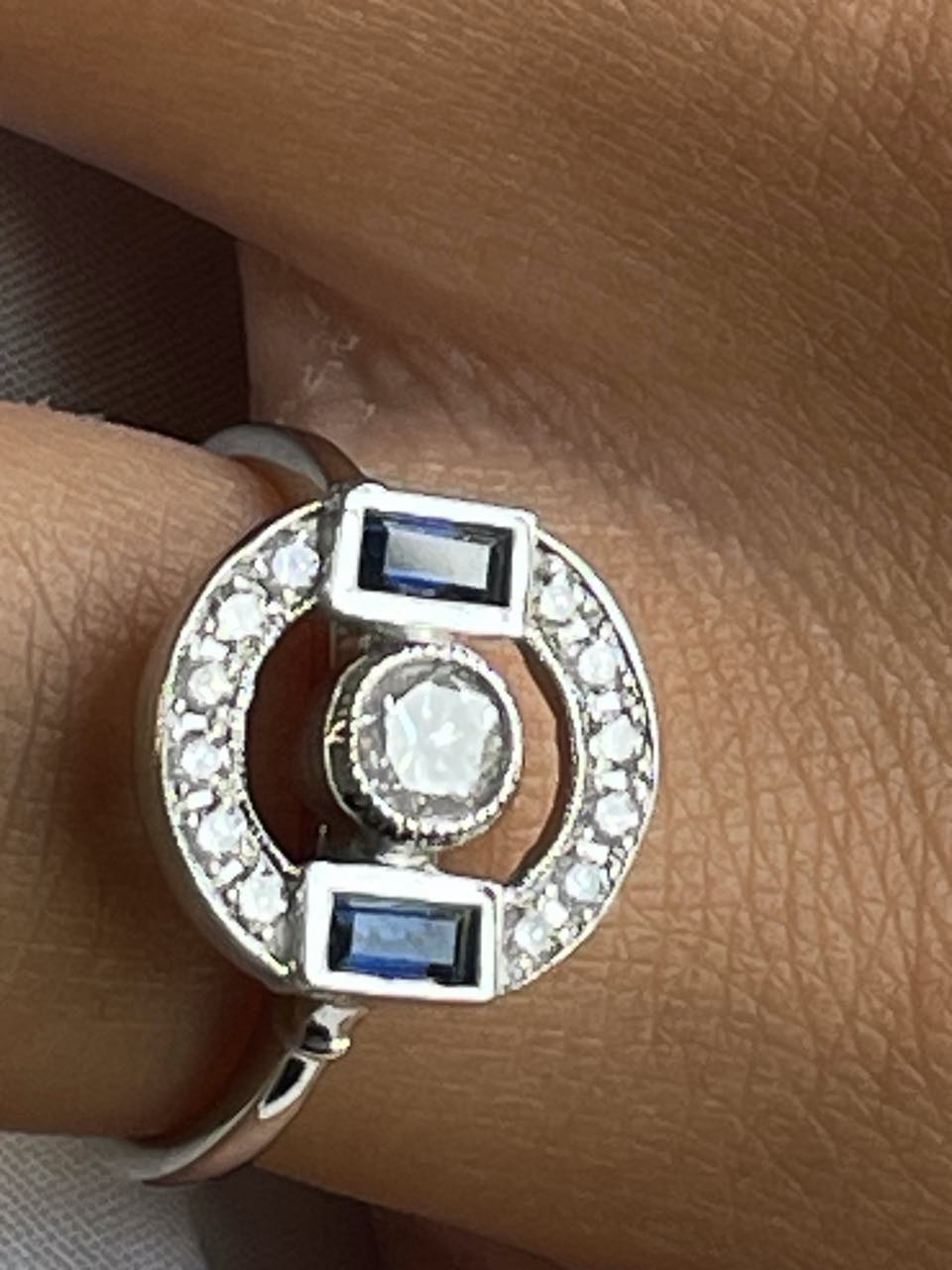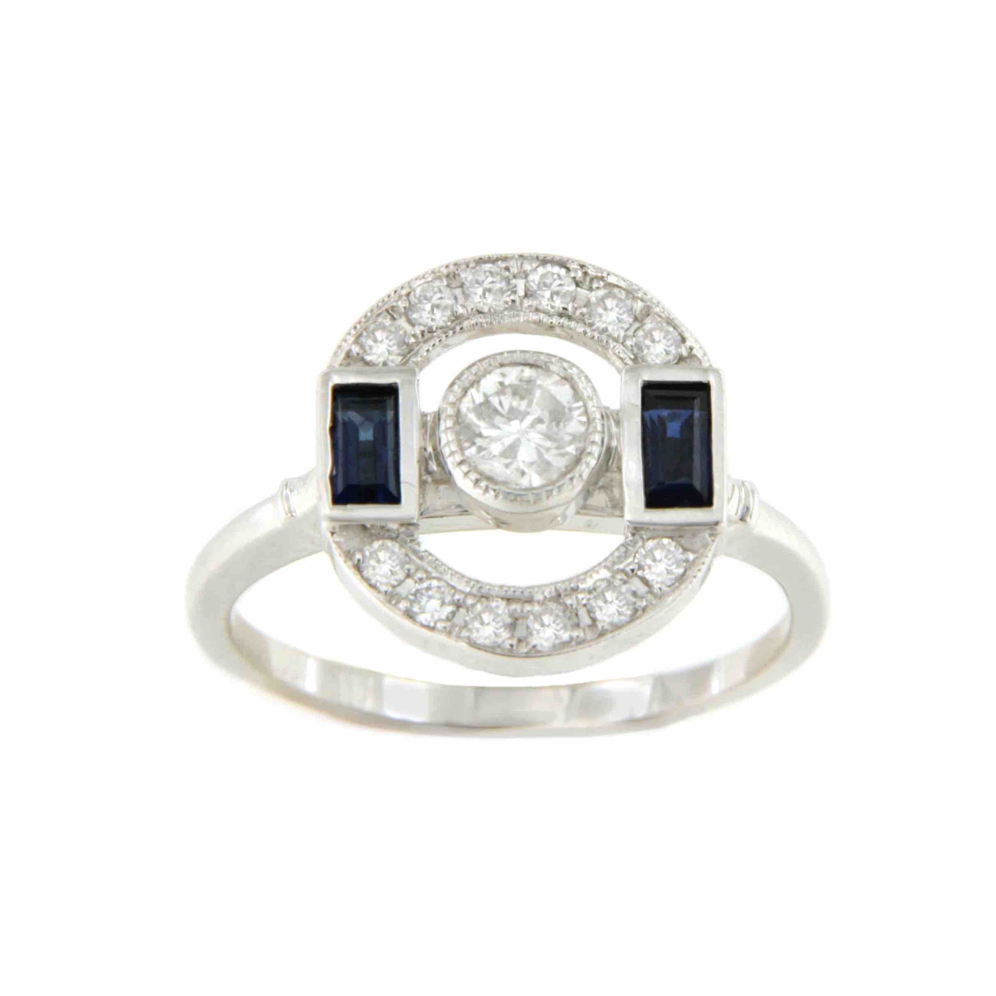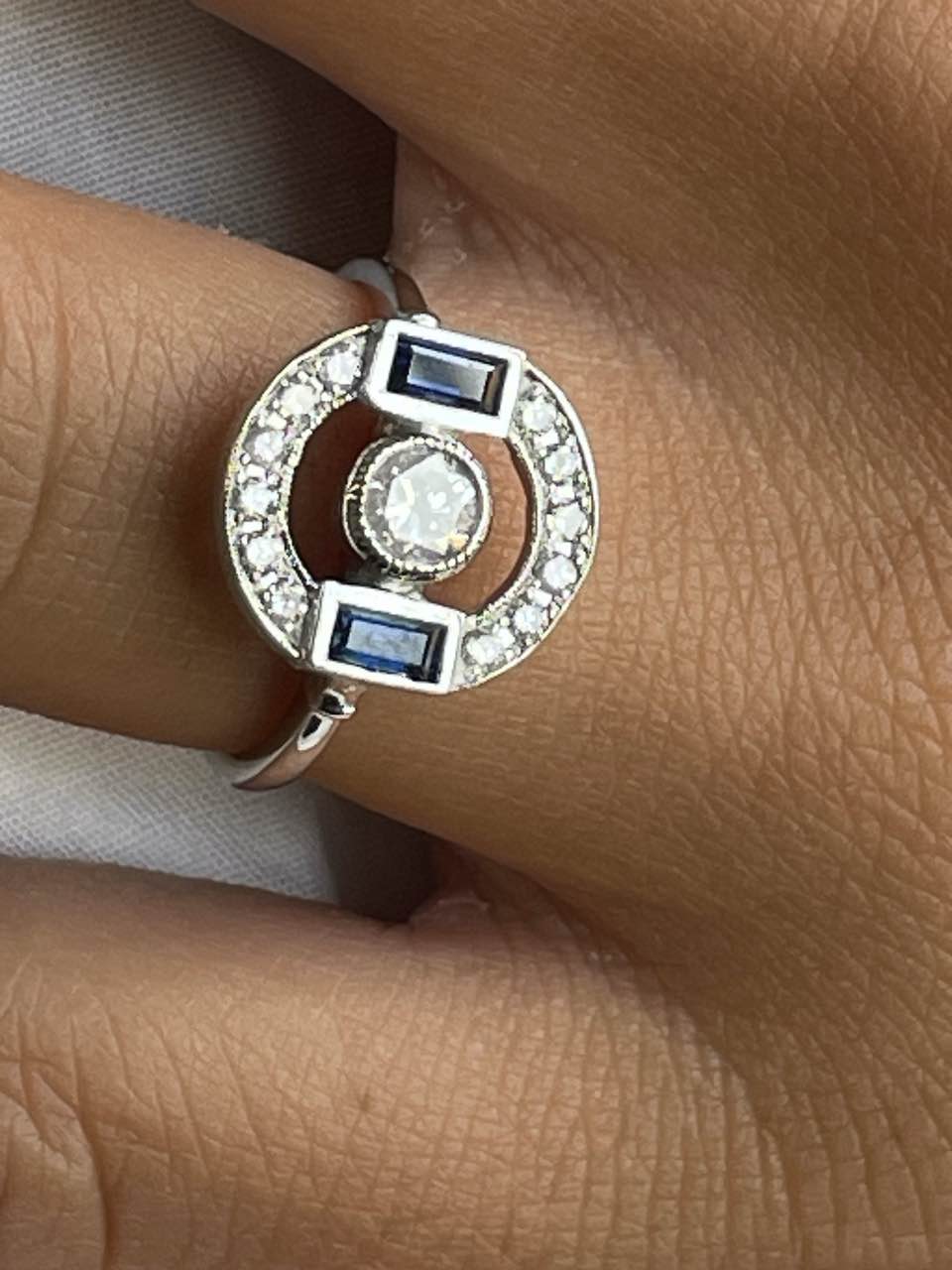PACIFICO is an 18-karat yellow or white gold ring featuring a brilliant-cut diamond centerpiece set in a bezel , surrounded by a disc of brilliant-cut diamonds and a carret of emeralds or baguette-cut sapphires. A very popular choice for engagements!
