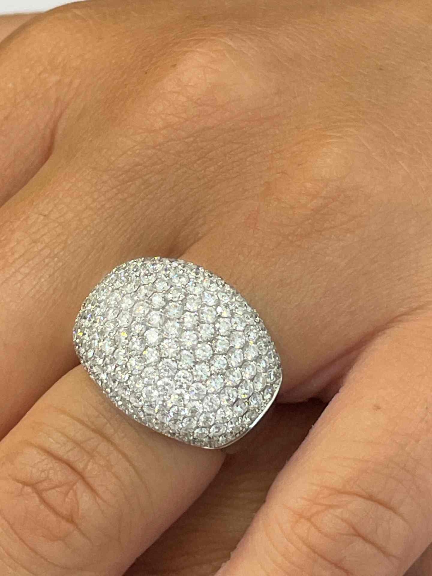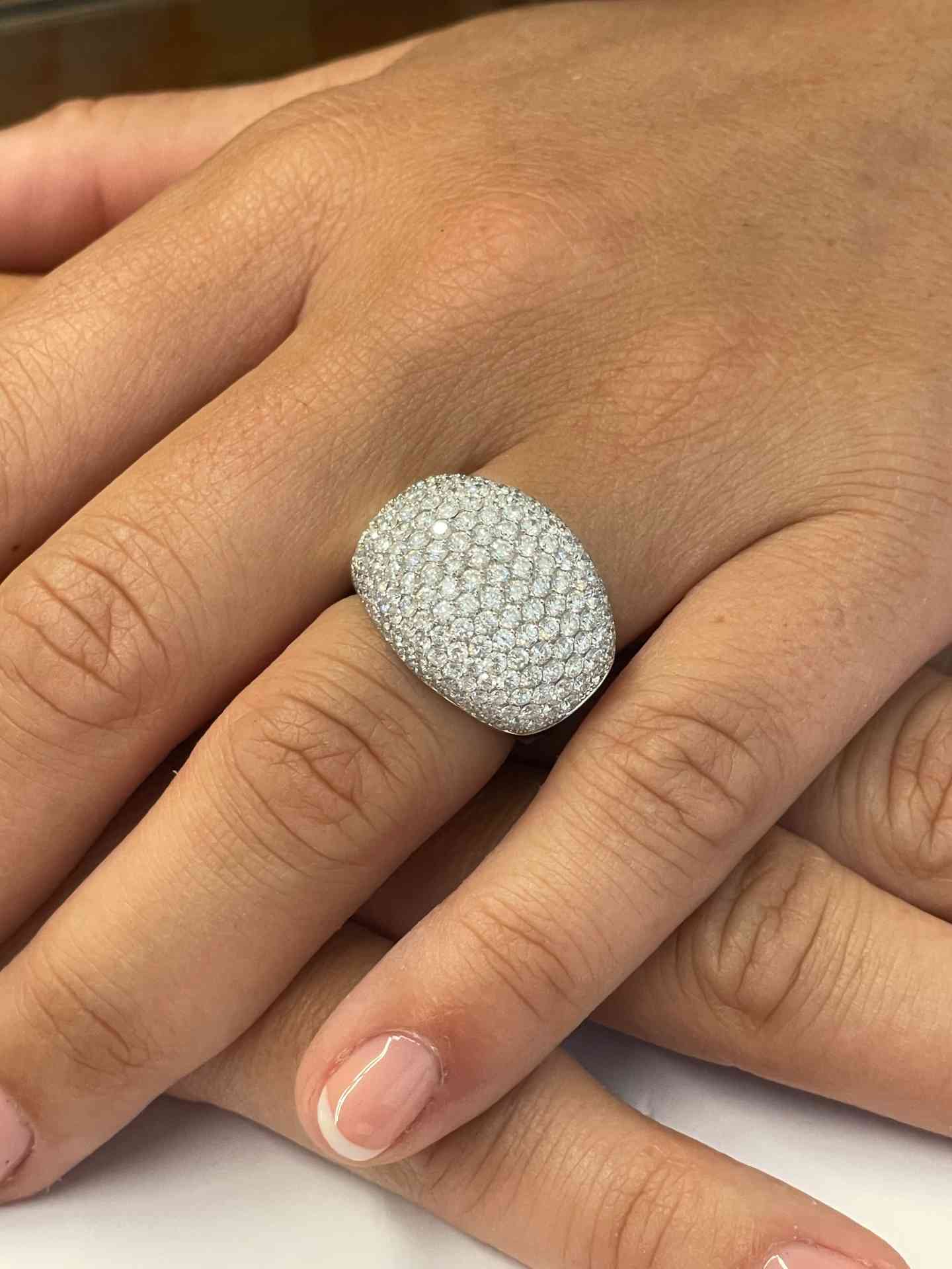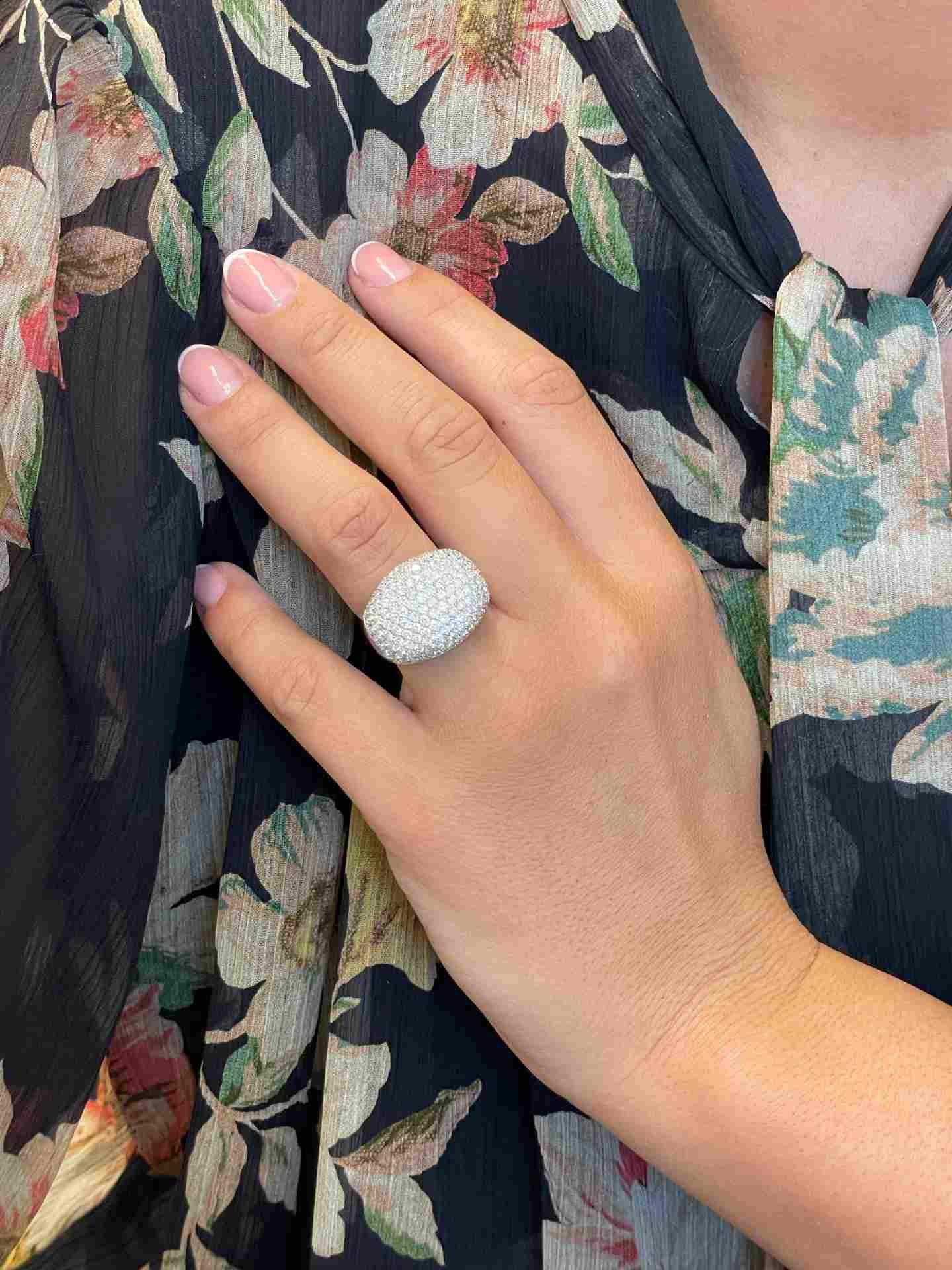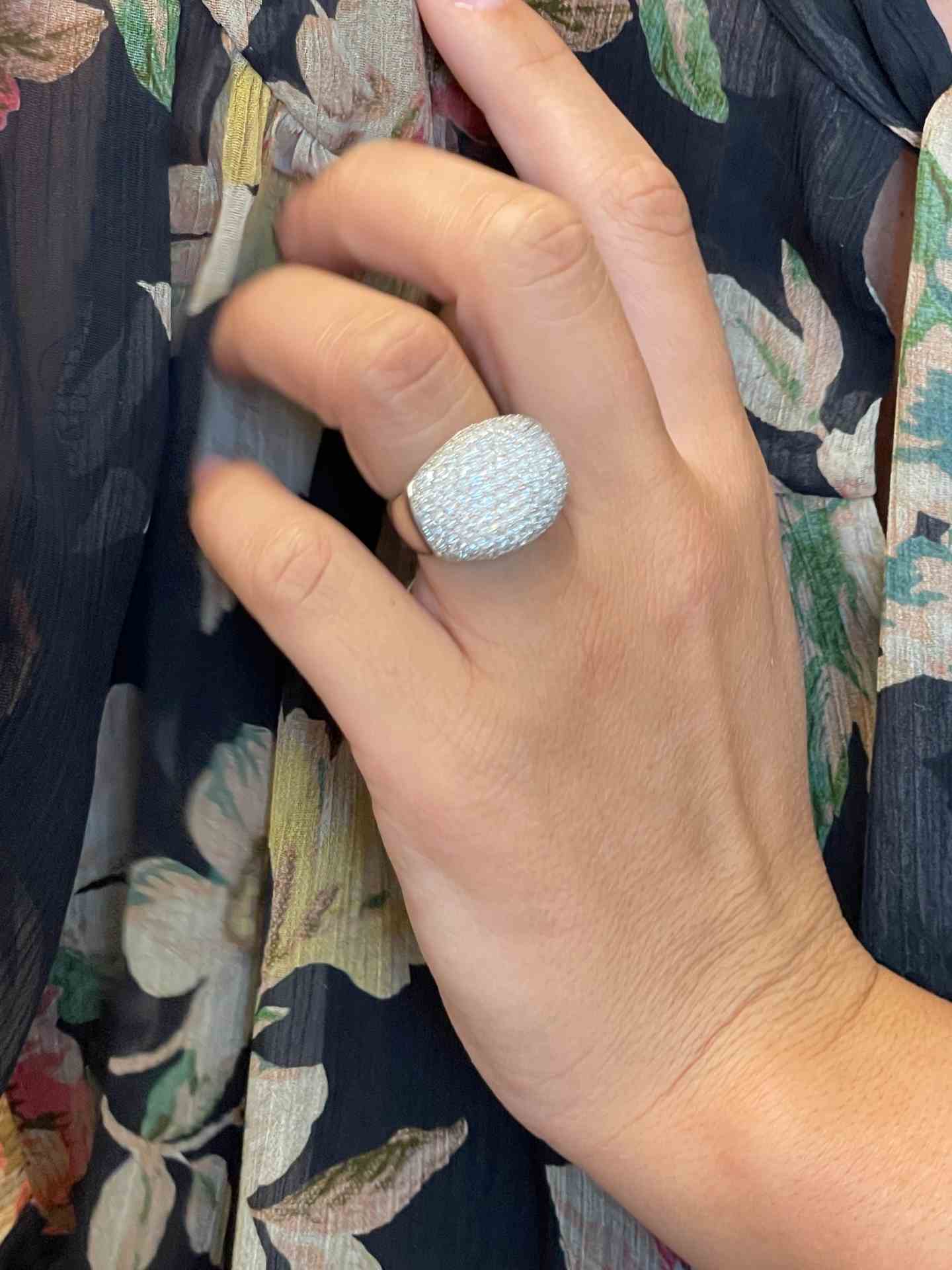 PALAMOS is a wide, rounded ring with tapered arms set with pave diamonds, very much in the Italian style and made of 18-karat white gold.