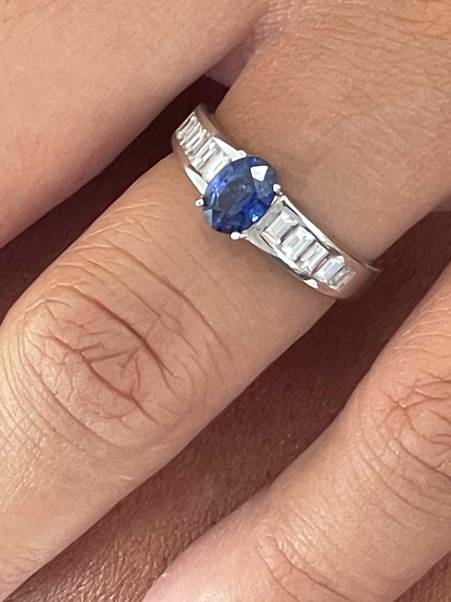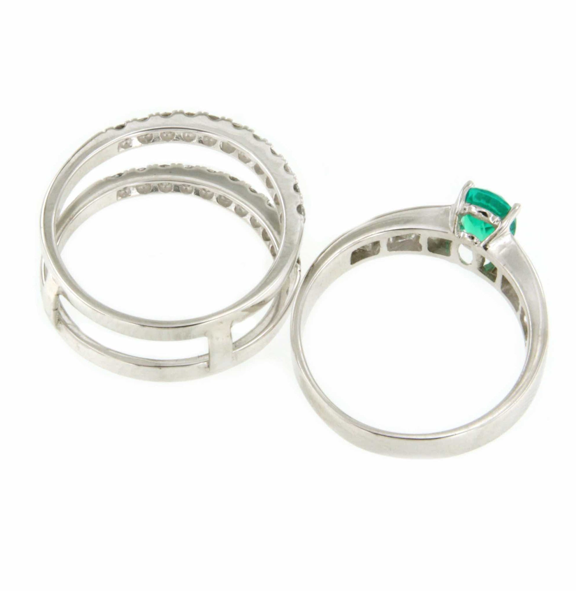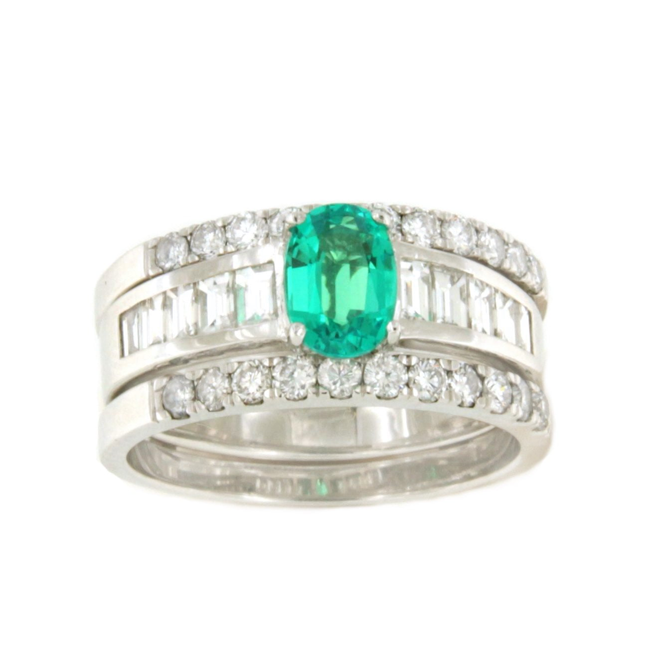 PELEGRINO is a stunning 18k white gold duo ring, featuring a double band of diamonds and a second band set as a solitaire with an emerald or sapphire in prongs, flanked by baguette-cut stones. A spectacular engagement ring!