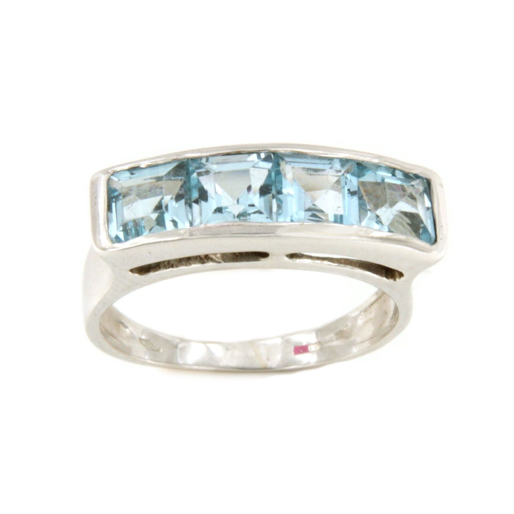 PILOÑA is a ring with a classic design, featuring four princess-cut blue quartz stones set in a gallery. It is crafted in 18-karat white gold.
