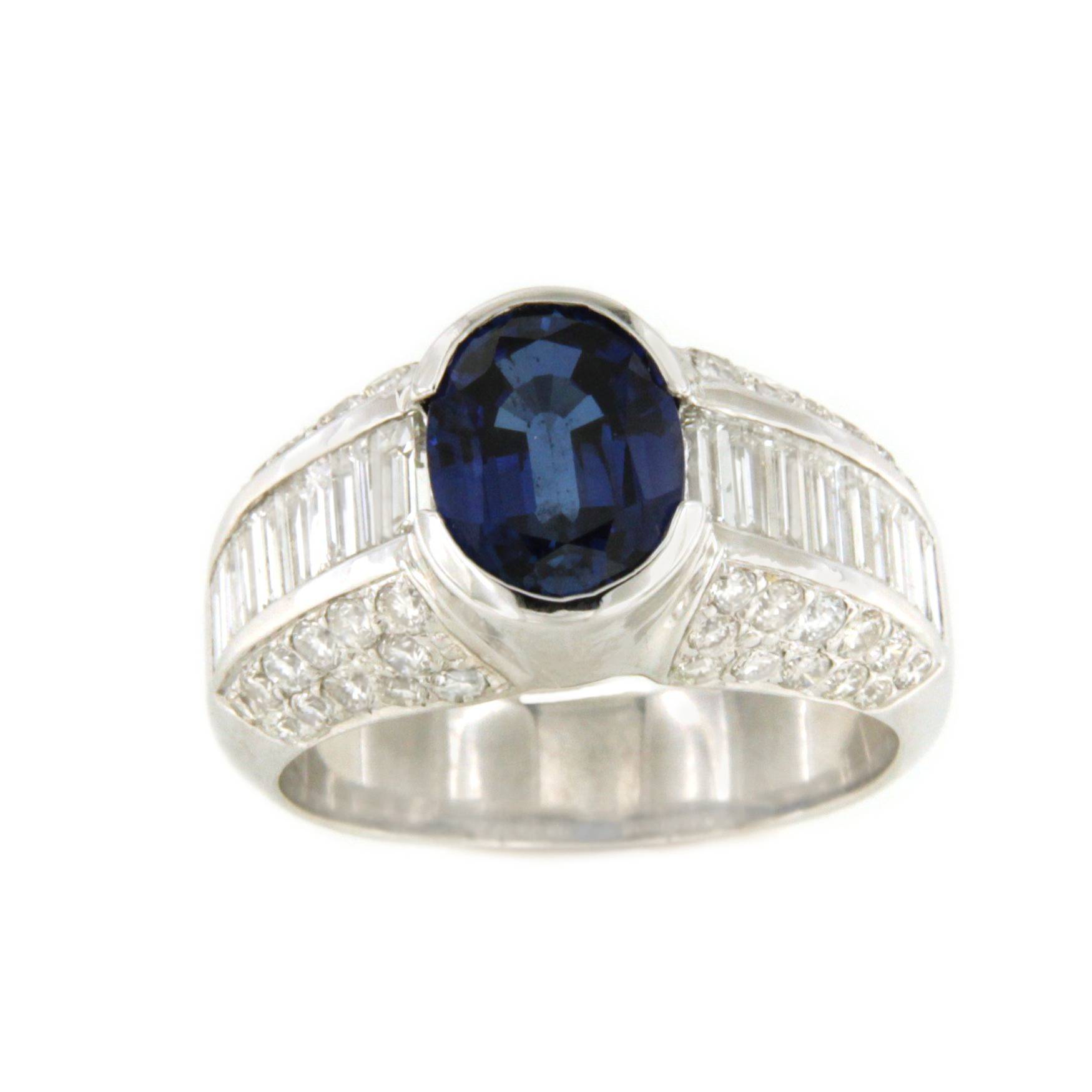 Precious gem: 1 oval sapphire with treatment 2.75 carats and 64 baguette cut diamonds and brilliants totaling 2.04 carats.