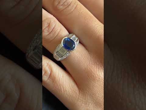 REIMS , a stunning sapphire ring with baguette-cut bands and diamonds along the sides of the bands. It is crafted in 18-karat white gold. Spectacular!