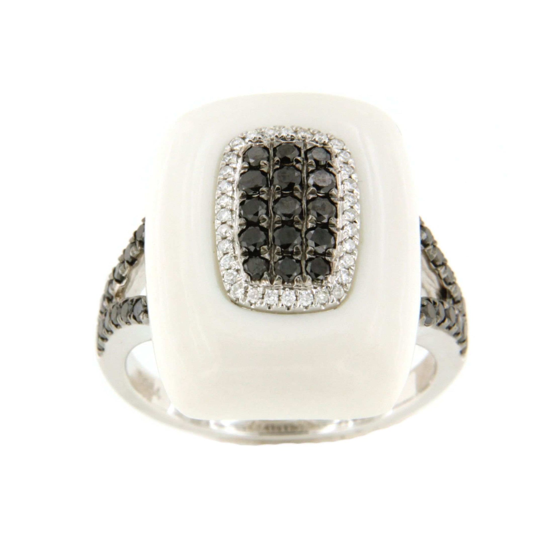 REINOSA , is an 18-karat white ring with white agate , rounded rectangular shape with a center of brilliant cut white and black diamonds also on the arms.