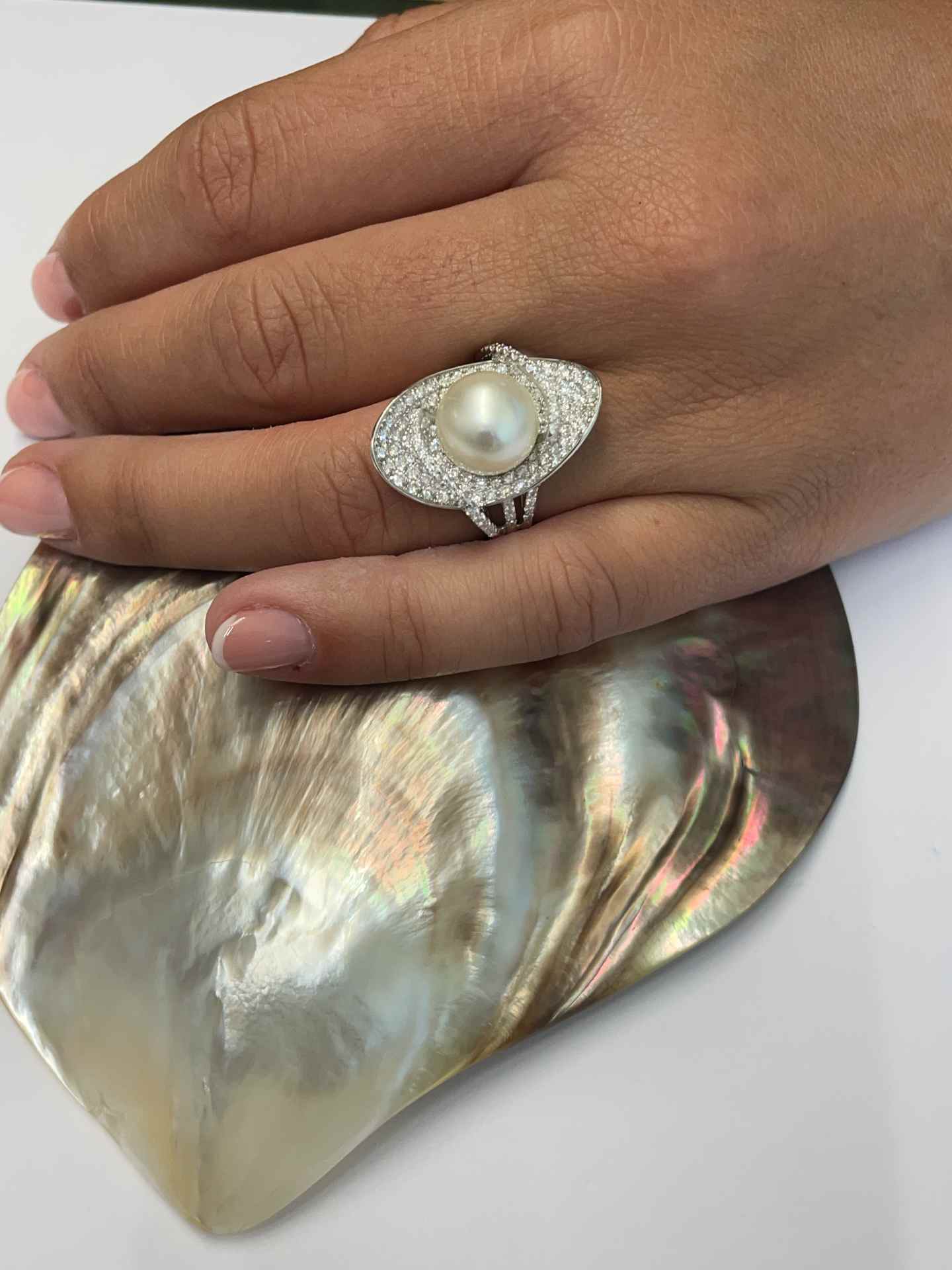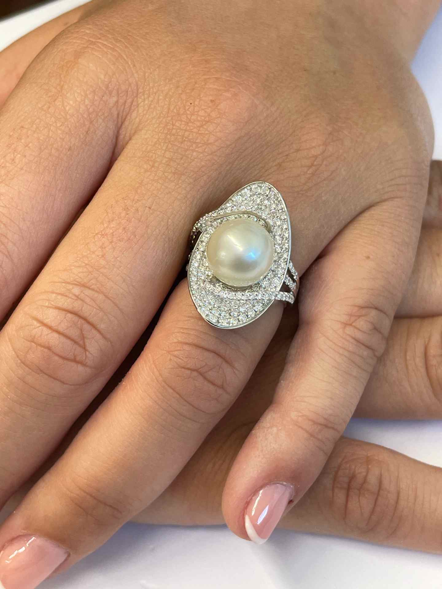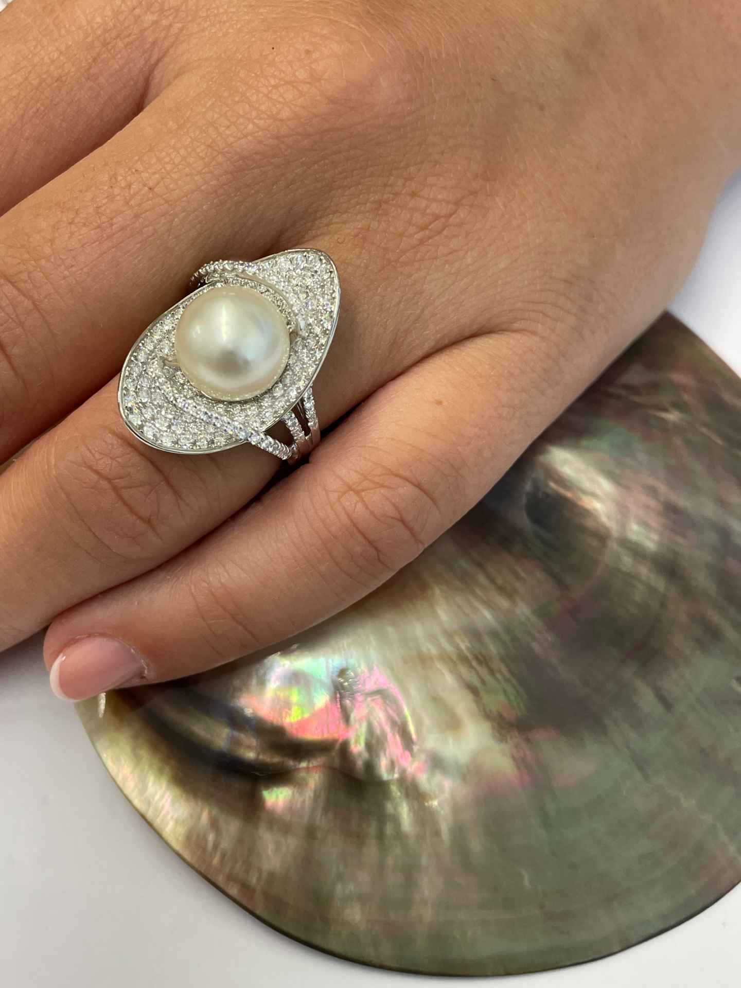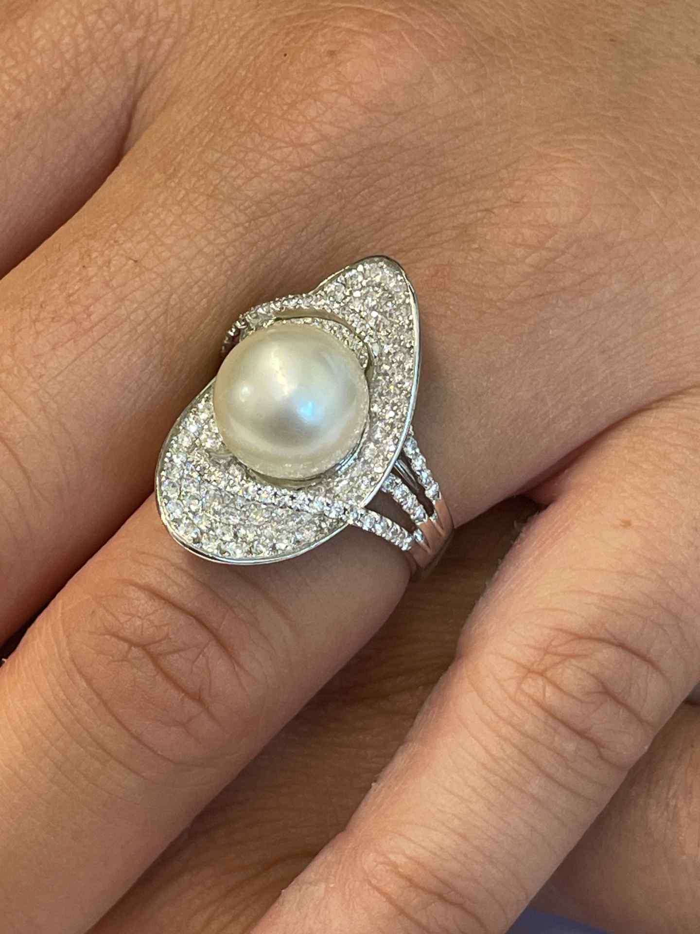 RIPOLLET is a ring featuring an Australian pearl set in a concave base with pavé-set brilliant-cut diamonds and bands overlapping the pearl, also set with brilliant-cut diamonds. It is crafted in 18-karat white gold.