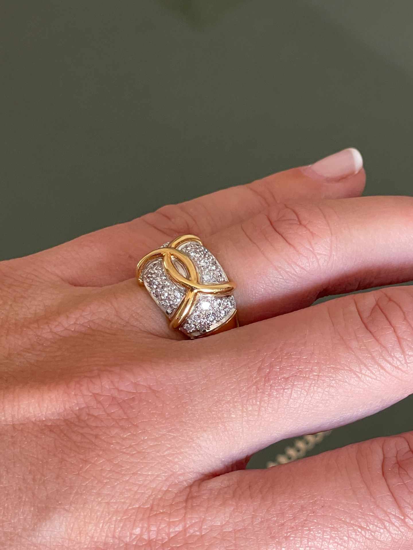 SINCERO is a very stylish 18k gold ring of Italian design, with two c-shaped gold ribs intertwined with diamonds in the center set in claws on white gold.