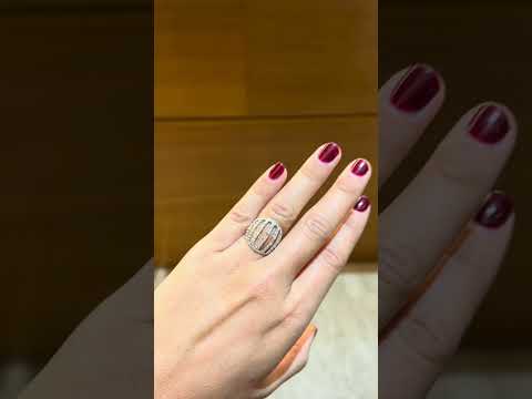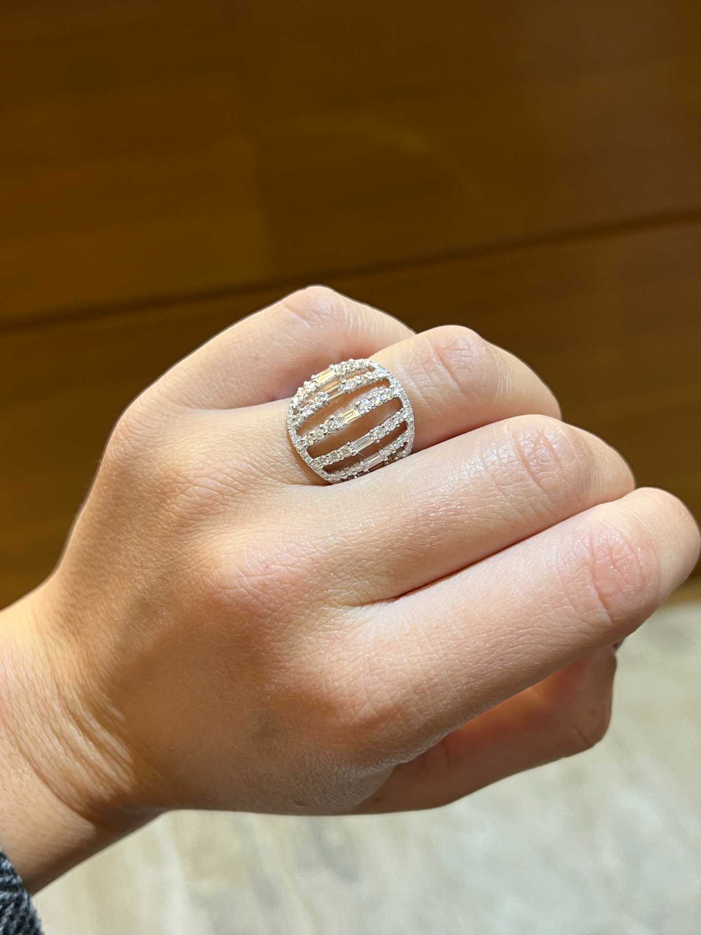 This is an openwork ring crafted in 18-karat white gold. It features vertical lines set with 80 brilliant-cut diamonds, totaling 1.15 carats. Additionally, each line is set with a baguette-cut diamond; there are a total of seven baguette diamonds weighing 0.49 carats. If your finger size differs from the one we suggest, simply contact us for assistance. The ring measures 2 cm in width.