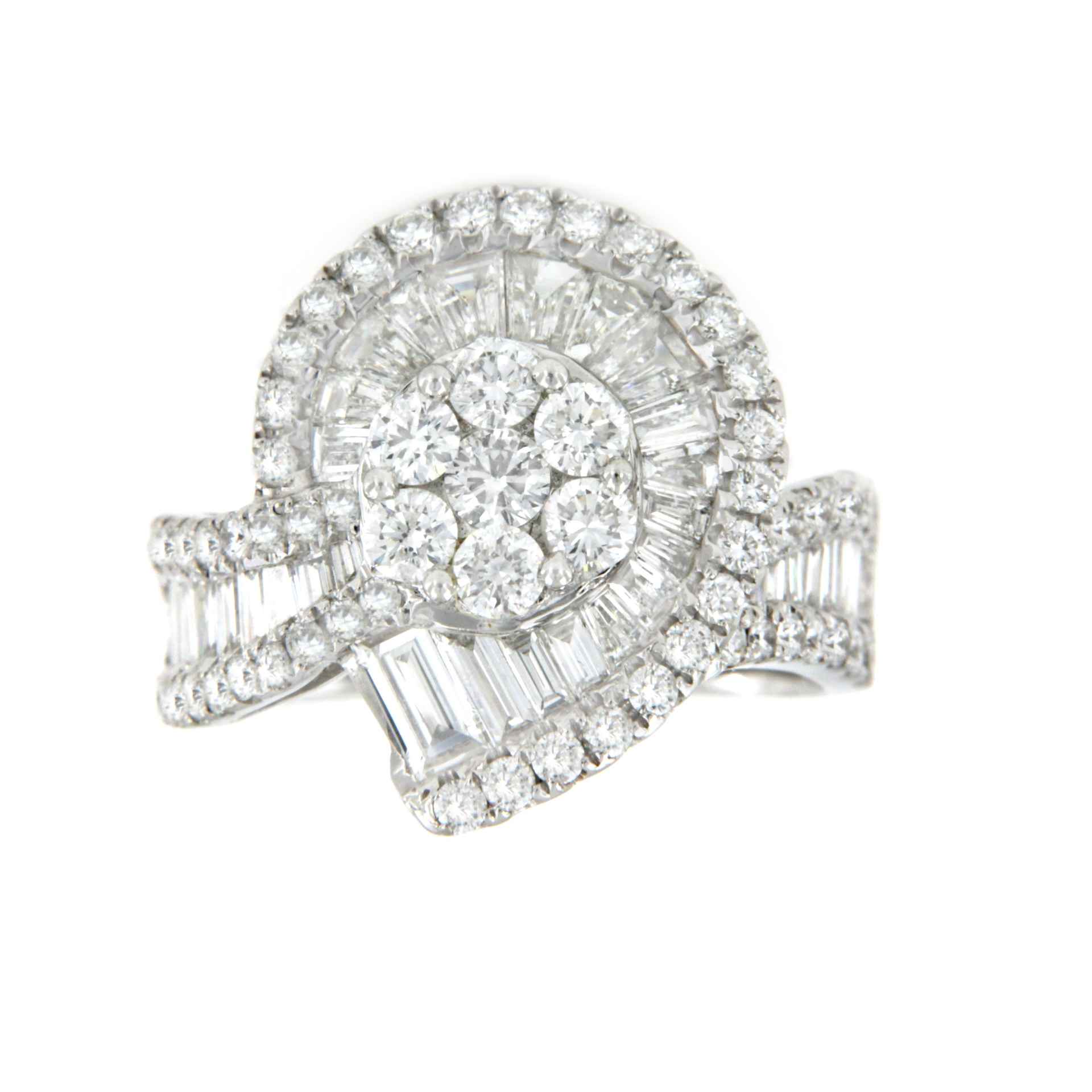 BOLZANO 18K white gold ring with 64 brilliant cut diamonds of 1.26 cts and 22 baguette cut diamonds of 0.68 cts. and 15 Taie cut diamonds of 0.63 cts.