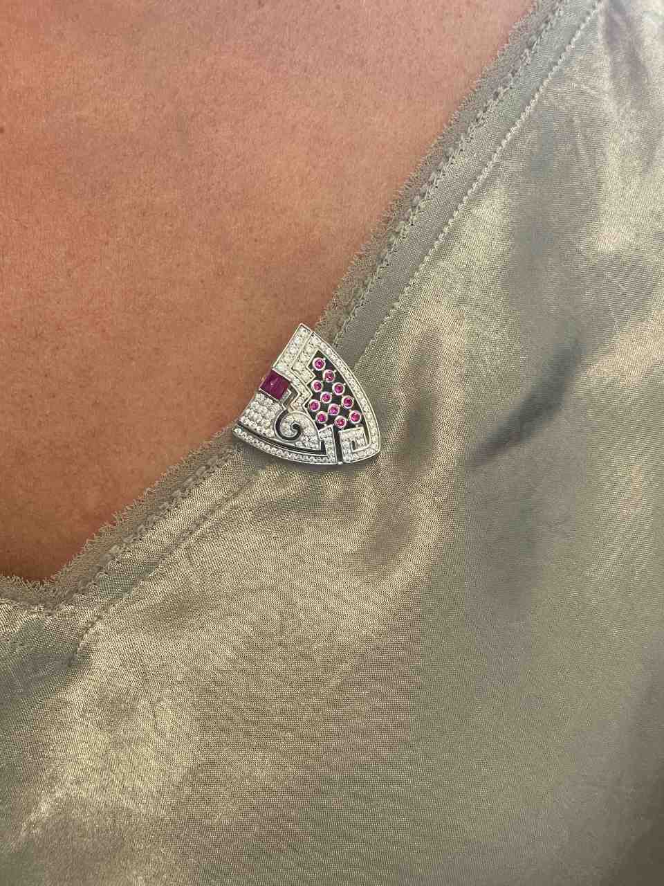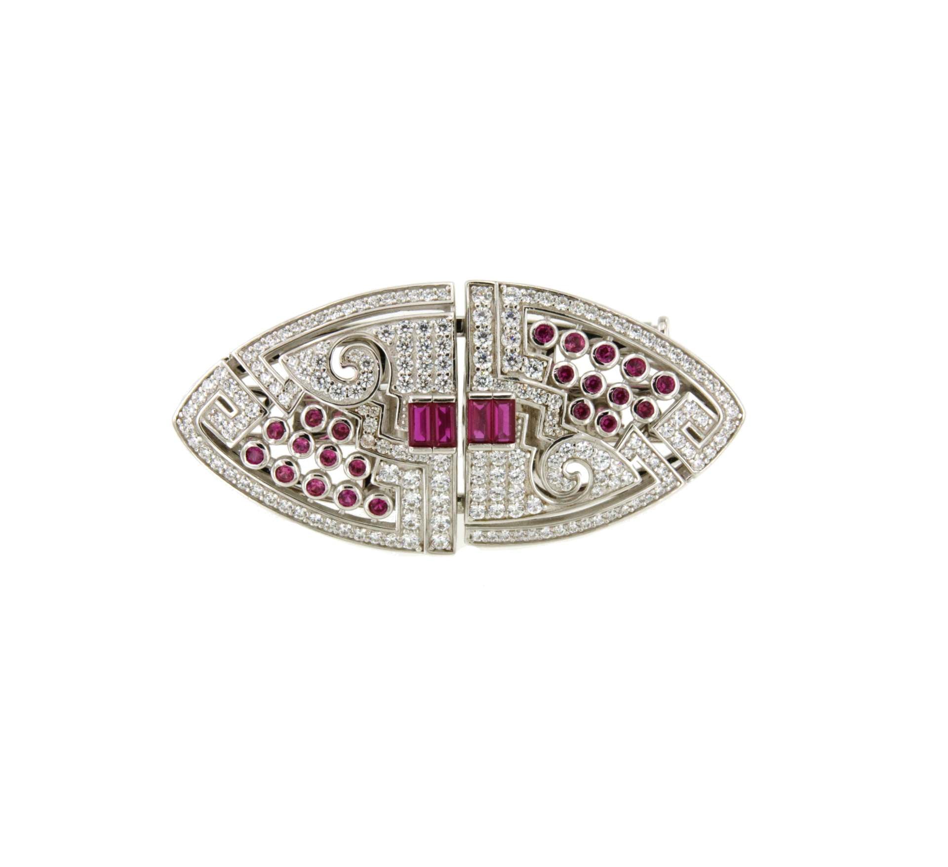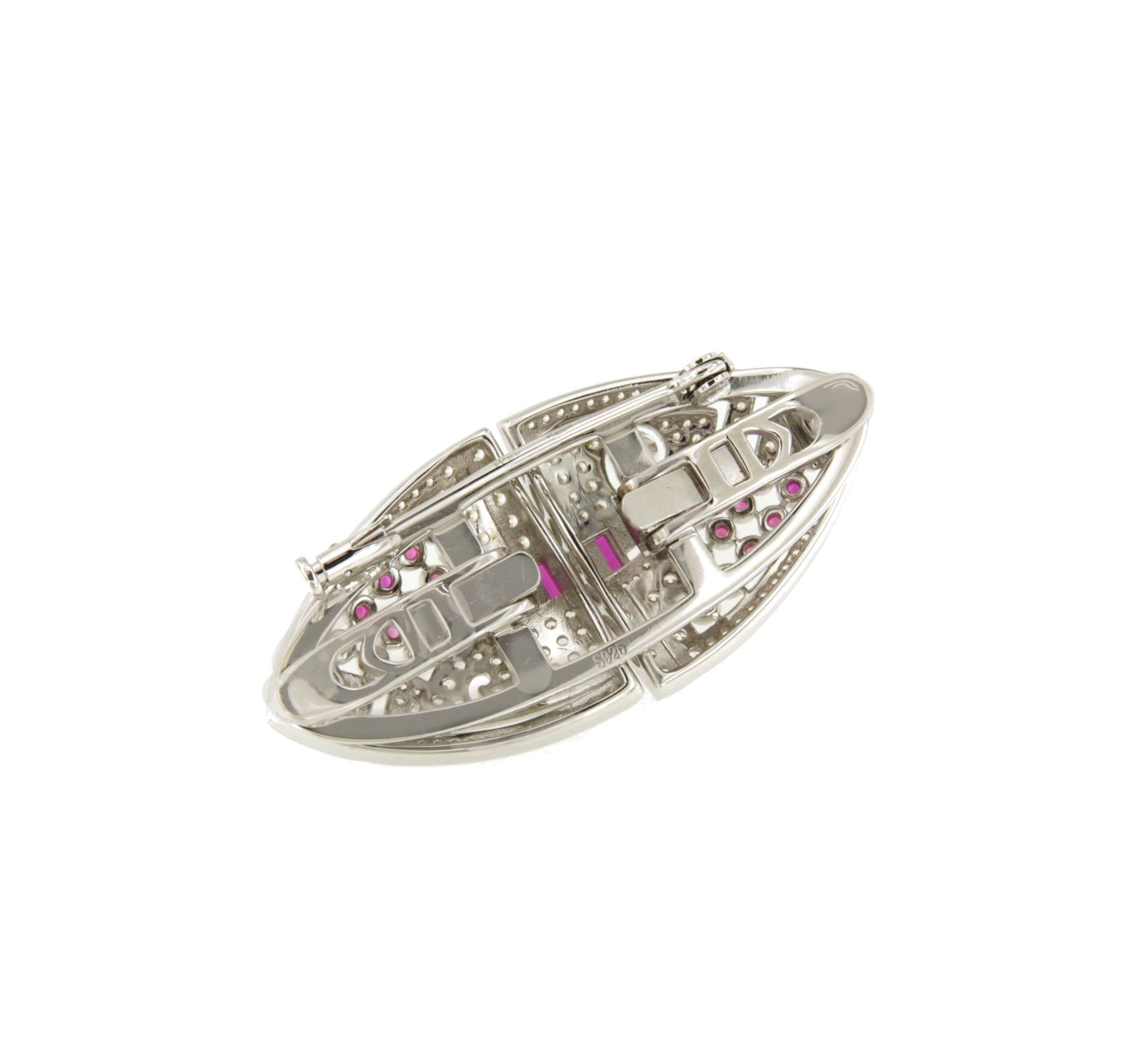 The detachable DUBAI brooch , crafted in sterling silver with white cubic zirconia and ruby-colored details, is an exceptional jewel for its versatility.