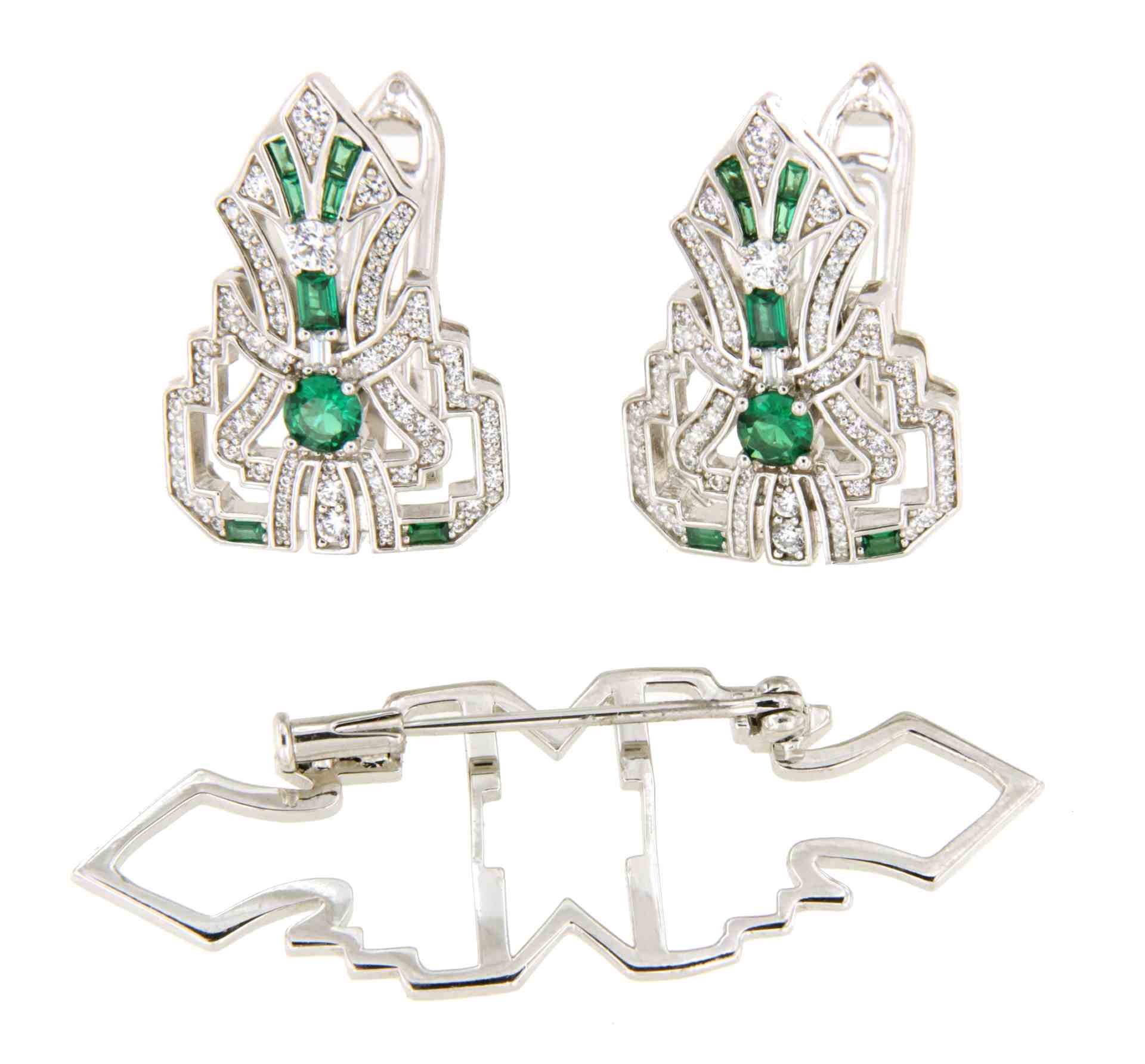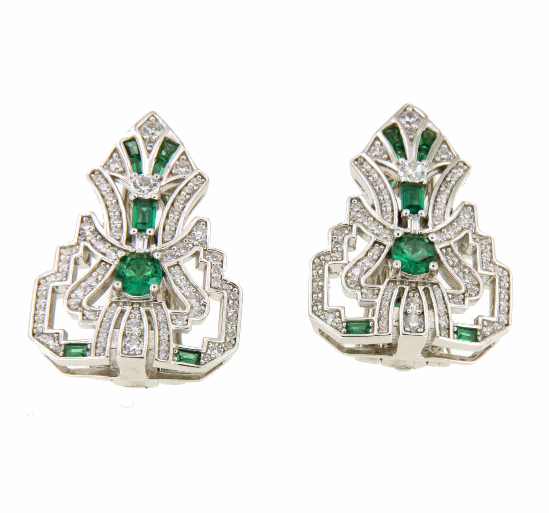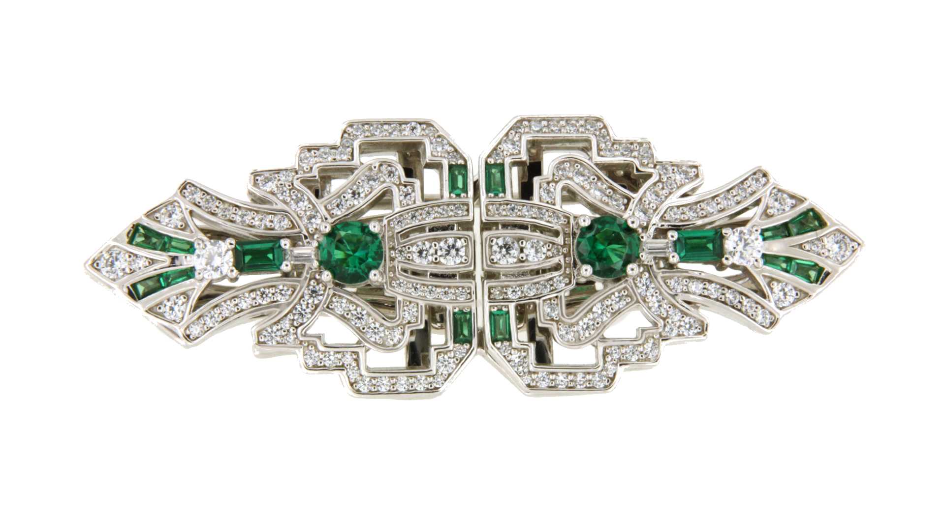 EMBLEMA is a wonderful original brooch in 925 sterling silver with cubic zirconia and green quartz, which can be disassembled into stud earrings to be put on using only the pressure of the omega.