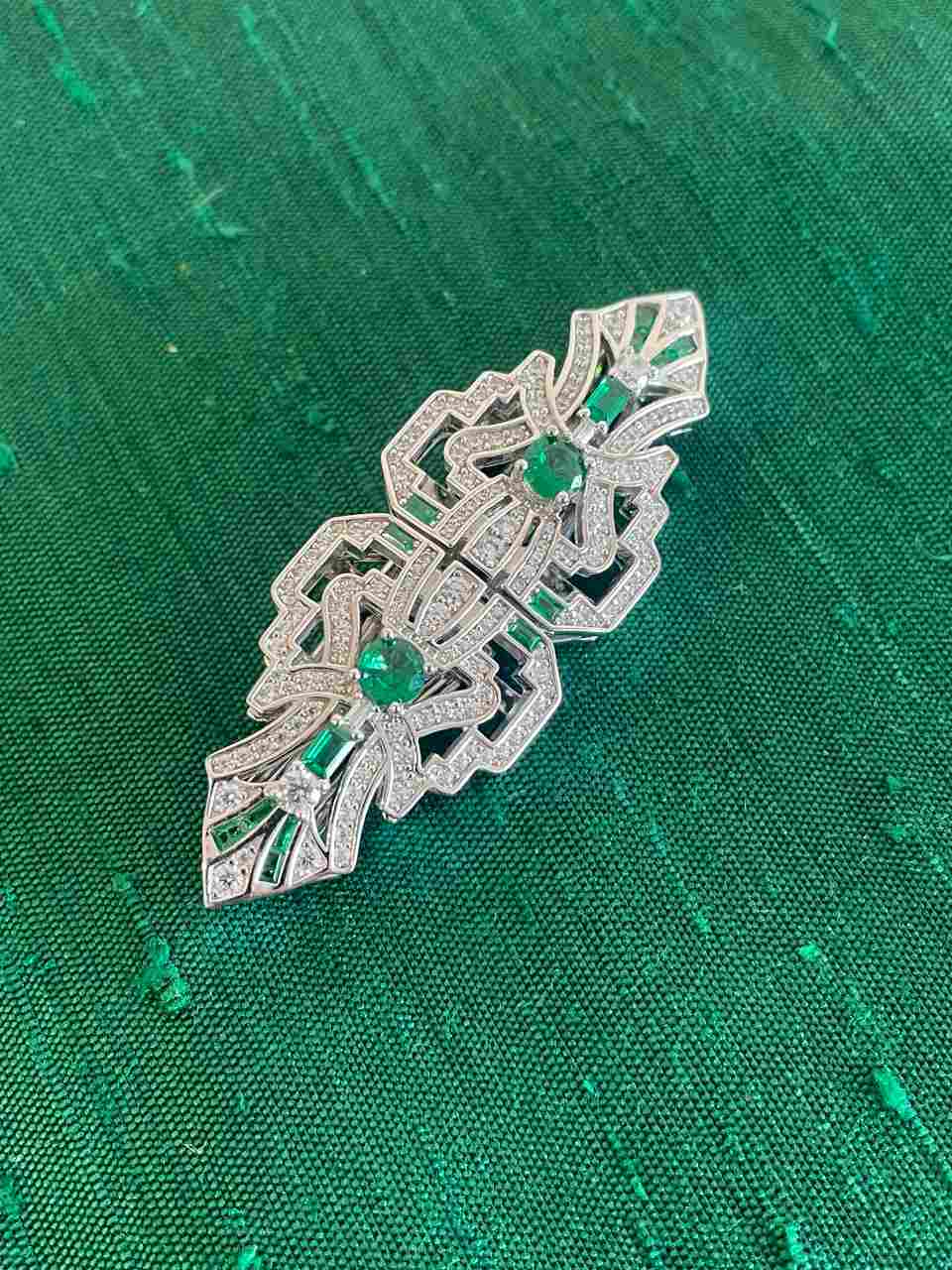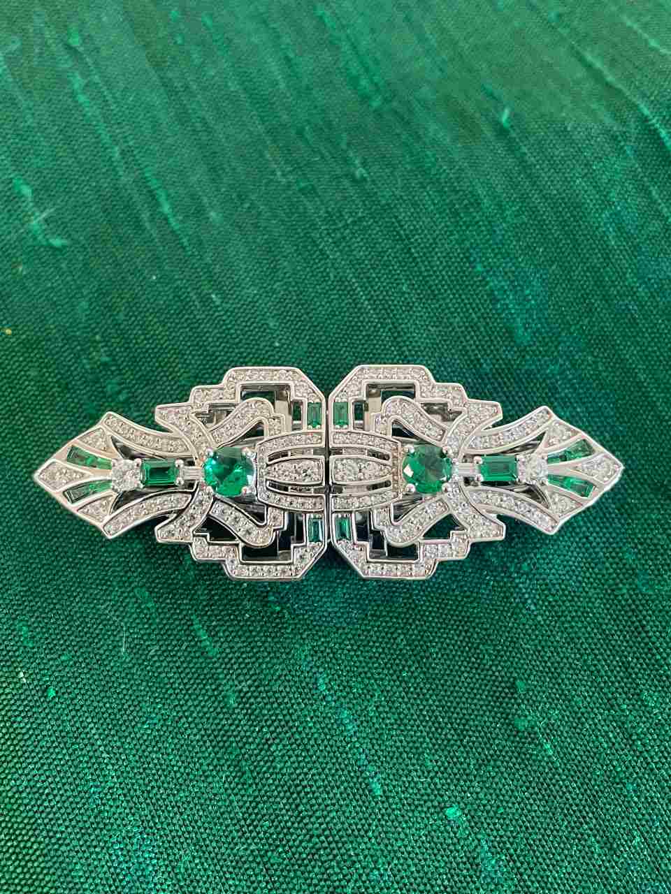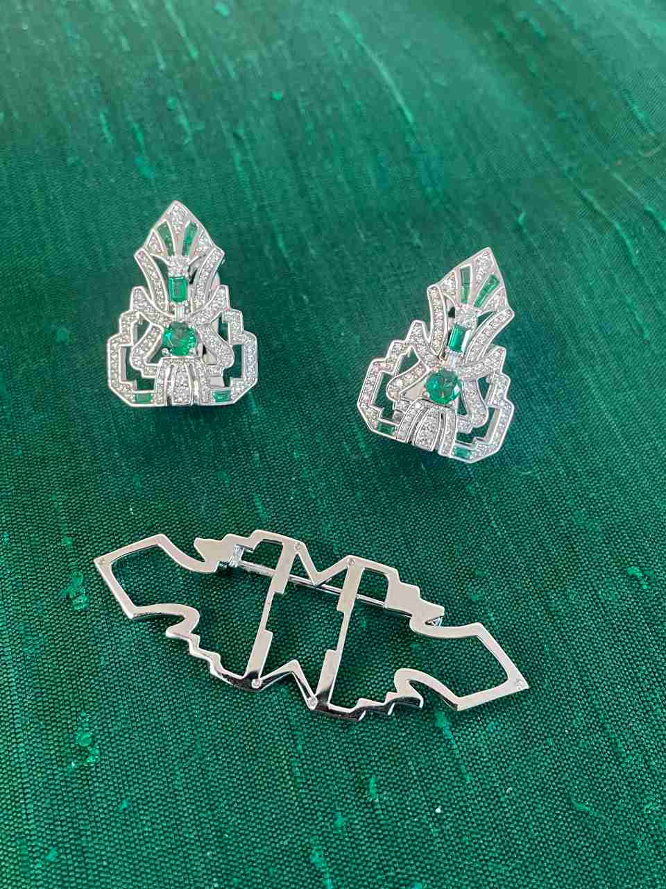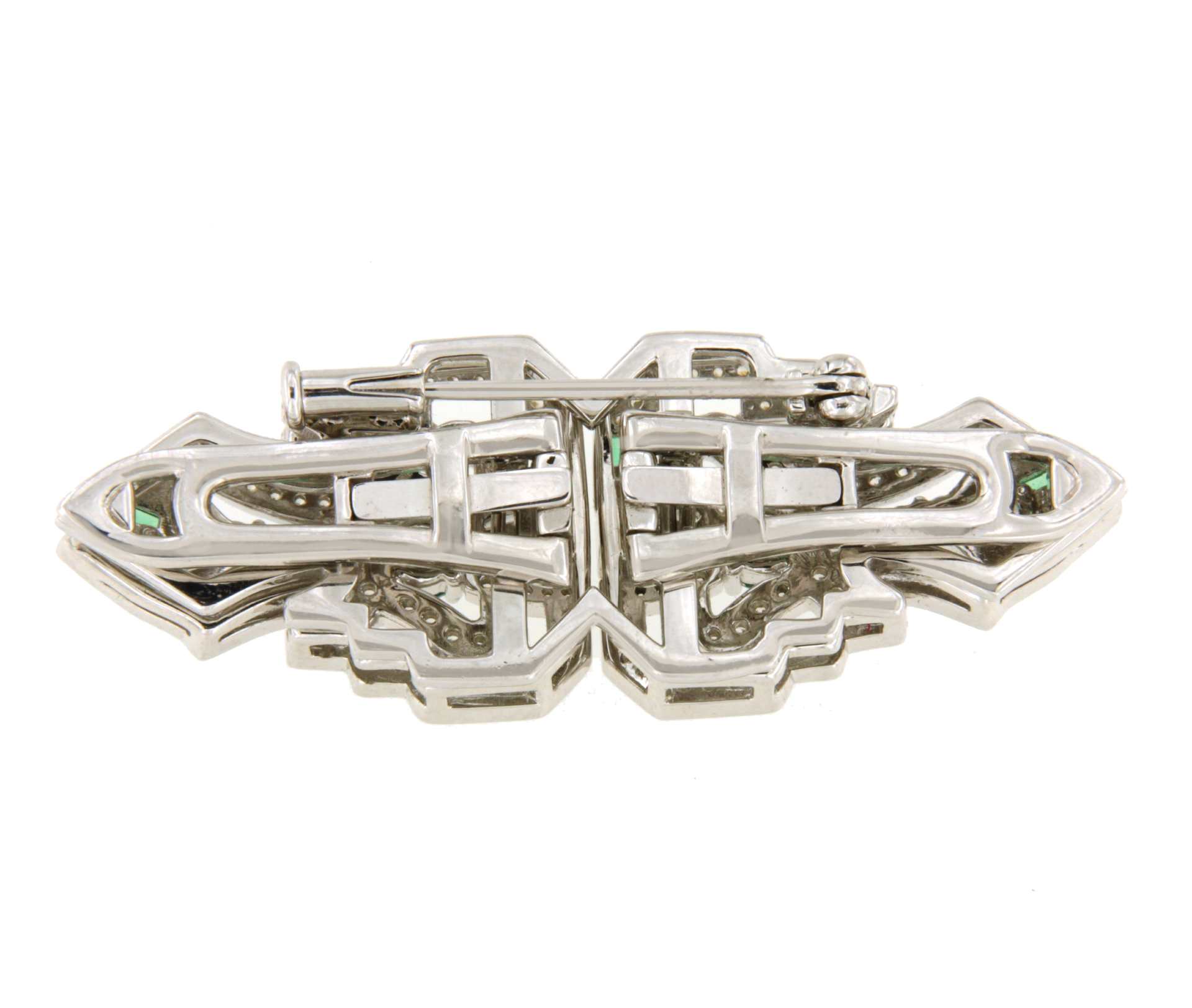 EMBLEMA is a wonderful original brooch in 925 sterling silver with cubic zirconia and green quartz, which can be disassembled into stud earrings to be put on using only the pressure of the omega.