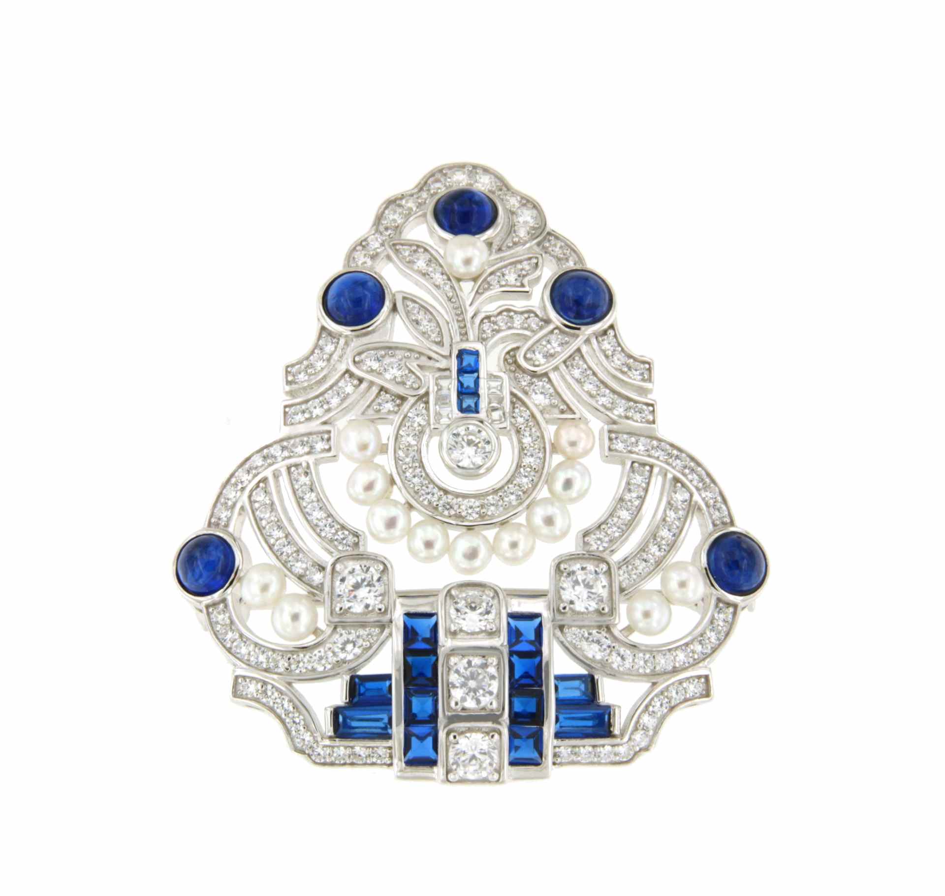 The GREECE brooch is a dazzling piece, crafted in sterling silver and adorned with white and blue sapphire-toned cubic zirconia. It also features delicate pearls that enhance its intricate and elegant design.