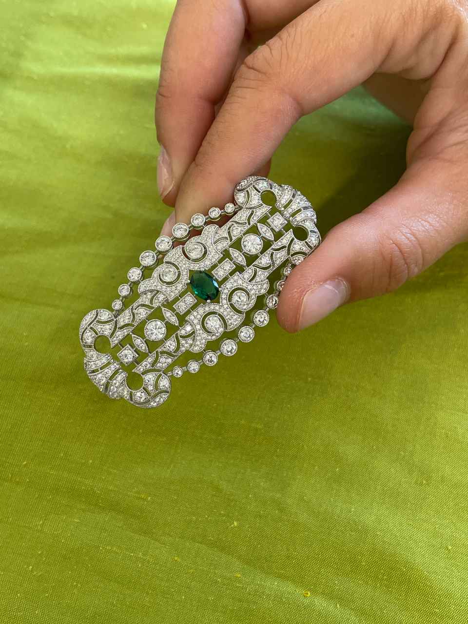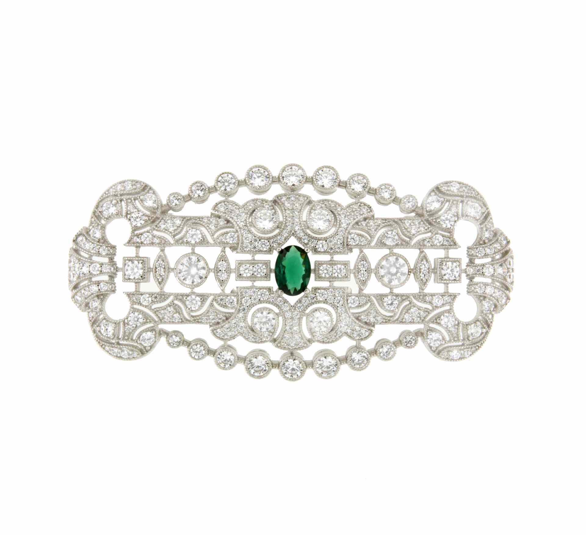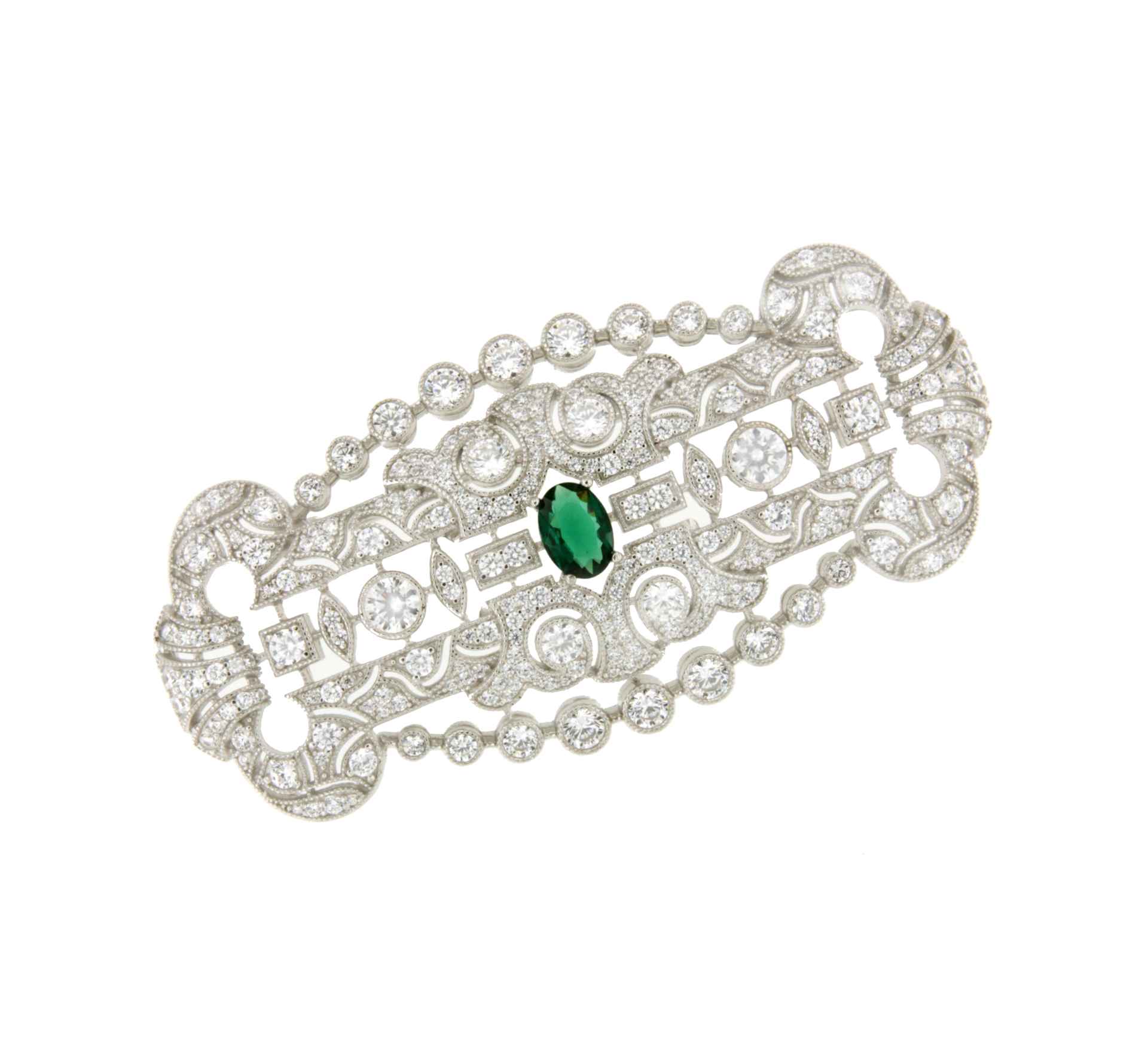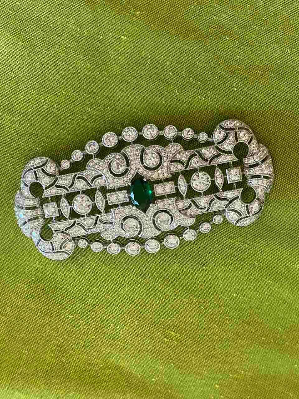 Wonderful LISBON art deco brooch in 925 sterling silver with emerald cubic zirconia